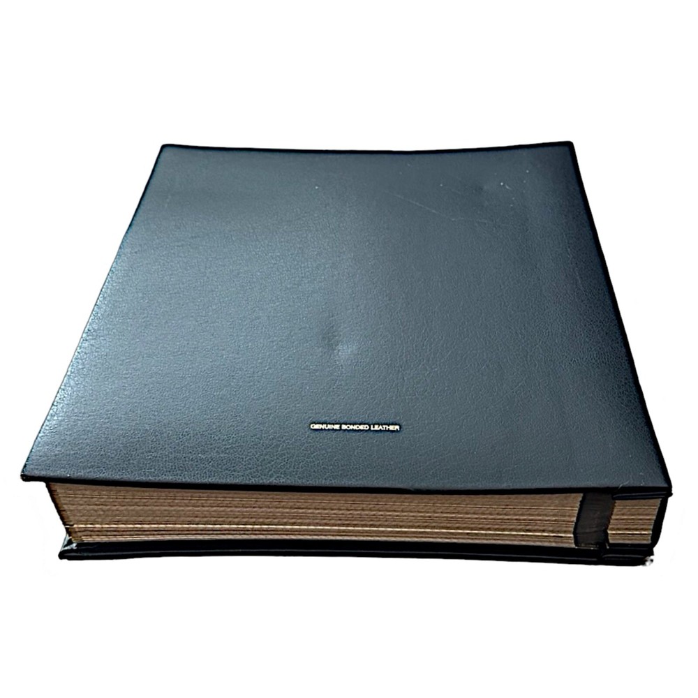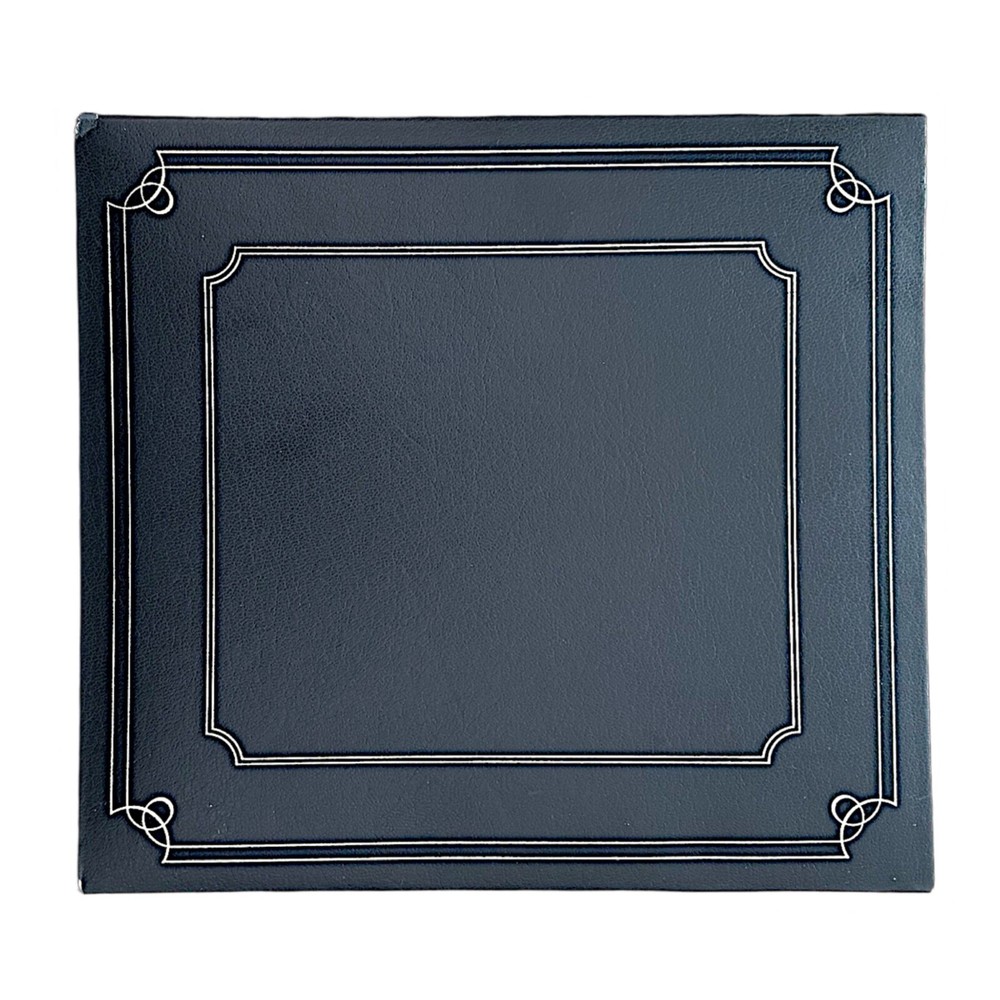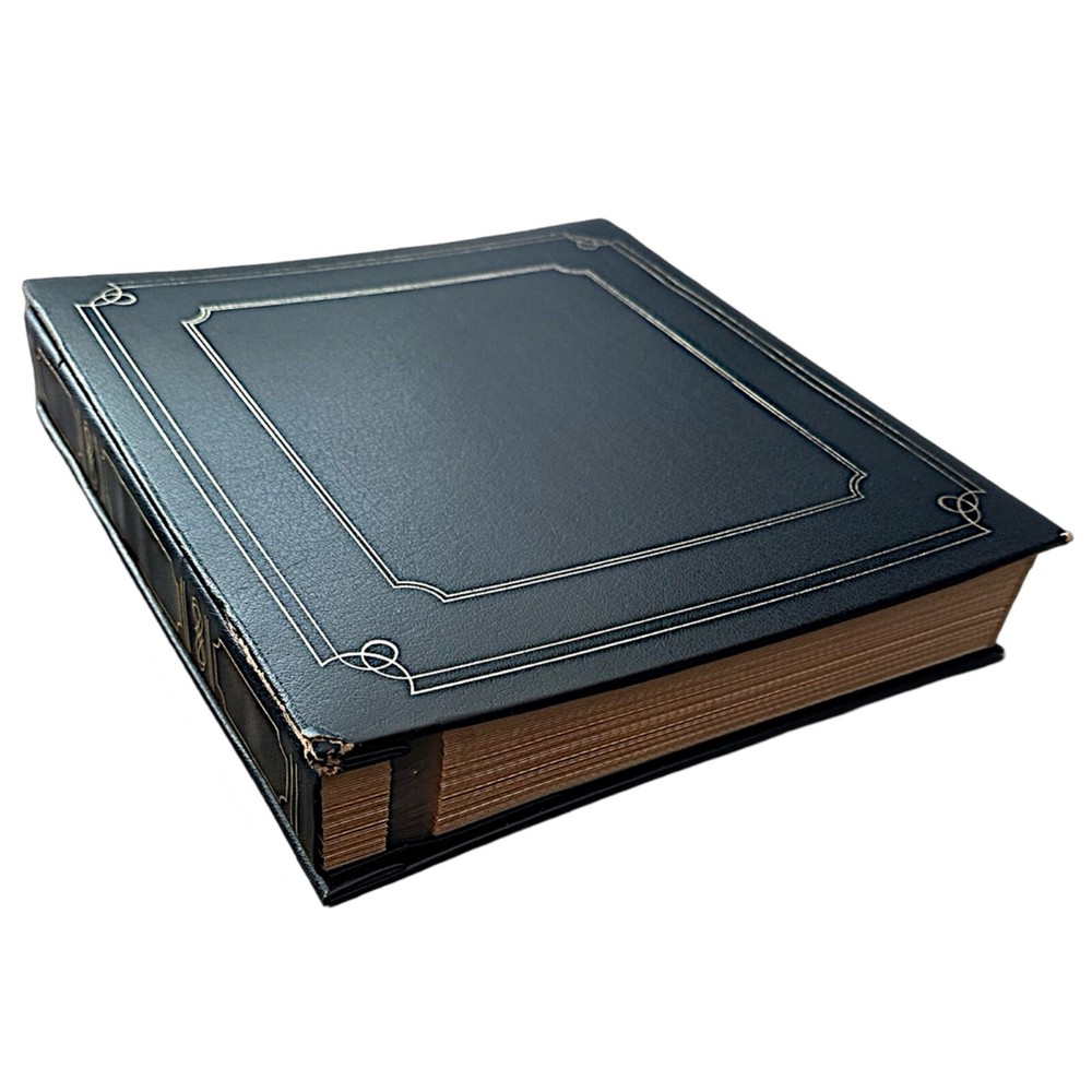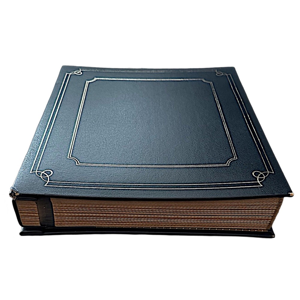navy blue cover with gold ornate details on the cover plastic sheet overlay genuine bonded leather cover 50 pages measurements approx: height 11.5”, width 10.5”, depth 2” heavy - weight 5.25 lbs vintage - made in Hong Kong pre-owned condition (new, unused with tears on one edge - easy fix) Verify size/measurements and contact me for any questions before you order. All measurements are approximate and are taken while laying flat. I will work with you to correct any problem. The item pictured is the one you will receive. Multiple purchases can be combined for shipping. Grateful if you follow my MODAVILLE store. I post regularly and ship fast.