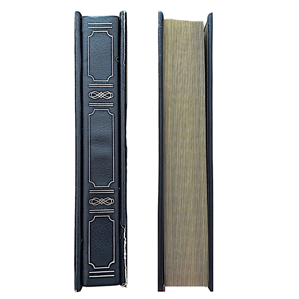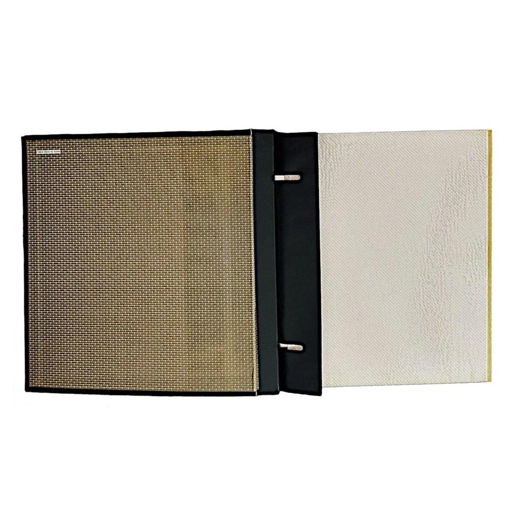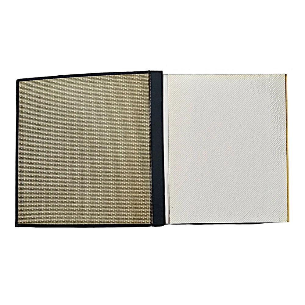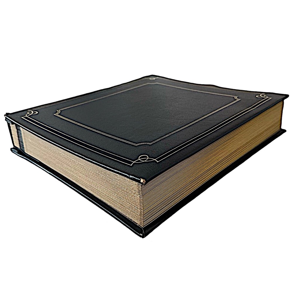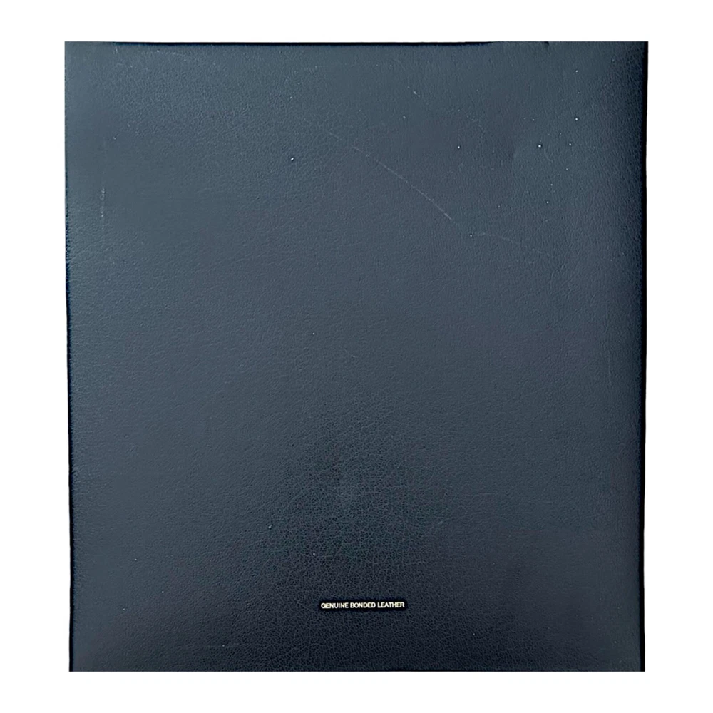 navy blue cover with gold ornate details on the cover plastic sheet overlay genuine bonded leather cover 50 pages measurements approx: height 11.5”, width 10.5”, depth 2” heavy - weight 5.25 lbs vintage - made in Hong Kong pre-owned condition (new, unused with tears on one edge - easy fix) Verify size/measurements and contact me for any questions before you order. All measurements are approximate and are taken while laying flat. I will work with you to correct any problem. The item pictured is the one you will receive. Multiple purchases can be combined for shipping. Grateful if you follow my MODAVILLE store. I post regularly and ship fast.