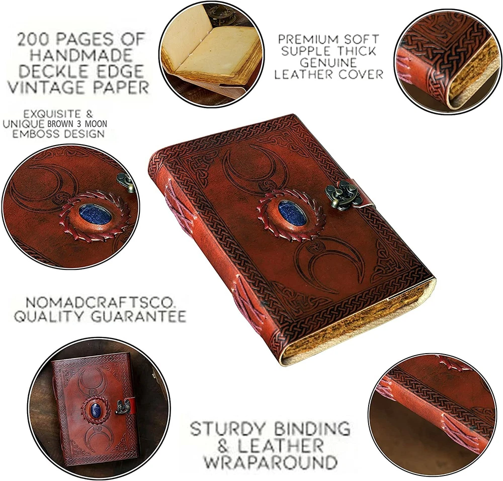 About this item QUALITY MEDIEVAL HANDMADE VINTAGE PAPER - Ancient looking rustic cotton paper combined with the beauty of distressed leather, hand-stitched by Artisans, creates a keepsake you will cherish forever. Makes a great gift for the men, women, and Wiccans in your life! 3 MOON EMBOSS DESIGN - Perfectly embossed with the 3 Moon designs, this journal makes a thoughtful gift to anyone of different cultures. The moon symbolizes firmness, strength, and power while the moon represents calmness, beauty, and nurturing. Unlined DECKLE EDE paper - 240 pages of thick, natural 115GSM craft paper. Perfect for use with many pen types. Thick paper prevents bleed through. Pages are Unlined with 5.5mm spacing. Note: Deckle Edge page count is 240 pages, 120 sheets. Tell your story : We designed this classic leather journal as a time capsule for your thoughts. Capture your important memories, accomplishments (and failures), life-changing moments and evolving dreams as a keepsake to reflect upon in years to come The Journal Is fantastic Made With leather use for leather journal WRITING JOURNAL BLANK JOURNAL FOR MEN AND WOMEN