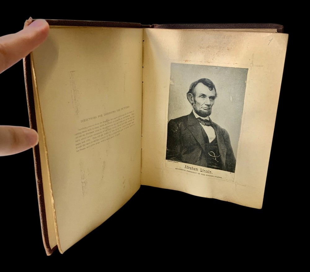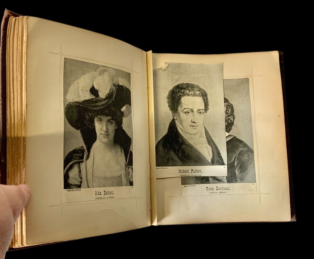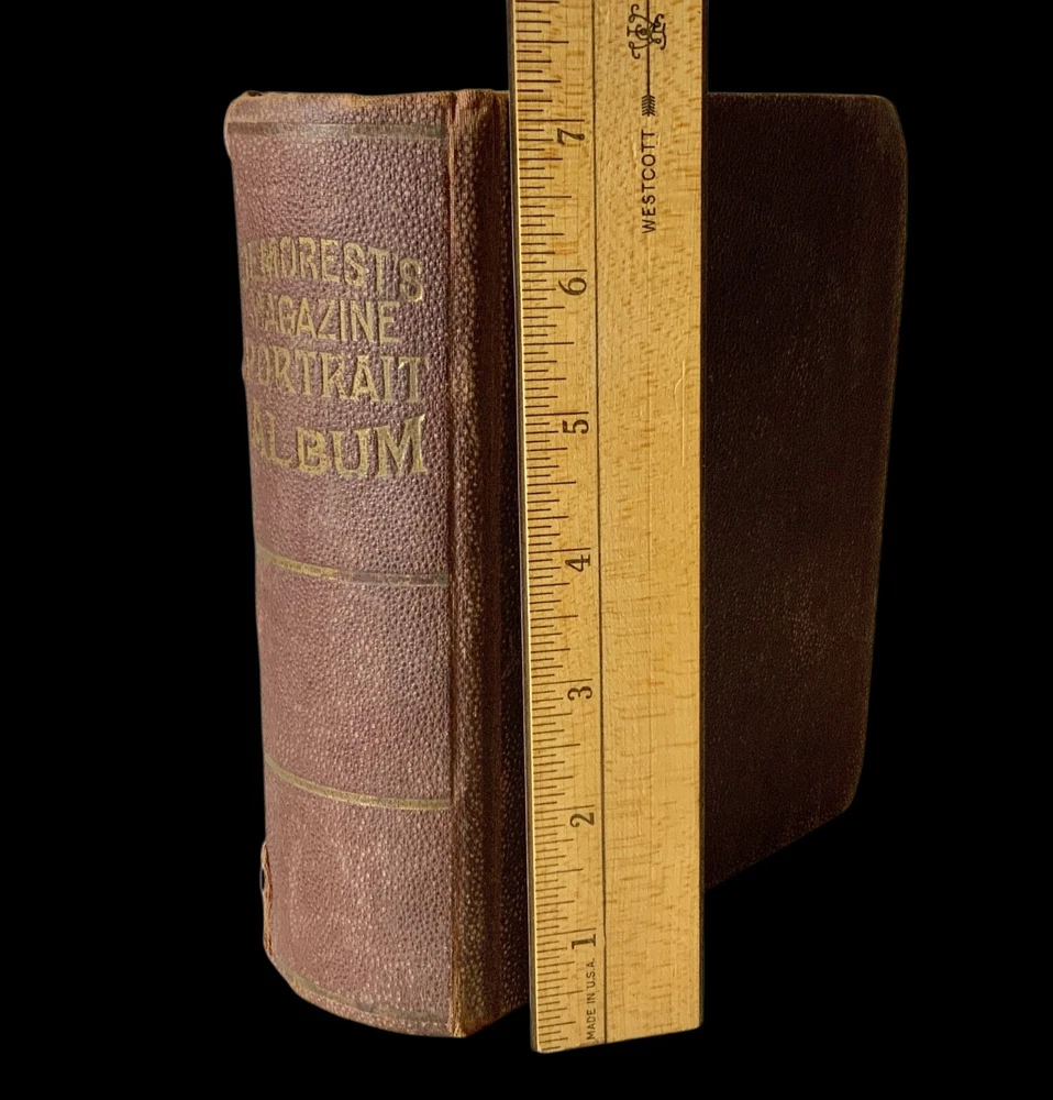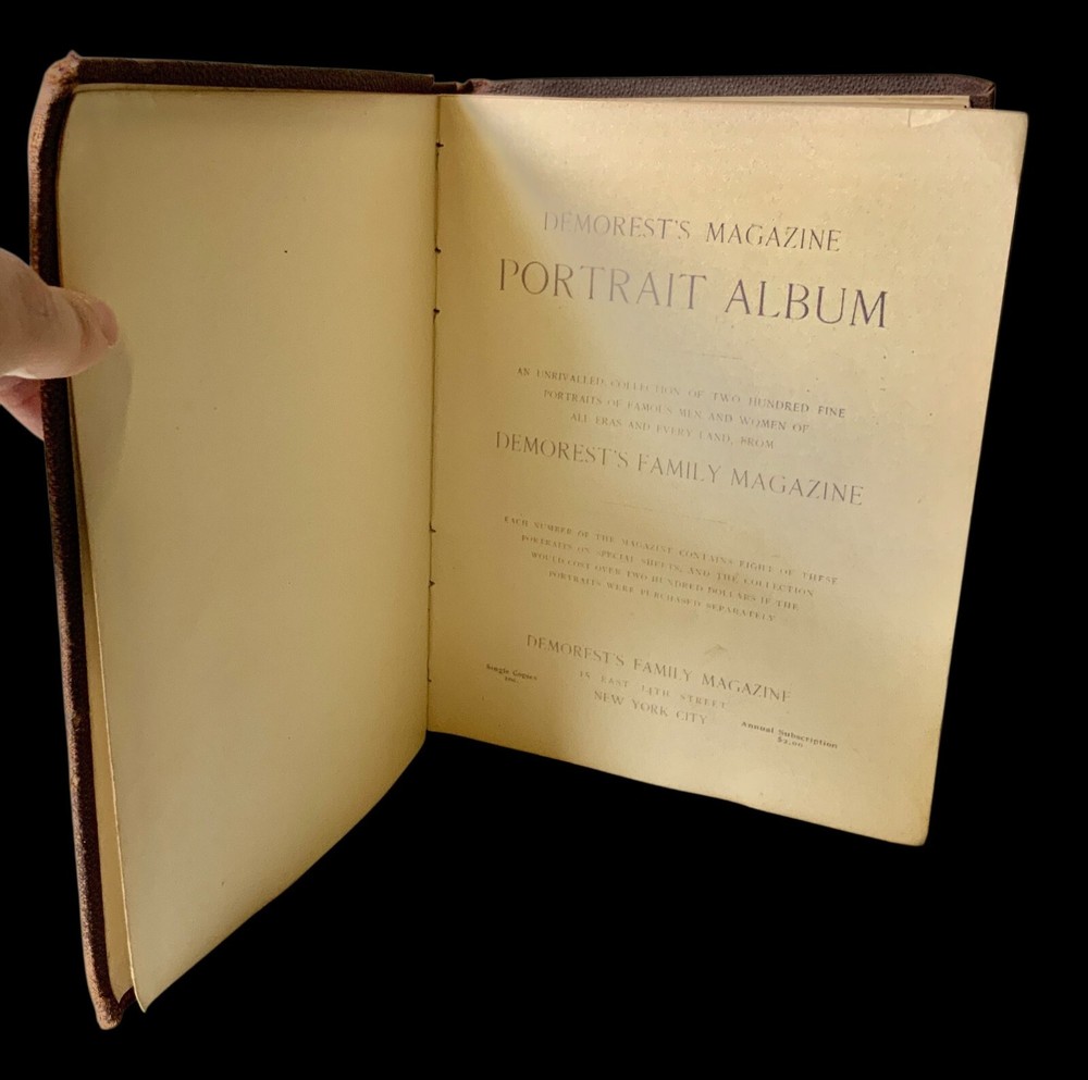 Estate Find - Antique Victorian Scrapbook Demorest’s Magazine Portrait Album. This book dates to the late 19th century and acts like a Victorian scrapbook, with images of famous people pasted onto each page. As stated at the beginning of the book, each magazine number of Demorest’s Magazine had eight portraits which could be cut out and pasted into this album. There are blank pages towards the end of the album, meaning that it is most likely not filled with the complete set of 200 portraits, but it is nonetheless an exciting book to peruse. The book is in good condition, with some stains and age spots. The binding is good, although the bottom of the spine is slightly loose. Please see photos for more details. Explore the past with the vintage Demorest's Magazine Portrait Album, a genuine piece of history. This hardcover collectible, bound in rich leather, captures the essence of a bygone era with its intricate design and classic appeal. Authored and published by Demorests, it stands as a testament to the historical value and artistic legacy of the period. Delve into the pages that speak volumes of the past, written in English and preserving the originality that has spanned decades. As a first edition, limited edition, or simply a cherished item for collectors of historical memorabilia, this book is a window into the history captured within its leather-bound walls.