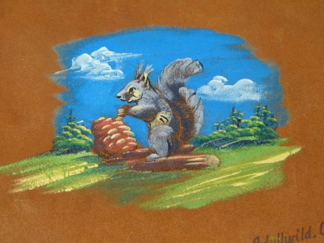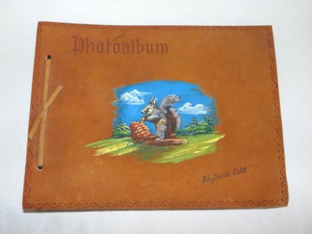 Vintage Hand Painted SQUIRREL Suede Leather PHOTO ALBUM, Idyllwild, Calif. Vintage Hand Painted SQUIRREL Suede Leather PHOTO ALBUM, Idyllwild, Calif. Click images to enlarge Description VINTAGE PHOTO ALBUM Vintage photo album or scrapbook measuring about 11-1/4" wide by 8-1/2" deep. Featuring soft suede leather covers, front is hand decorated with a squirrel or chipmunk and pine cone - marked IDYLLWILD, CALIF. Holding numerous black stock paper pages and a few front lined pages for holding autographs and similar, album is bound with the original leather tie as shown, accented with a printed border on the front cover. I believe this dates to the 1940s or possibly a bit earlier. Condition is very nice - it has never been used, and paper is without residue or corner mounts - the first few lined paper pages are very fragile with tiny tears, point loss, tanning and wear from age - that's all I can find. Think this is a wonderful vintage souvenir from a trip to this idyllic vacation spot - lovely addition to any home, collection or display! If questions, please contact me - thanks! Images sell! Get Supersized Images & Free Image Hosting Create your brand with Auctiva's Customizable Templates. Attention Sellers - Get Templates Image Hosting, Scheduling at Auctiva.com.