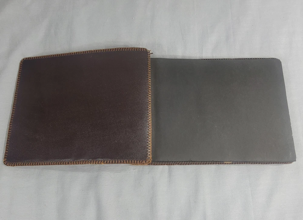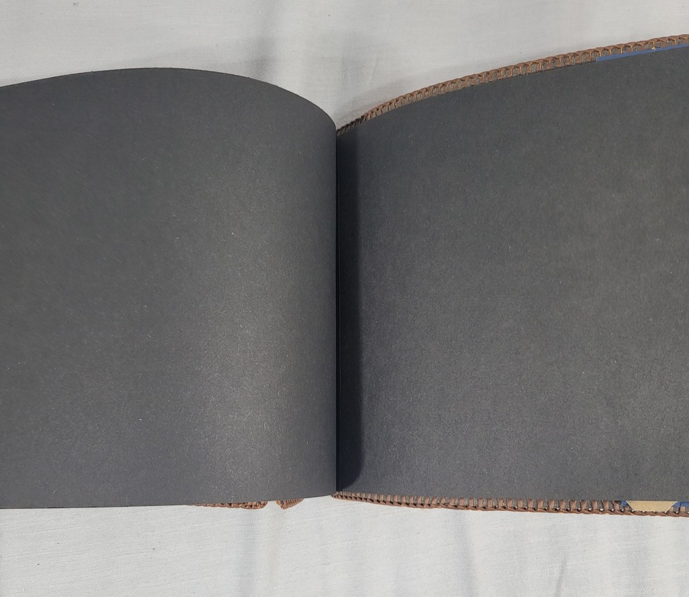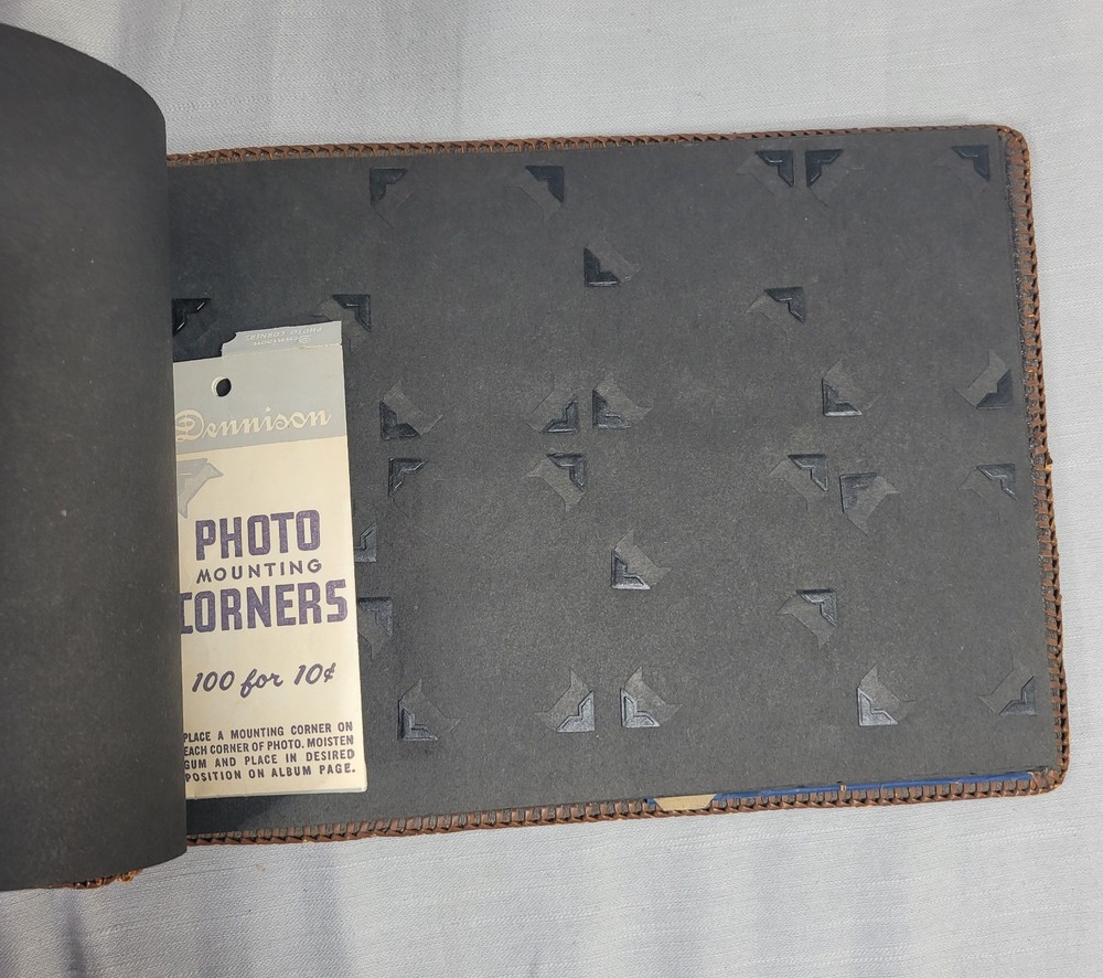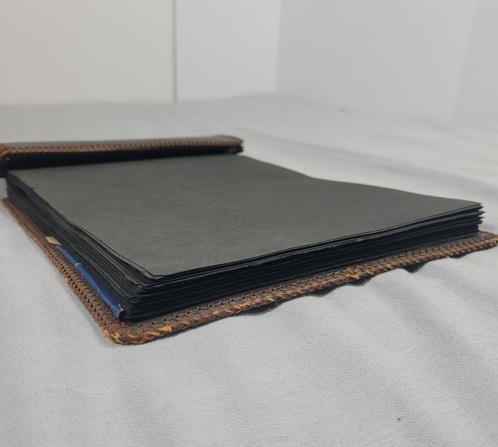 This beautiful leather album has woven edging and pretty floral pattern on the cover. Some wear damage on edging, as seen in pictures. Comes with the pack of picture corners....