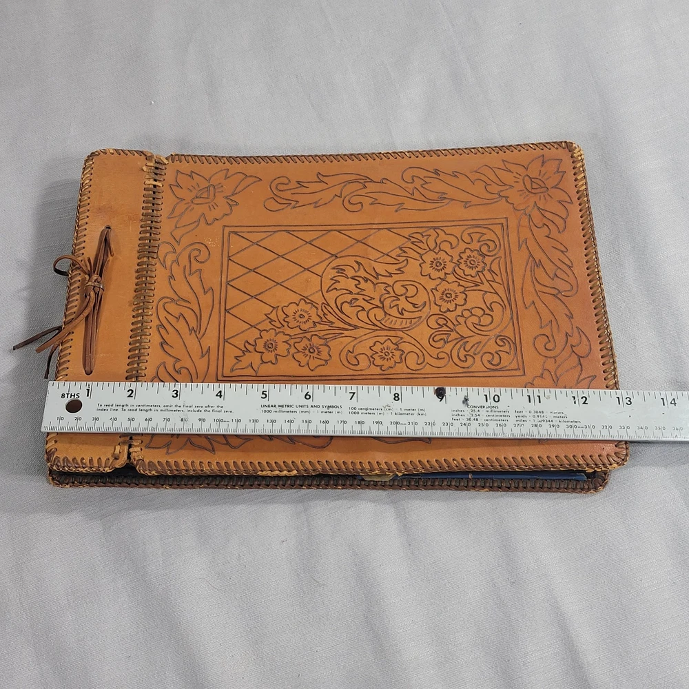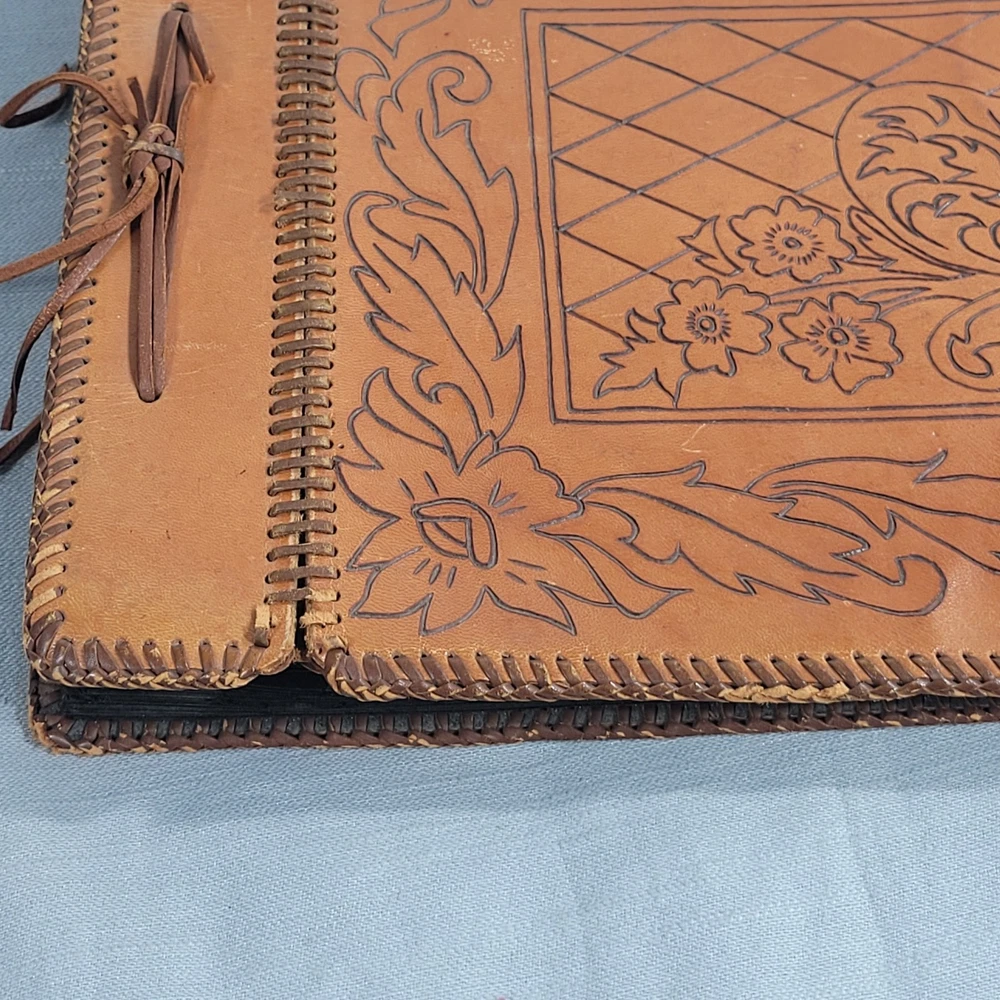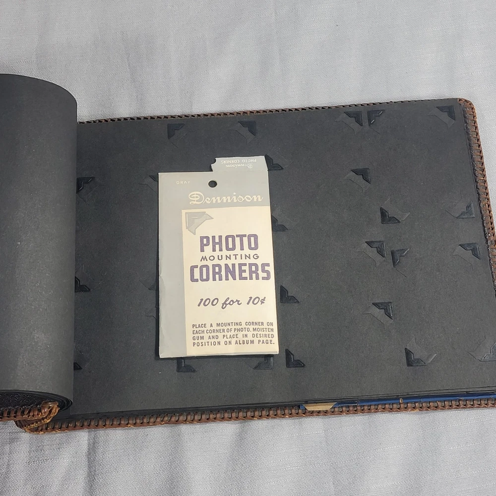 This beautiful leather album has woven edging and pretty floral pattern on the cover. Some wear damage on edging, as seen in pictures. Comes with the pack of picture corners.