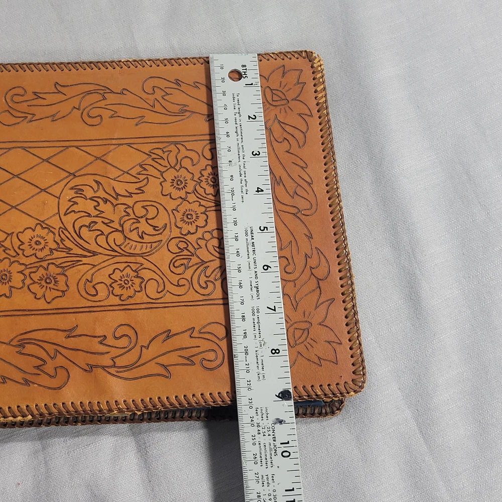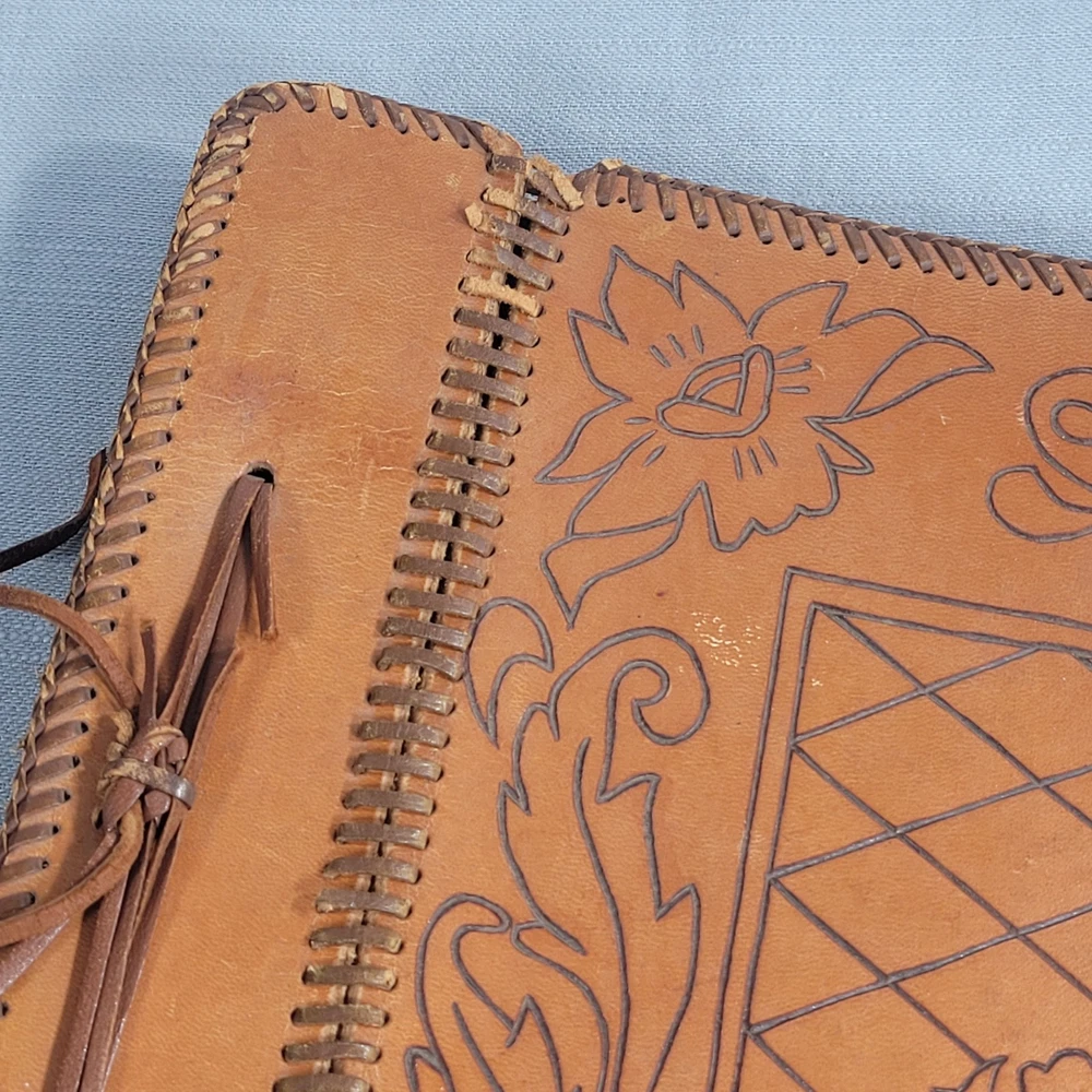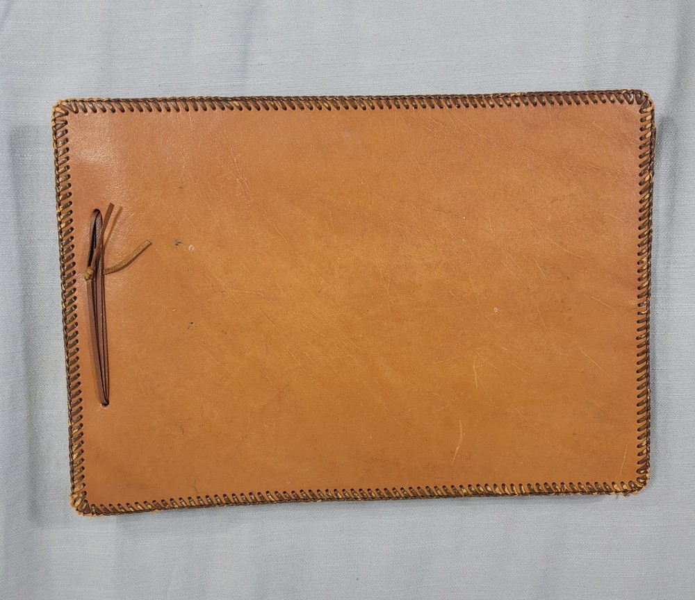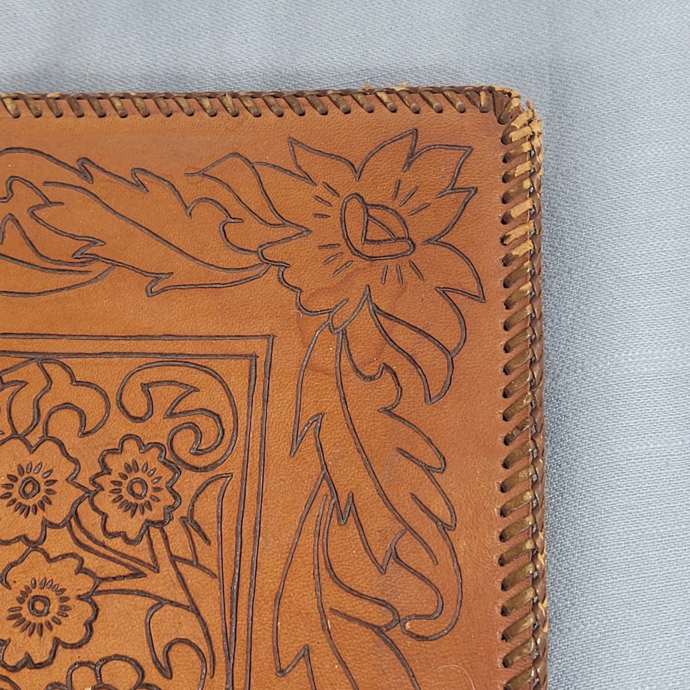 This beautiful leather album has woven edging and pretty floral pattern on the cover. Some wear damage on edging, as seen in pictures. Comes with the pack of picture corners.