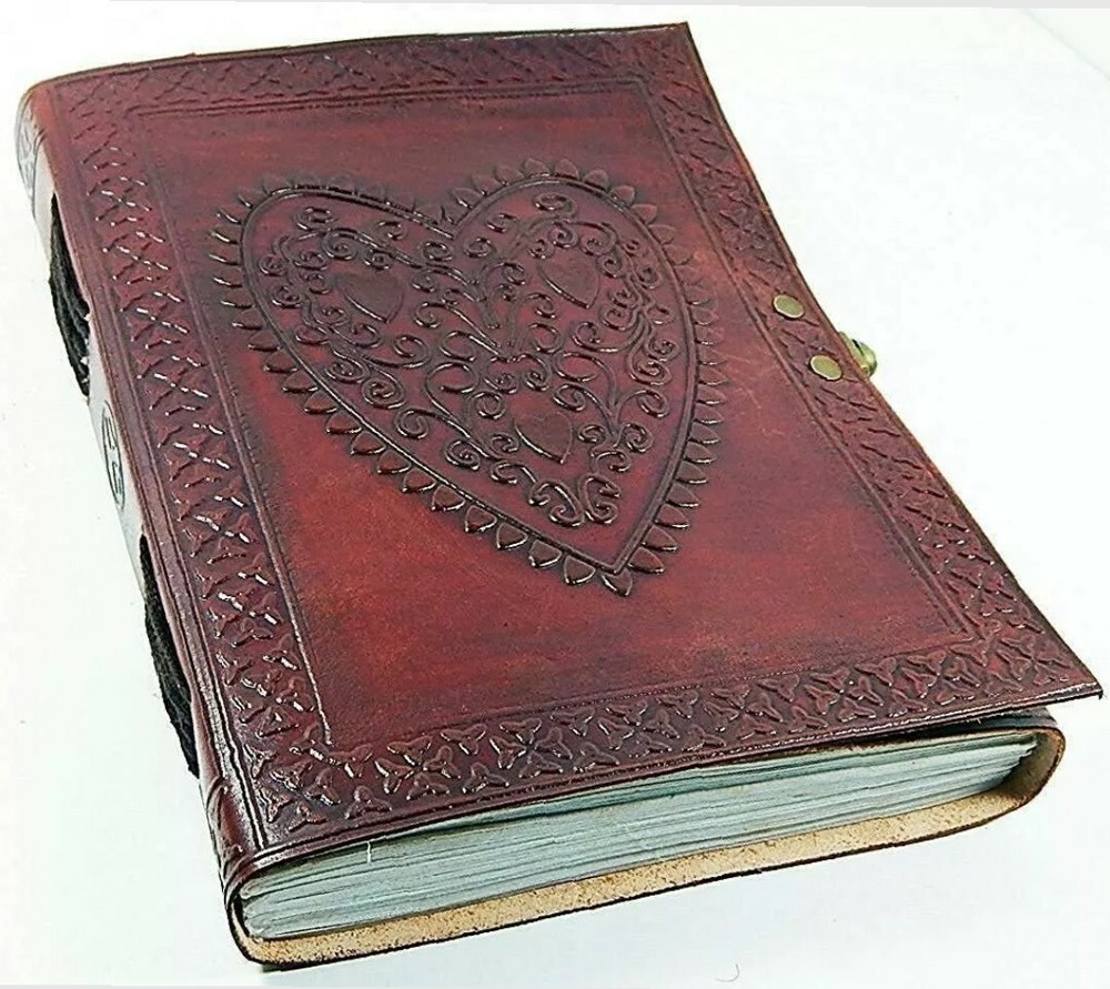 Beautiful vintage style genuine leather Bound embossed HEART cover Notebook , Journal , sketch or Photos has a metal lock on the side. Perfect travel Size 8x6. Shipped with USPS Priority Mail. Key Features: Handmade in India utilizing traditional craftsmanship and techniques which have been passed from generation to generation. Handmade from genuine leather with a smooth skin texture, a smart design with a metal locking or latching mechanism on the side. Handmade, Fair Trade & Eco Friendly.Perfect to use as a journal, scrap book or diary. Dimensions: 8" x 6"