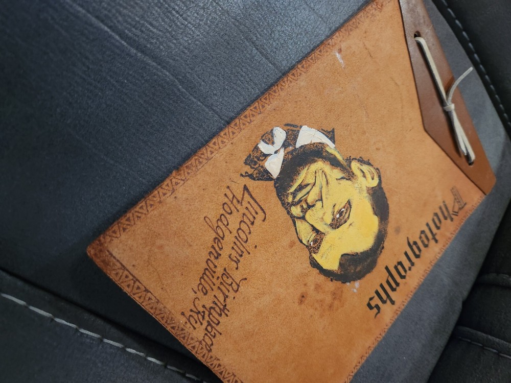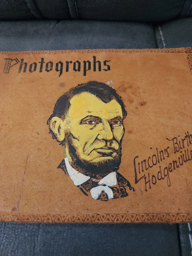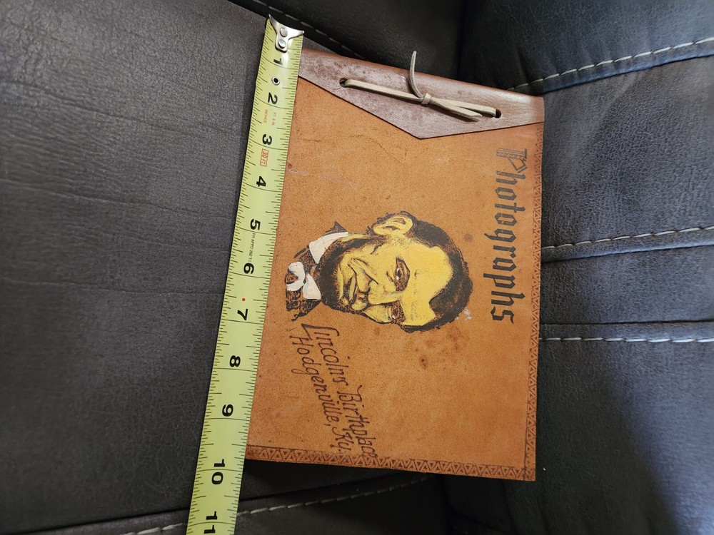 This is a old photo album with 12 double sided unused pages. It's in great condition. The cover is leather and may have been hand painted. It measures about 9 1/2 inches wide and 7 inches tall . Just a cool little photo album. Thanks for looking