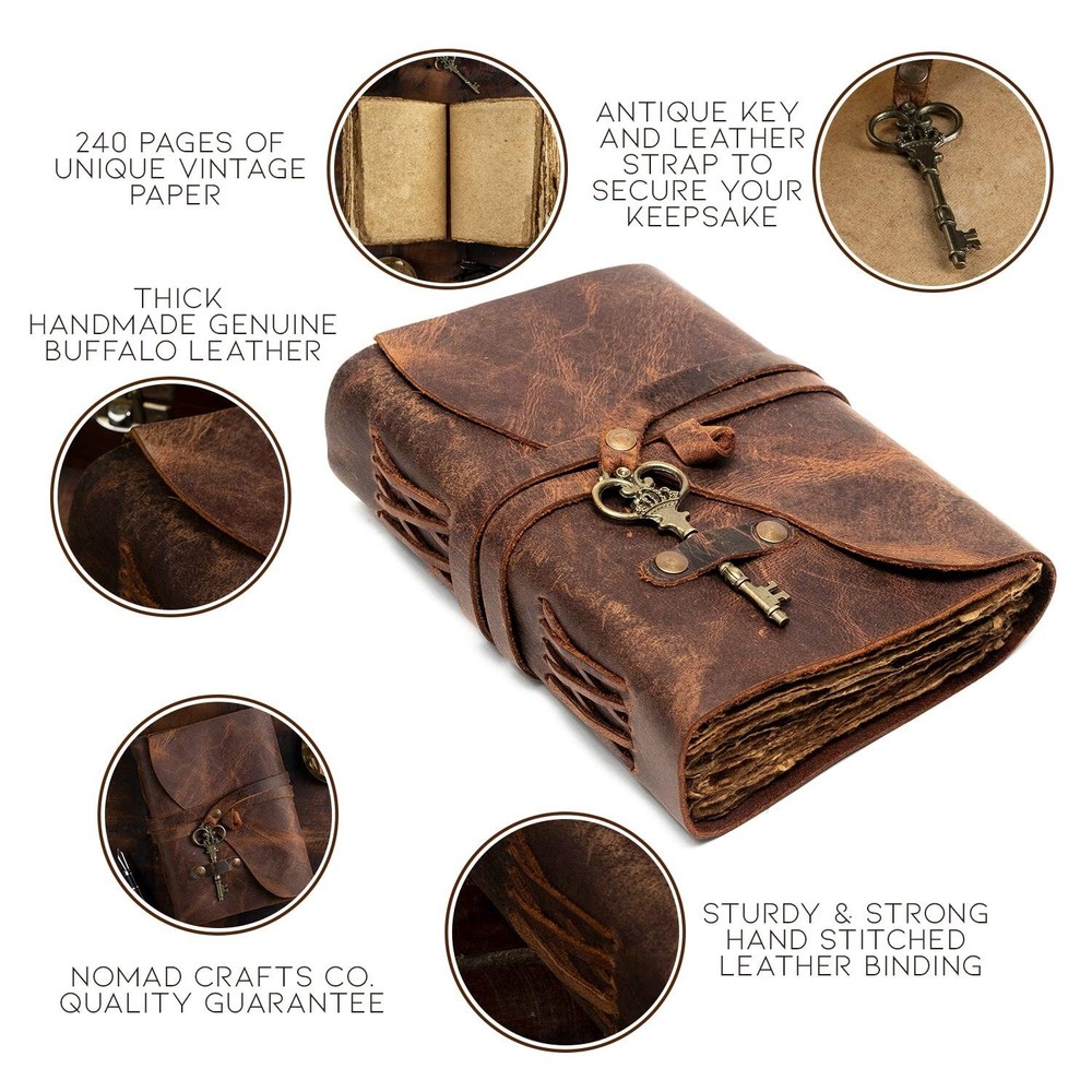 Vintage Leather Journal - Antique Handmade Deckle Edge Vintage Paper Leather Bound Journal - Book of Shadows Journal - Leather Sketchbook - Drawing Journal - Great Gift (Red Brown, 7.5"x5.5") ✓ Free 60 Day Returns ✓ Free Express Shipping Description: Features: Antique Paper - Nomad Crafts Co. Vintage Journal is made of unique vintage paper which looks like it was pulled from history. You will love the old looking handmade cotton paper (240 pages) which is unique to our vintage journals. Use Any Kind Of Pen - Sketch, Doodle, Write on your journal notebook with a Calligraphy Pen Fountain Pen, Brush Pen, Ball Pen, Acrylic Colours, Watercolor and many more. Soft Supple Thick Genuine Leather - The Nomad Leather Journal is made from naturally tanned full grain leather which feels and smells Amazing. It's soft and very comfortable in the hands. Don't be fooled with competitors using cheap substitutes, this is the real deal. Stylishly Medieval- Ancient looking rustic cotton paper combined with the beauty of distressed leather, hand stitched by Artisans, creates a keepsake you will cherish forever. Makes a great gift for the men, women, and wiccans in your life! Sturdy Binding, Leather Wraparound And Key - Sturdy hand stitched binding to make sure that no paper comes out loose.The leather wraparound with a cute key that slips in will make sure that the papers inside the journal are safe and secure. Product Details: Brand: NomadCraftsCo. Color: Red Brown Theme: Book Sheet Size: 7.5x5.5 inches Pages: 240 Pages Cover Material: Leather Style: medieval, antique Ruling Type: Plain Special Feature: Lock Number of Items: 1 Manufacturer: NomadCraftsCo. Brand: NomadCraftsCo. Item Weight: 15.2 ounces Package Dimensions: 8.07 x 6.89 x 2.2 inches Item model number: NOMAD-R-KEY-7-5-1 Color: Red Brown Cover Material: Leather Material Type: leather Number of Items: 1 Size: 7.5" x 5.5" Ruling: Plain Sheet Size: 7.5x5.5 inches Manufacturer Part Number: NOMAD-R-KEY-7-5-1 Date First Available: October 2, 2020