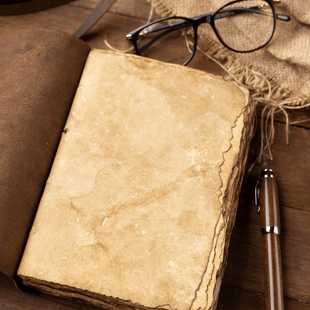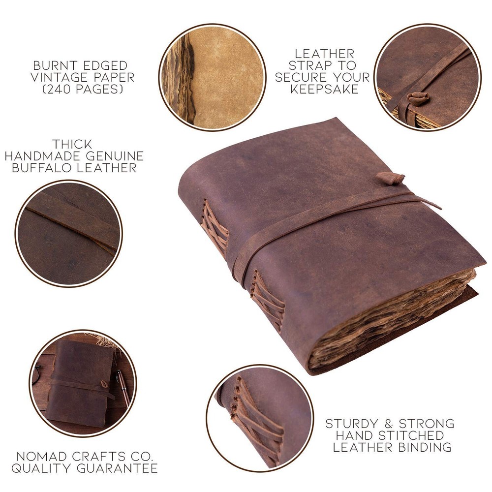 Vintage Leather Journal - Burnt Deckle Edge Paper - Handmade Leather Bound Book of Shadows - Sketchbook for Drawing - 240 Pages (9" x 6") Product Details Size: 9" x 6" Brand: NomadCraftsCo. MPN: NCRCO-Vintage-Burnt UPC: 704137794954 EAN: 0704137794954 Brand: NomadCraftsCo. Color: Brown Material: Leather Sheet Size: 9 x 6 inches Paper Finish: Watercolor Brand: NomadCraftsCo. Color: Brown Material: Leather Sheet Size: 9 x 6 inches Paper Finish: Watercolor Product Dimensions: 9"L x 6"W Recommended Uses For Product: Sketching, Drawing, Watercolor, Calligraphy Sheet Count: 240 Paper Weight: 16.3 UPC: 704137794954 Number of Items: 1 Manufacturer: NomadCraftsCo. Unit Count: 1 Count Item Weight: 1.3 pounds Item model number: NCRCO-Vintage-Burnt Cover Material: Leather Material Type: Leather Size: 9" x 6" Ruling: Plain Manufacturer Part Number: NCRCO-Vintage-Burnt Date First Available: February 29, 2020 BURNT ANTIQUE PAPER - Our newest Vintage Paper Leather Journal is made of unique burnt vintage paper which looks like it was pulled from history. You will love the old looking burnt handmade cotton paper (240 pages) which is unique to our vintage journals. USE ANY KIND OF PEN - Sketch, Doodle, Write on your journal notebook with a Calligraphy Pen Fountain Pen, Brush Pen, Ball Pen, Acrylic Colours, Watercolor and many more. PREMIUM SOFT SUPPLE THICK GENUINE LEATHER - The Nomad Leather Journal is made from cruelty free naturally tanned full grain Leather which feels and smells Amazing. It's soft and very comfortable in the hands. Don't be fooled with competitors using cheap substitutes, this is the real deal. STYLISHLY MEDIEVAL - Ancient looking rustic burnt cotton paper combined with the beauty of distressed leather, hand stitched by Artisans, creates a keepsake you will cherish forever. Makes a great gift for the men, women, and wiccans in your life! STURDY BINDING AND LEATHER WRAPAROUND - Sturdy hand stitched binding to make sure that no paper comes out loose from your vintage notebook . The leather wraparound keeps the papers of the journal safe and secure.