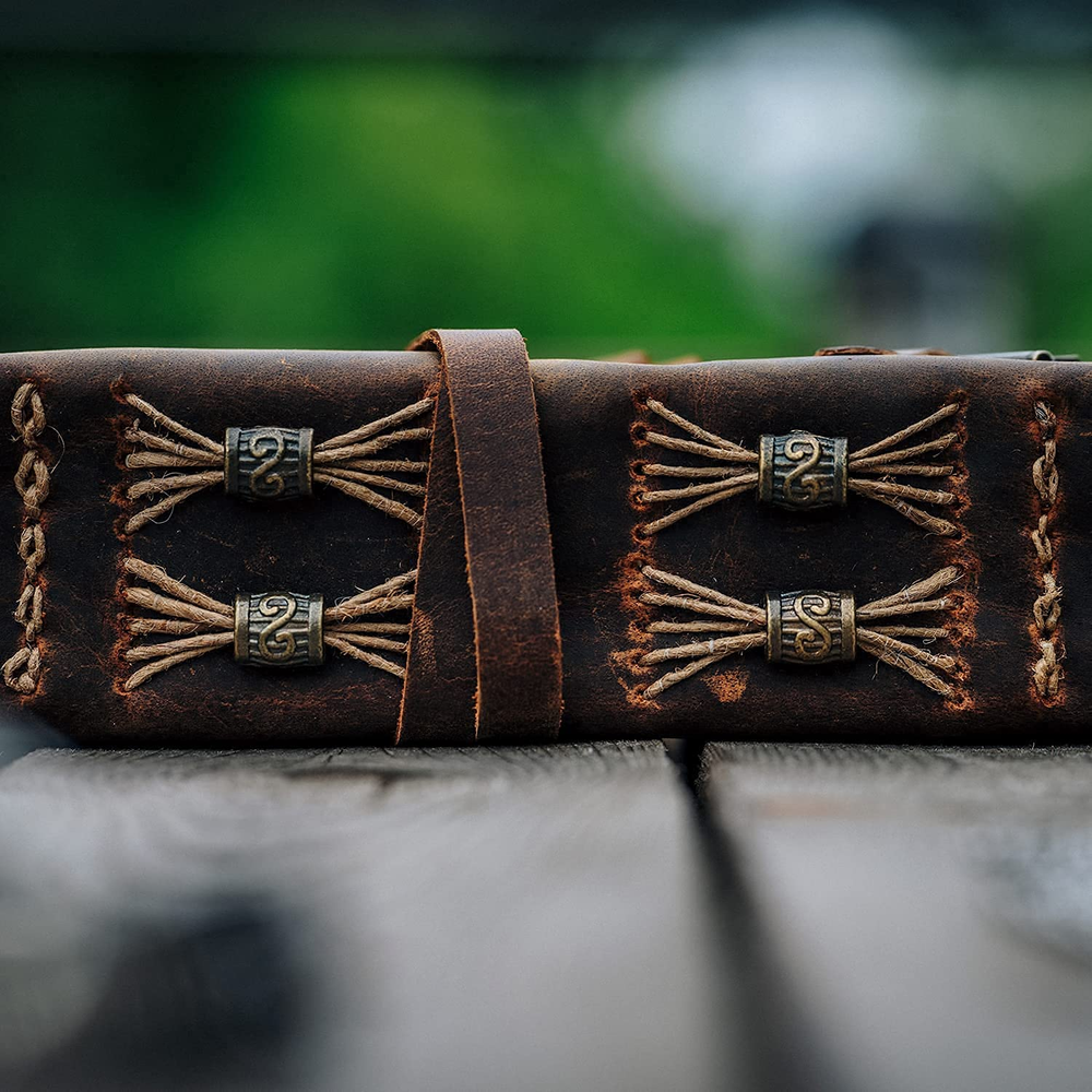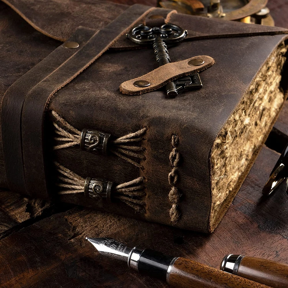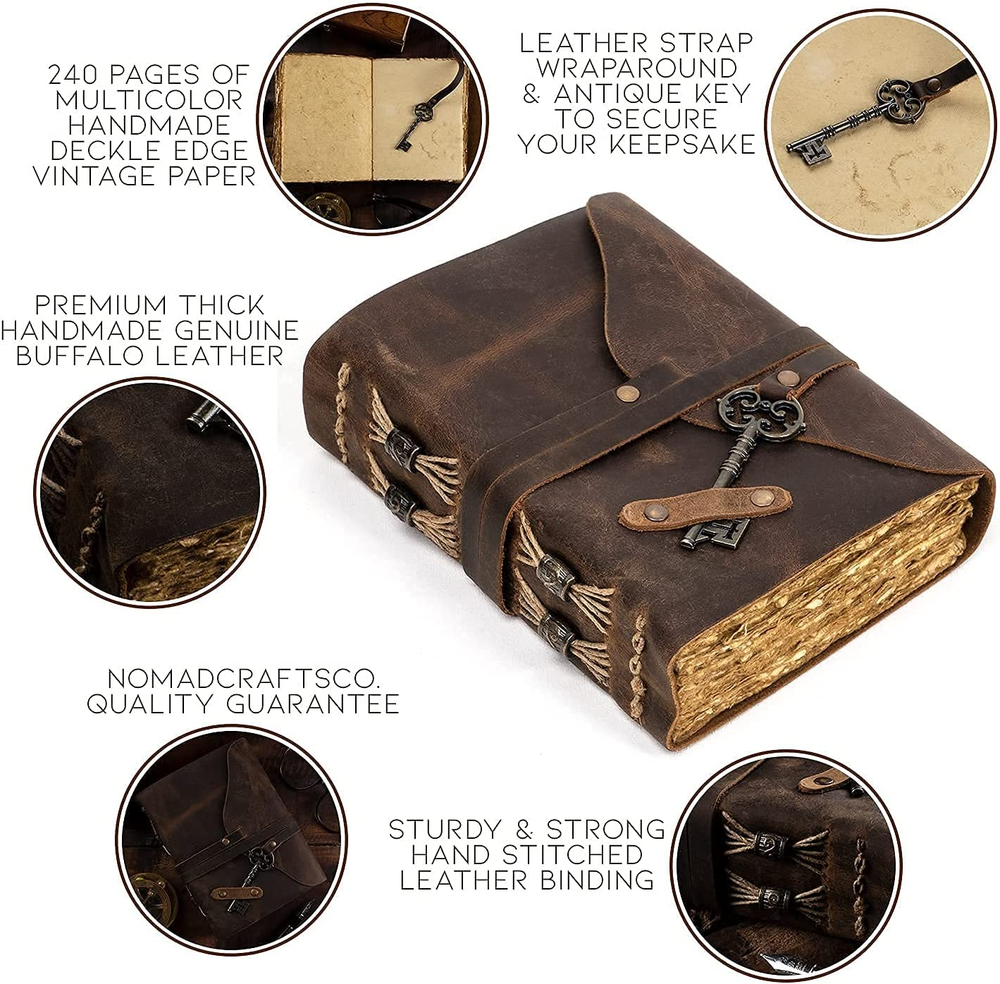 ANTIQUE JOURNAL W/ HANDMADE VINTAGE PAPER - These old fashioned journals with ancient looking rustic cotton papers, combined with the beauty of a REAL distressed leather, are the perfect gifts for people who are into junk journal kits, diary books, & vintage items! LEATHER BOUND SKETCHBOOK PERFECT FOR ANY MEDIUM - Sketch, doodle, and write on this vintage journal with Calligraphy, Fountain, Brush, and Ball Pens, or you can even do Acrylic and Watercolors. You can also turn these old journals into your very own dungeons and dragons notebook! SUPERB CRAFTMANSHIP - These journals have 240 pages of excellent quality 150 GSM handmade vintage papers and rich, durable handcrafted genuine brown leather covers. The leather journal blank pages are 100% bleed-through proof, even with any kind of medium. STRONG, STURDY BINDING & LEATHER WRAPAROUND W/ ANTIQUE KEY - Great quality journals always start with their binding. For the NomadCraftsCo's Vintage leatherbound blank book, the bindings are stitched by sturdy hands to make sure that the papers are safe and secure. THE NOMAD'S 365-DAY REPLACEMENT ASSURANCE - We are very confident that you will fall in love with Nomad notebook, that if you are unhappy with it for any reason, reach us and we will sort things out for you. We can even get you a new one–NO QUESTIONS ASKED! Product Description ANTIQUE JOURNAL W/ HANDMADE VINTAGE PAPER These old fashioned journals with ancient looking rustic cotton papers, combined with the beauty of a REAL distressed leather, are the perfect gifts for people who are into junk journal kits, diary books, & vintage items! SUPERB CRAFTMANSHIP These journals have 240 pages of excellent quality 150 GSM handmade vintage papers and rich, durable handcrafted genuine brown leather covers. The leather journal blank pages are 100% bleed-through proof, even with any kind of medium. STRONG, STURDY BINDING & LEATHER WRAPAROUND W/ ANTIQUE KEY Great quality journals always start with their binding. For the NomadCraftsCo's Vintage leatherbound blank book, the bindings are stitched by sturdy hands to make sure that the papers are safe and secure. LEATHER BOUND SKETCHBOOK PERFECT FOR ANY MEDIUM Sketch, doodle, and write on this vintage journal with Calligraphy, Fountain, Brush, and Ball Pens, or you can even do Acrylic and Watercolors. You can also turn these old journals into your very own dungeons and dragons notebook! ANTIQUE JOURNAL W/ HANDMADE VINTAGE PAPER SUPERB CRAFTMANSHIP STRONG, STURDY BINDING & LEATHER WRAPAROUND W/ ANTIQUE KEY LEATHER BOUND SKETCHBOOK PERFECT FOR ANY MEDIUM Add to Cart Add to Cart Add to Cart Add to Cart Add to Cart Customer Reviews 4.7 out of 5 stars 4,011 4.7 out of 5 stars 331 4.6 out of 5 stars 582 4.8 out of 5 stars 1,061 4.8 out of 5 stars 1,513 Price $24.95 $ 24 . 95 $24.95 $ 24 . 95 $37.95 $ 37 . 95 $28.95 $ 28 . 95 $27.95 $ 27 . 95 Discover other NomadCraftsCo. Vintage Leather Journals Our Original Vintage Leather Journal is perfect if you are looking for a journal which is more minimalist. It also has 240 Pages of Vintage Deckle Edge Paper. As pioneers of vintage paper leather journals this is our innovative lined vintage paper leather journal. Perfect for those of you who want the versatility of lined paper and the uniqueness of vintage paper. Add that extra bit of ruggedness with the burnt edge vintage journal. Yes, the edges are actually burnt! Our Heart Embossed Leather Journal makes the perfect gift to that special woman in your life. The classic vintage paper journal with the beautifully embossed tree of life to make it extra special. ANTIQUE JOURNAL W/ HANDMADE VINTAGE PAPER These old fashioned journals with ancient looking rustic cotton papers, combined with the beauty of a REAL distressed leather, are the perfect gifts for people who are into junk journal kits, diary books, & vintage items! SUPERB CRAFTMANSHIP These journals have 240 pages of excellent quality 150 GSM handmade vintage papers and rich, durable handcrafted genuine brown leather covers. The leather journal blank pages are 100% bleed-through proof, even with any kind of medium. STRONG, STURDY BINDING & LEATHER WRAPAROUND W/ ANTIQUE KEY Great quality journals always start with their binding. For the NomadCraftsCo's Vintage leatherbound blank book, the bindings are stitched by sturdy hands to make sure that the papers are safe and secure.