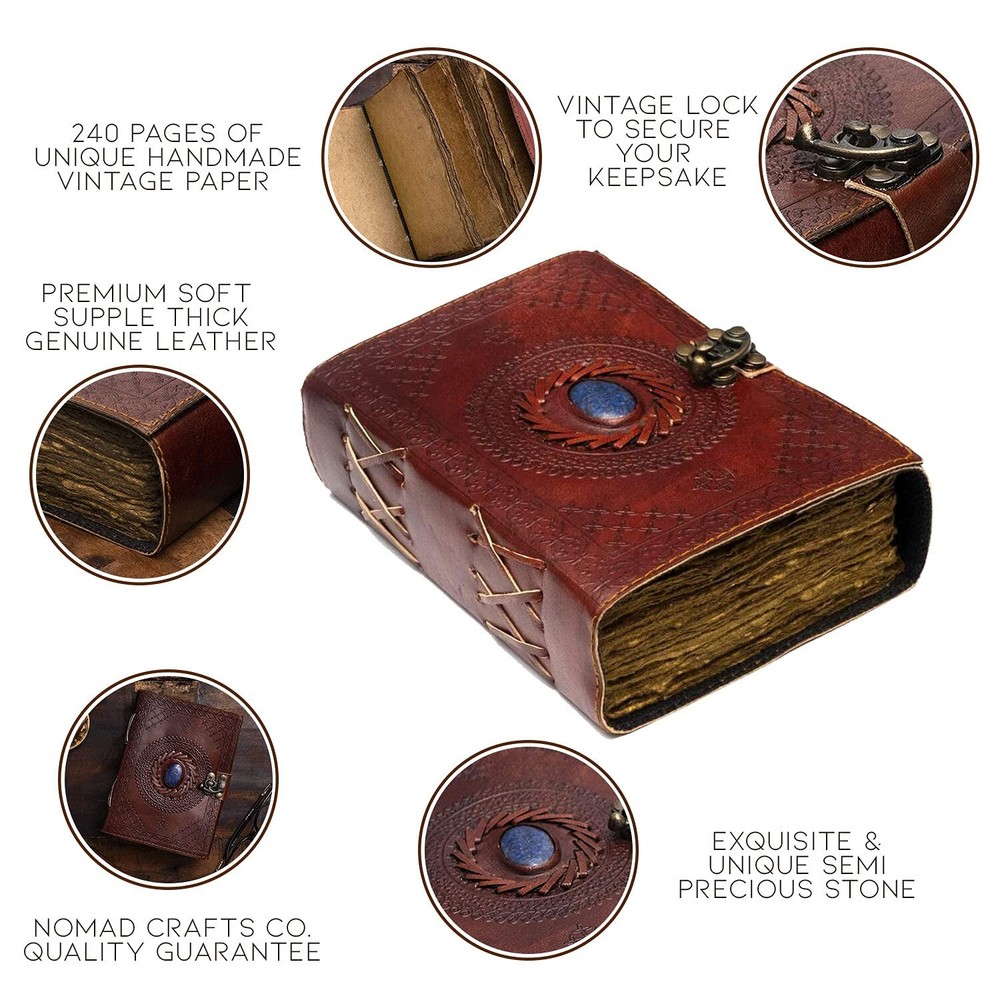 Vintage Leather Journal with Semi Precious Stone - Lock Closure, 240 pages Antique Deckle Edge Paper - Book of Shadows, Grimoire Journal, Witch Journal for Men and Women - 7" x 5" UNIQUE HANDMADE VINTAGE PAPER - Nomad Crafts Co. Vintage Journal is made with 240 pages of Antique Paper which looks like it was pulled from history. You will fall in love with the the antique handmade cotton paper which is unique to our Vintage Journal Notebook EXQUISITE & UNIQUE SEMI PRECIOUS STONE:The vintage journal is embossed with a special stone called “lapis lazuli” which helps to reveal inner truth within yourself and encourage self-awareness and self expression. We have taken extra to make sure that the emboss is perfect in every piece. VINTAGE LOCK AND STURDY BINDING - The vintage lock will keep all your valuable writing locked inside.Sturdy hand stitched binding to make sure that no paper comes out loose from your vintage notebook. USE ANY KIND OF PEN - Sketch, Doodle, Write on your Leather Bound Journal with a Calligraphy Pen Fountain Pen, Brush Pen, Ball Pen, Acrylic Colours, Watercolor and many more. We no bleed through. OUR 365 DAY PROMISE - We are very confident that you will fall in love with your Vintage Journal that we offer a 1 year .If you are not happy with your leather journal for any reason we will offer a FULL or a FREE . No Questions asked! Bring out your inner creativity with the NomadCraftsCo. Antique Leather Bound Writing Journal for Women and Men! The deckle edged vintage paper looks and feels like a thousand years old is treat to write on. The paper is made from environmentally friendly cotton and jute canvas. The paper is acid-free and pH nuetral therefore is a timeless piece of art. No more worries about ink messing up the pages either. The thick pages are ideal for pen, pencil, crayons and even charcoal! We can no bleed through! The vintage leather journal is a perfect sketchbook, book of shadows,grimoire, wicca, calligraphy journal, scrapbook, art journal, leather sketchbook and manymore. The leather bound journal made from antique paper is a treasure that you can pass down the generations. The leather is soft and supple to the touch and smells amazing. The leather will age over time and will get better and better. Its the perfect travel companion to cherish memories or even to jot down precious ideas and there is not better way preserve your memories for your future generations. Get Yourself The Most Valuable Travel Companion Today – Never Have To Travel Alone Again. Handcrafted by skilled artisans with a lot of love and care. Here’s Why This Vintage Leather Bound Writing Journal Is What You Are Looking For: 1. Soft Luxurious Durable and Leather Cover with Semi Precious Stone 2. 240 Pages of Thick Antique Vintage Cotton Paper which looks like thousand years old. 3. Sturdy Leather Binding Technique will make sure that the pages never fall off. 4. Medium size 7 by 5 inches rustic scrapbook/organizer easily portable. 5. Being hand-made, no two journals are quite the same. Shipping We ship within Three business days of payment, usually sooner. We use a selection of shipping services such as UPS, FedEx, USPS etc. We only ship to the lower 48 states, no APO/FPO addresses or PO Boxes allowed. Local pickups and combined shipping options are not provided at this time. Return You can return a product for up to 30 days from the date you purchased it. Any product you return must be in the same condition you received it and in the original packaging. Please keep the receipt. Payment We accept payment by any of the following methods: PayPal Please pay as soon as possible after winning an auction, as that will allow us to post your item to you sooner! Feedback Customer satisfaction is very important to us. If you have any problem with your order, please contact us and we will do our best to make you satisfied. Contact Us If you have any queries, please contact us via ebay. We usually respond within 24 hours on weekdays. Please visit our eBay store to check out other items for sale! Thank you for shopping at our store.
