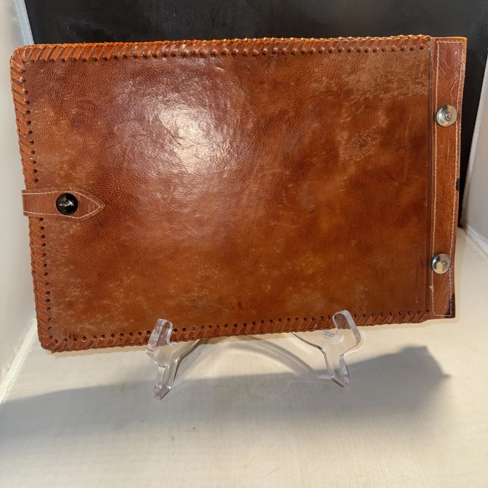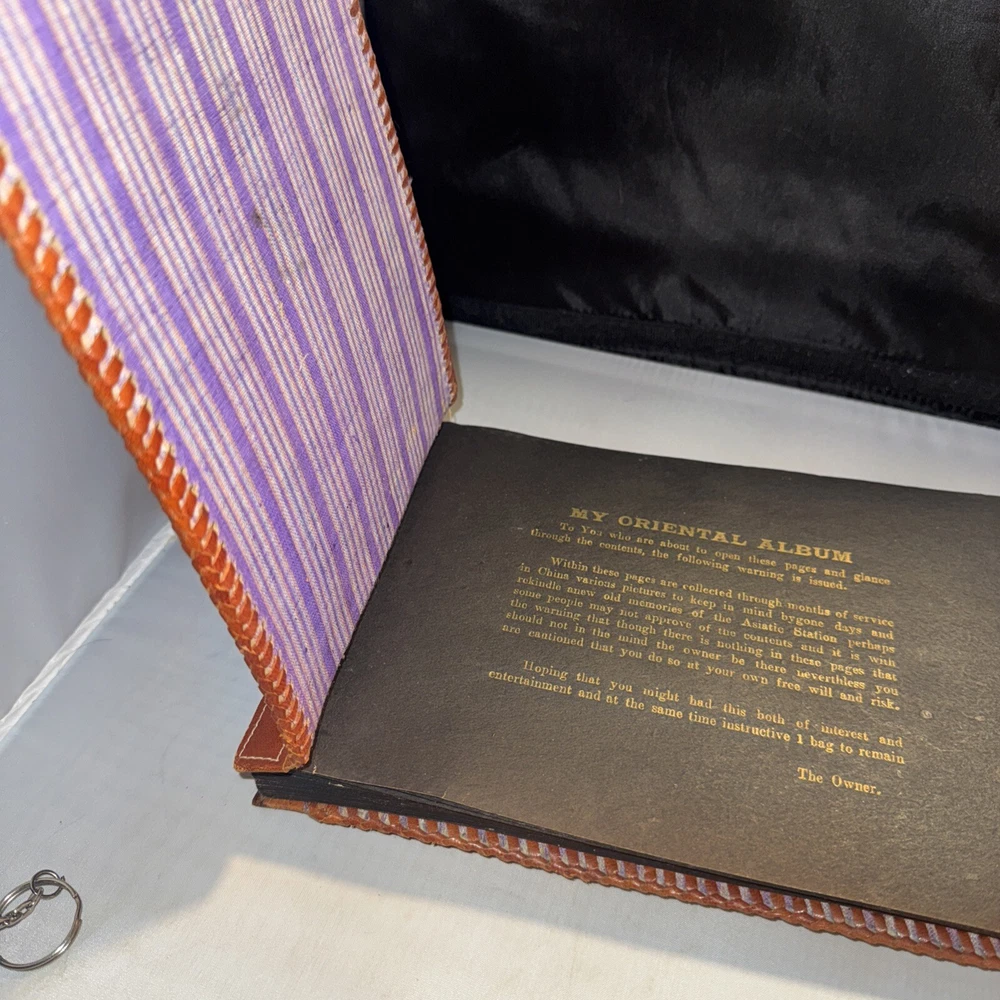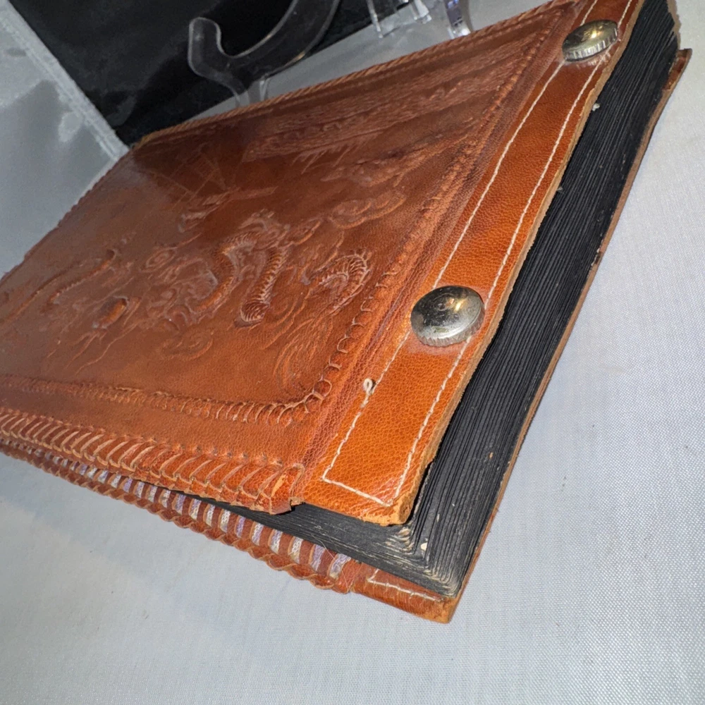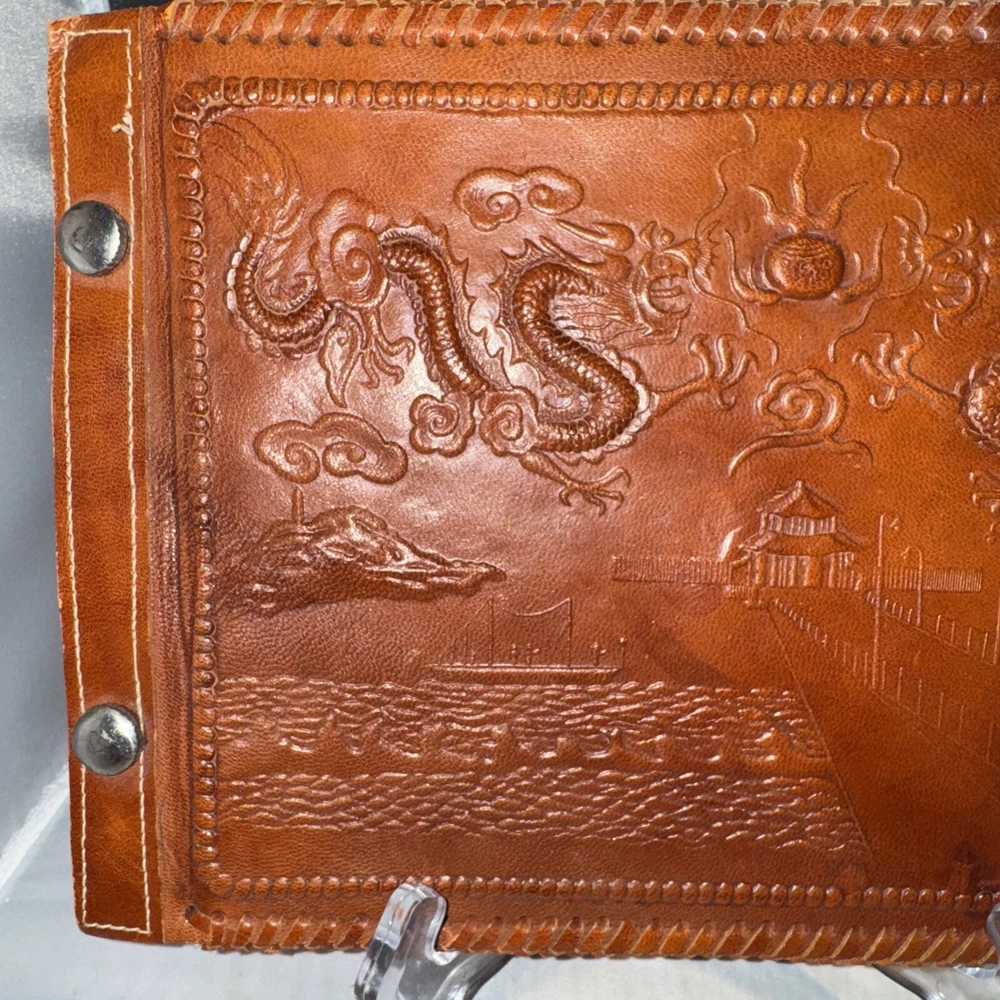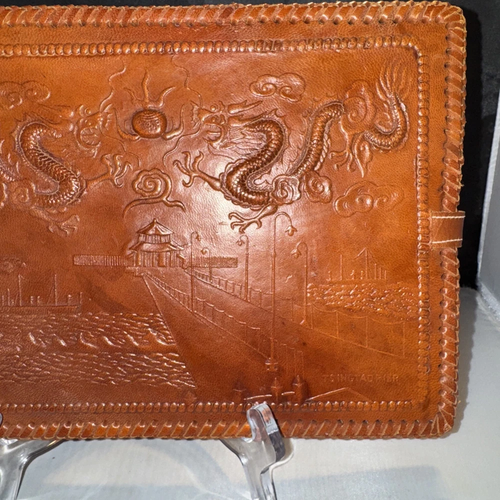 The product is a vintage leather photo album from the 1940s, featuring a Pacific Theater theme with images of Tsingtao Pier and rice paper inserts. The album is book bound in brown leather and has a classic, vintage aesthetic. This item was owned but never been used. It sat in a drawer till now. No sign of wear on the leather.