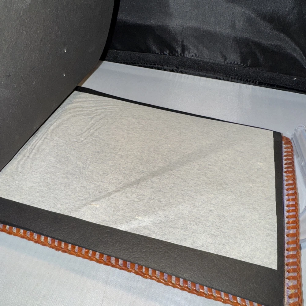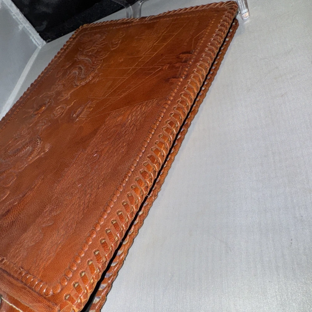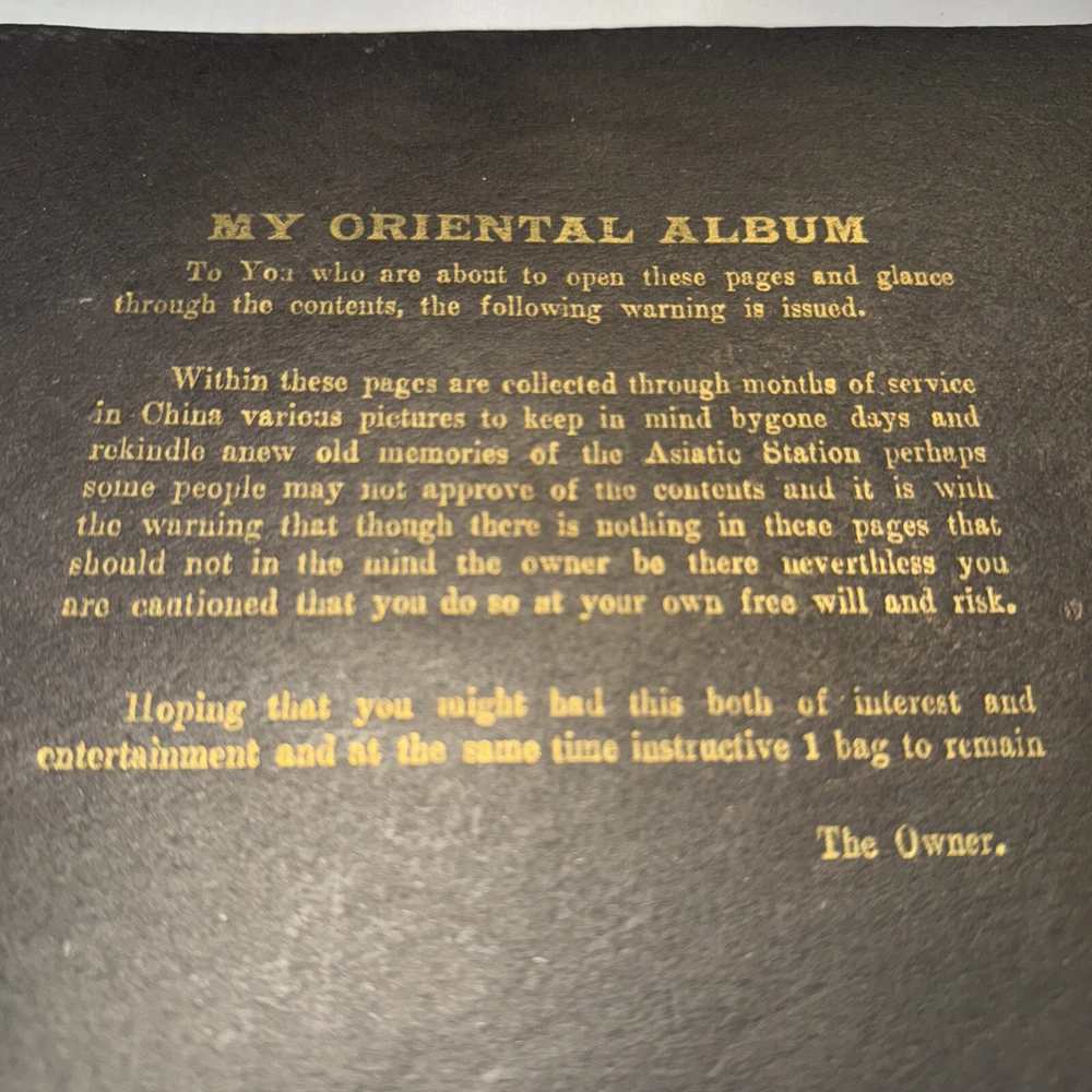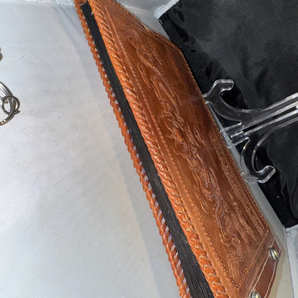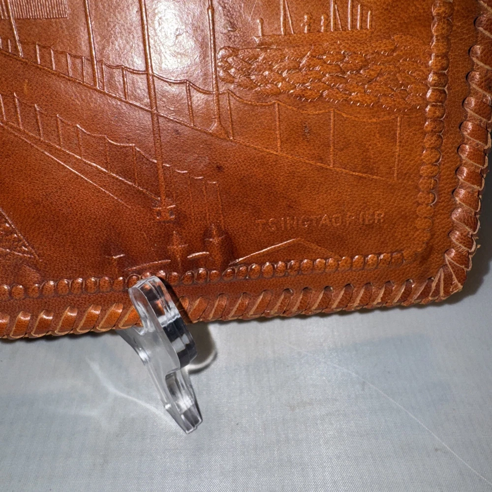 The product is a vintage leather photo album from the 1940s, featuring a Pacific Theater theme with images of Tsingtao Pier and rice paper inserts. The album is book bound in brown leather and has a classic, vintage aesthetic. This item was owned but never been used. It sat in a drawer till now. No sign of wear on the leather.