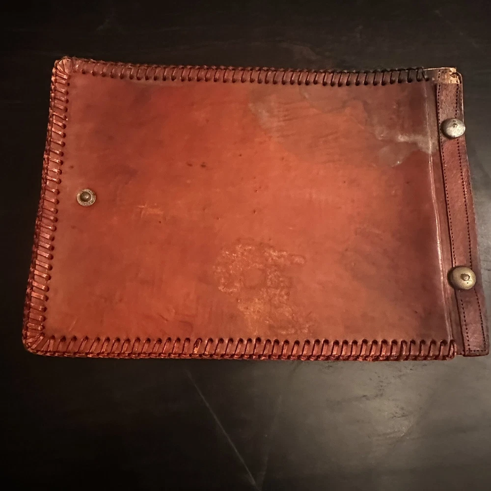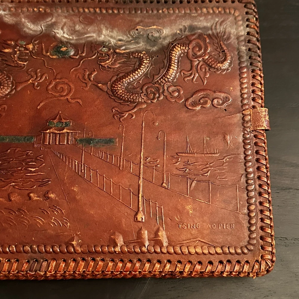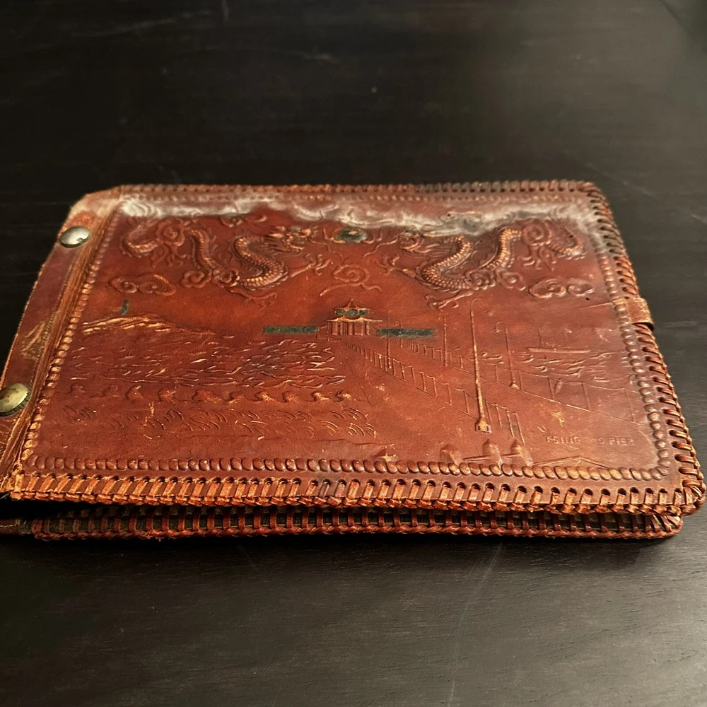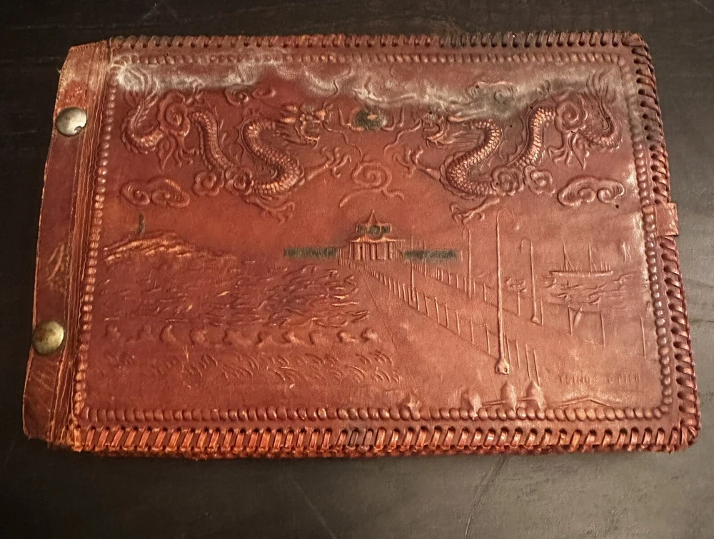 Vintage Leather Photo Album 1940's Pacific Theater ORIENTAL TSINGTAO PIER with original Rice Paper. I bought this at an estate sale, it does have some water damage and is missing the button close strap as shown in photos. Please look at all pictures as they are part of condition. It still has all the original rice paper art on the pages. Some are a bit torn, several are not at all. Really great piece of history. Book measures 11” x 7” about 1.5” thick.