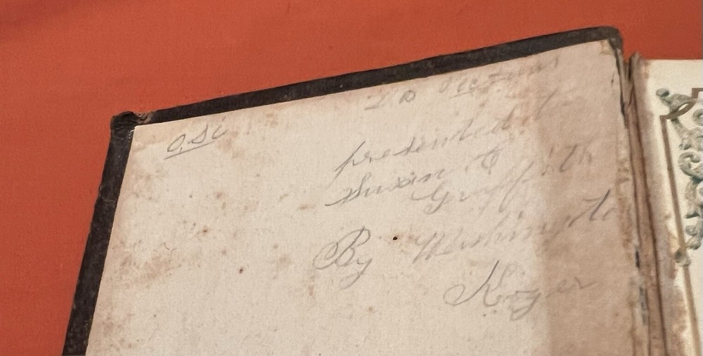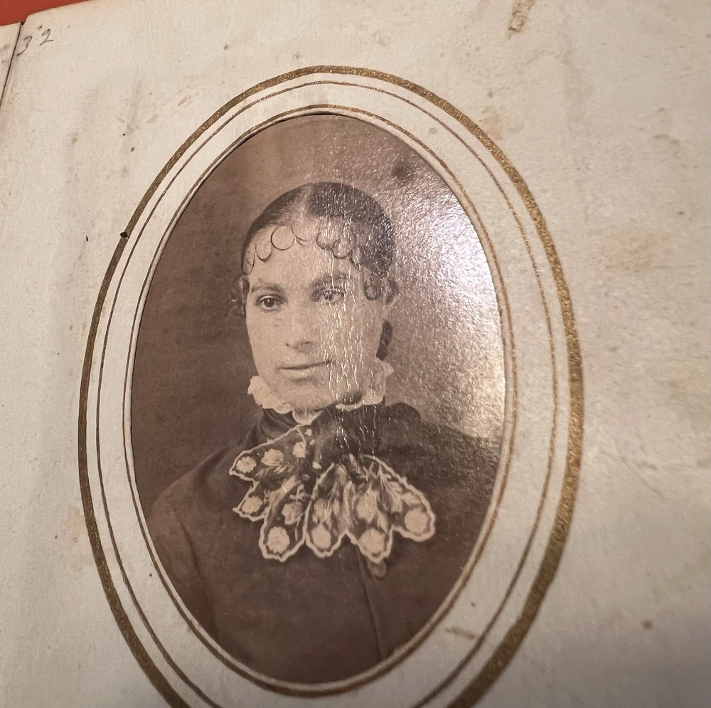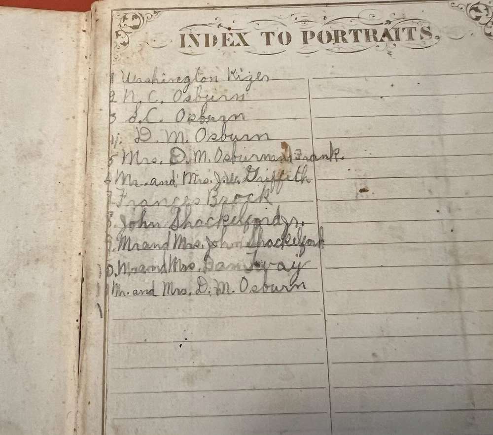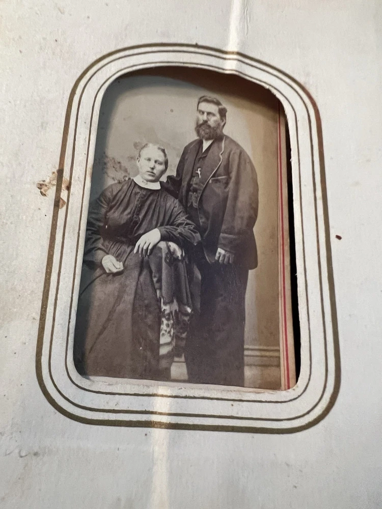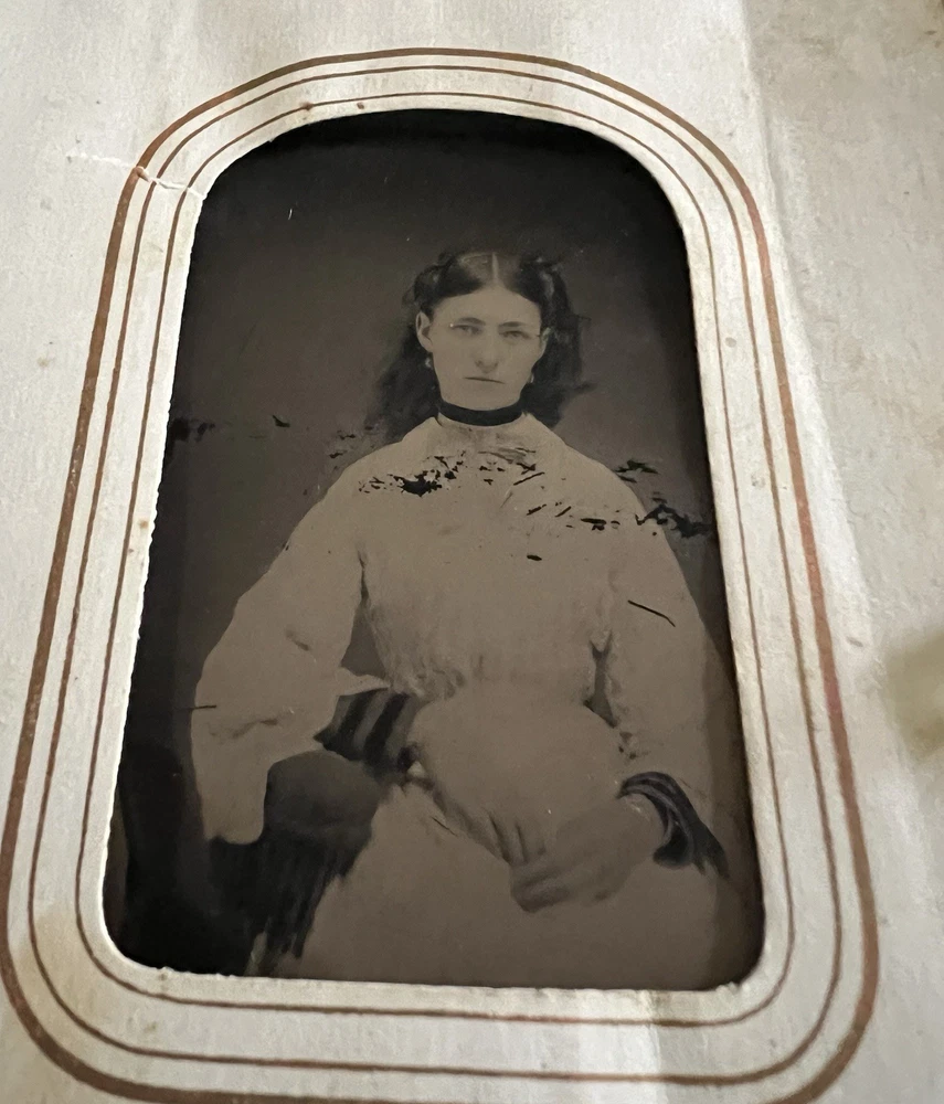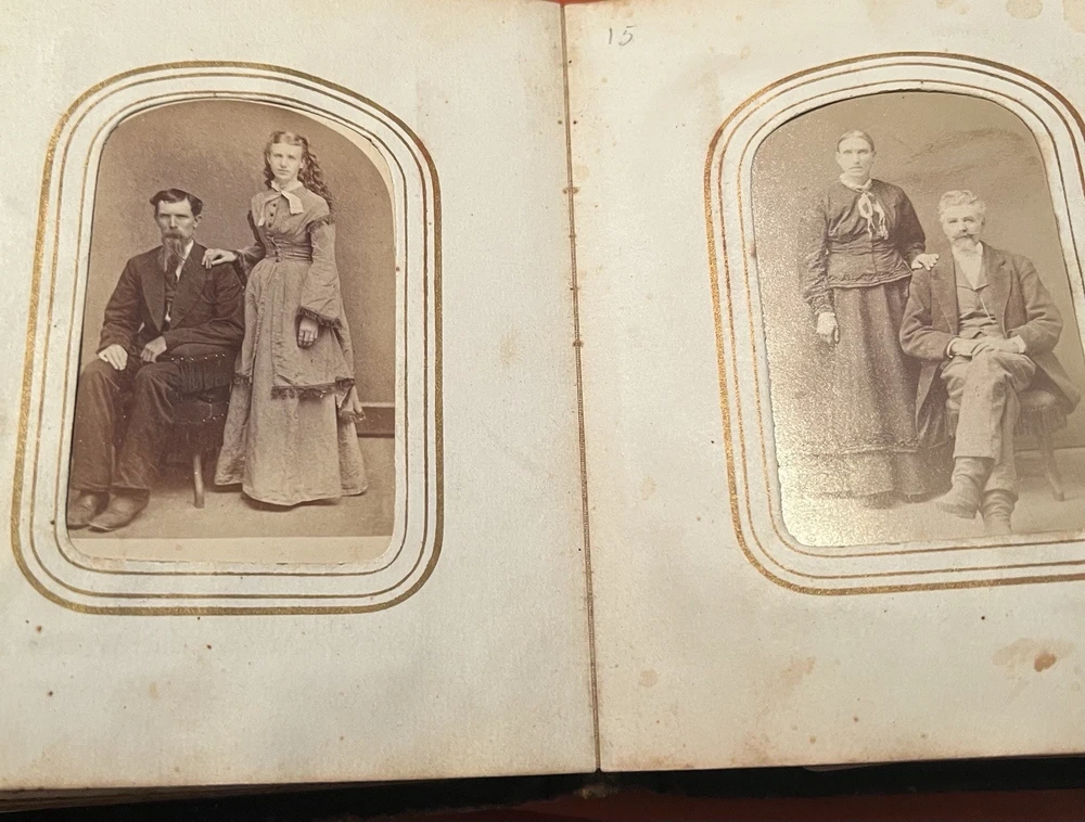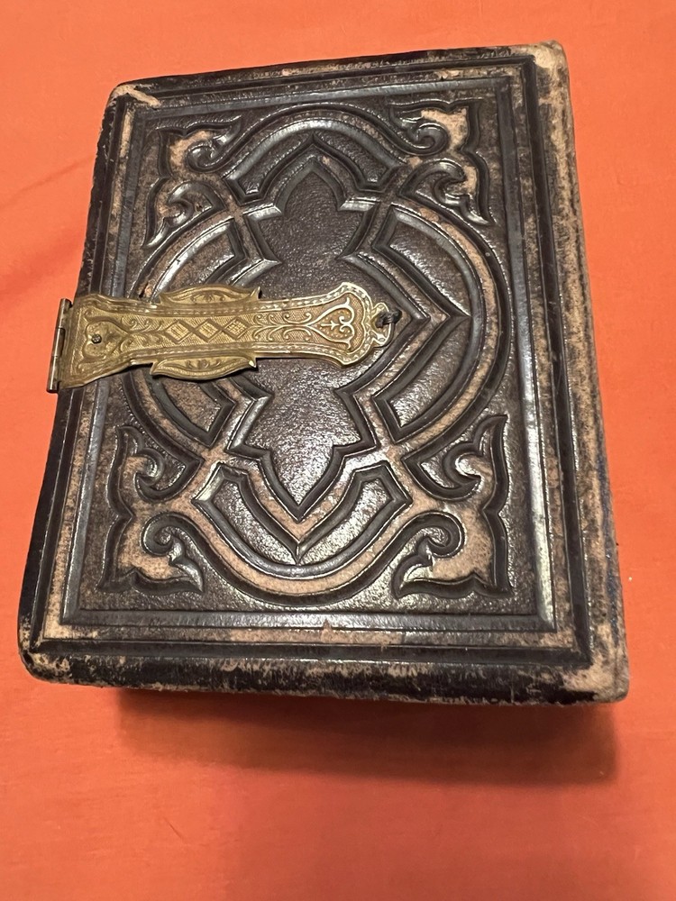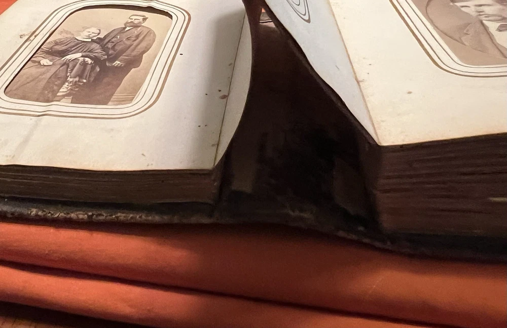 This vintage old photo album from the late 1800s to early 1900s is a beautifully crafted leather-bound book featuring 11 black and white photographs of a family. The album showcases a portrait theme, with each photograph capturing a moment in time from the 1850-1899 time period. Made in the United States, this antique piece is a charming collectible that provides a glimpse into the past and offers a unique window into the history of photographic images. Includes 11 pictures one of them is a 10 type finding is loose see picture there is a ledger in the back and written of who the people are pictures are numbered leather bound with some staining on some of the paper closure works. It is 6“ x 4 1/2“ x 2“ wide