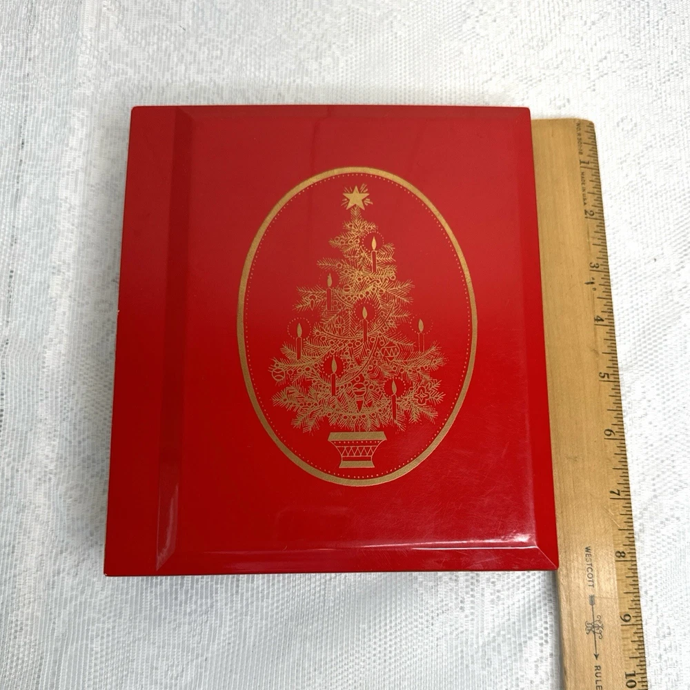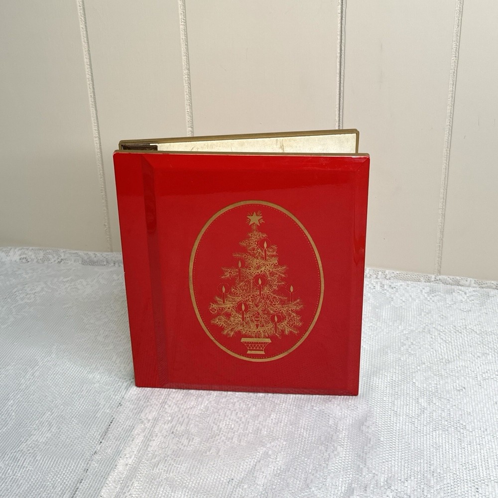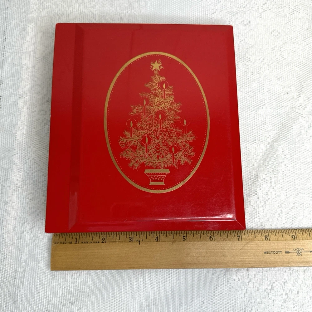 Great vintage Otagiri red lacquer ware photo album with a gold Christmas tree design. In good vintage condition with no major damage; has some light scuffing in some spots that is only really noticeable in certain light.