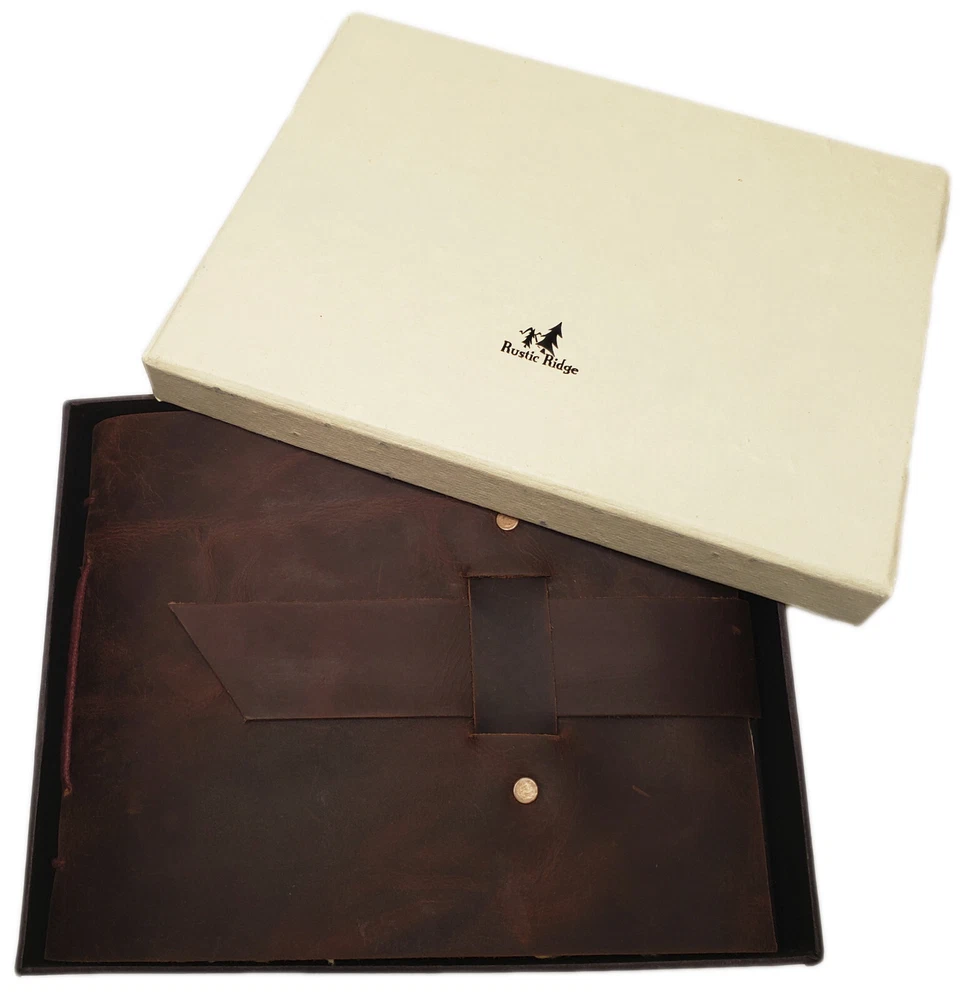 Rustic Ridge Genuine Leather Photo Album with Gift Box Leather Bound Scrapbook Album - 6x8" Genuine Leather Photo Album with buckle closure. New for 2023. Hand made using high quality leather and acid-free deckle edge cardstock paper. **Photo mounts required.** Traditional cardstock pages with semi-transparent sheet between each page. Includes 100 pages (50 sheets) of cardstock pages. Holds 100 4x6" or 5x7" photos. Album size: 8.25"L x 6"W Page Size: 7.25"L x 5.5"W Gift box included Very stylish and classy way to store and present your photos. Makes a great gift. Attention Customer: This album does not have photo slots. Photo Mounts are needed to mount photos in this album (sold separately). Double sided tape also works well. This leather photo album by Rustic Ridge Leather is the perfect way to store and present your photos with style and class. The rustic leather cover is made from high quality leather that not only looks great, but will last for years to come. The leather photo album holds 100 4x6" or 5x7" photos, and is the perfect size to bring along with you to gatherings with family and friends. This Rustic Leather Photo Album gives a uniquely classic look, style, and feel that you will not find in a modern style photo albums. Natural variations in the leather make each album one of a kind, and adds to the unique character of each one. This is a scrapbook style photo album. The cream colored pages are traditional acid-free cardstock with a semi-transparent sheet between each page, allowing you to attach photos to both sides of the pages. This leather photo album makes a perfect unique gift for the person in your life who seems to have everything , or you can buy it for yourself. Either way, you will be pleasantly surprised with the look, smell, quality, and class of this hand made leather photo album by Rustic Ridge Leather. ***We are the manufacturer and ONLY authorized seller of Rustic Ridge Leather brand products. You'll get the best price and service by buying directly from us.*** We pride ourselves in providing quick shipping. All purchases are shipped within 1 business day of completed payment, and tracking information will be available from within your Ebay account. Your satisfaction is important to us! That is why we take great care to ensure that each order gets shipped out quickly, and we are committed to providing each and every customer with the highest level of customer service, before and after the sale.
