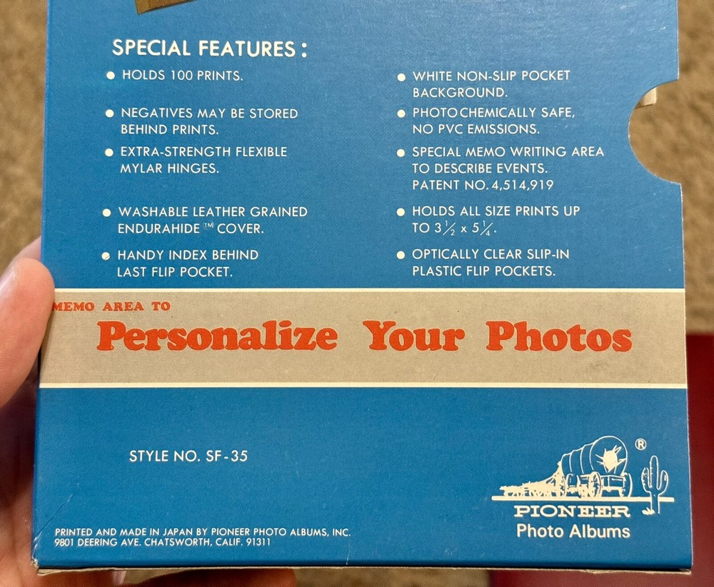 This vintage Pioneer SF-35 Le Memo Photo Album is a must-have for any photography enthusiast. The album features 100 memo flip pockets, perfect for storing your precious memories. The book-bound format and faux leather material give it a unique and classy look, while the red / burgundy color adds a touch of elegance. This slip-in album is ideal for anyone who wants to keep their photos safe and organized. The maximum photo size of 3.5 x 5.25 inches ensures that your memories are captured in high quality. Made in Japan, this album is a true vintage find for any collector. Packaging States - Special Features : - Holds 100 prints - Negatives may be stored behind prints - Extra strength flexible mylar hinges - Washable leather grained endurahide cover - Handy index behind last flip pocket - White non slip pocket background - Photochemically safe, no pvc emissions - Special memo writing area to describe events - Holds all size prints up to 3 1/2 x 5 1/4 - Optically clear slip in plastic flip pockets Will answer questions about item to the best of my knowledge. Will package very secure for shipment. Thanks for looking!