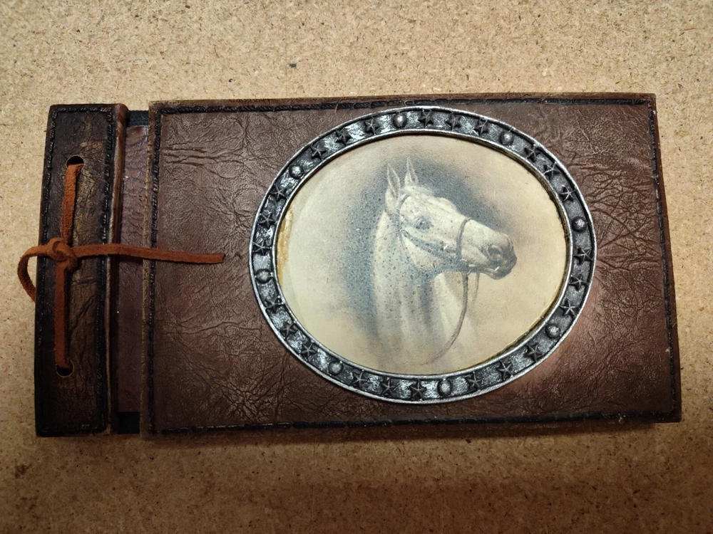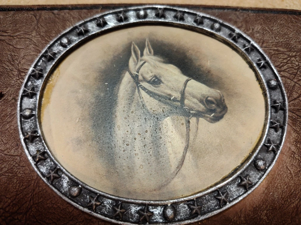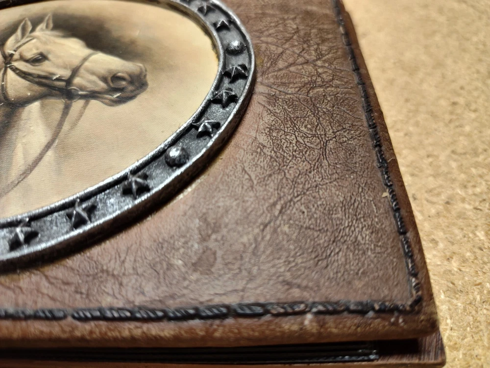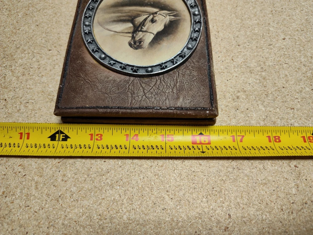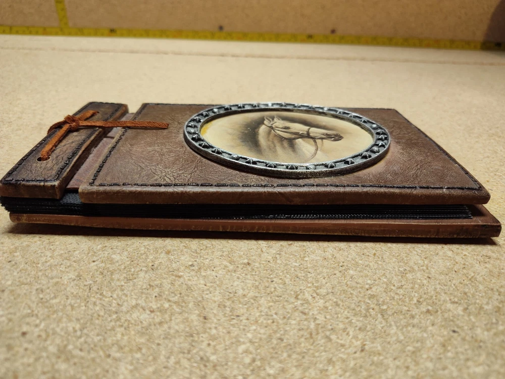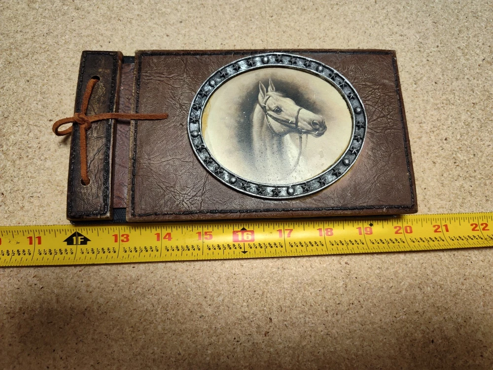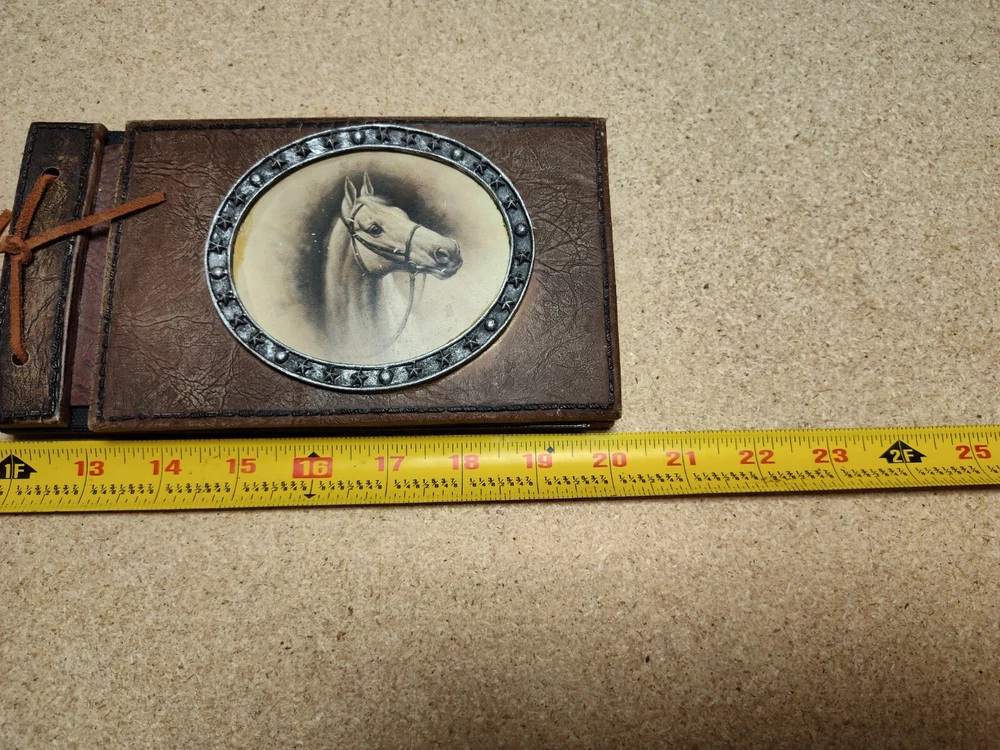Vintage Style Ceramic Horse Themed Picture Album, Fits 4"x6" Pictures, 12 double sided slots. The covers are thick and heavy. Measures: 8" x 4.25" The album is in excellent condition. See pictures.