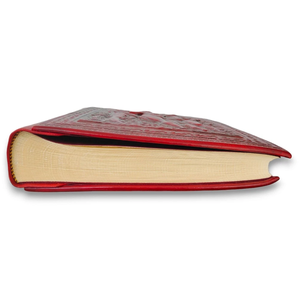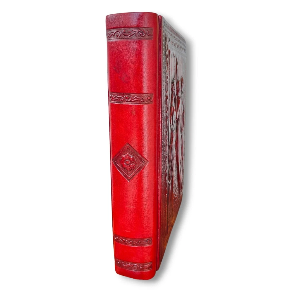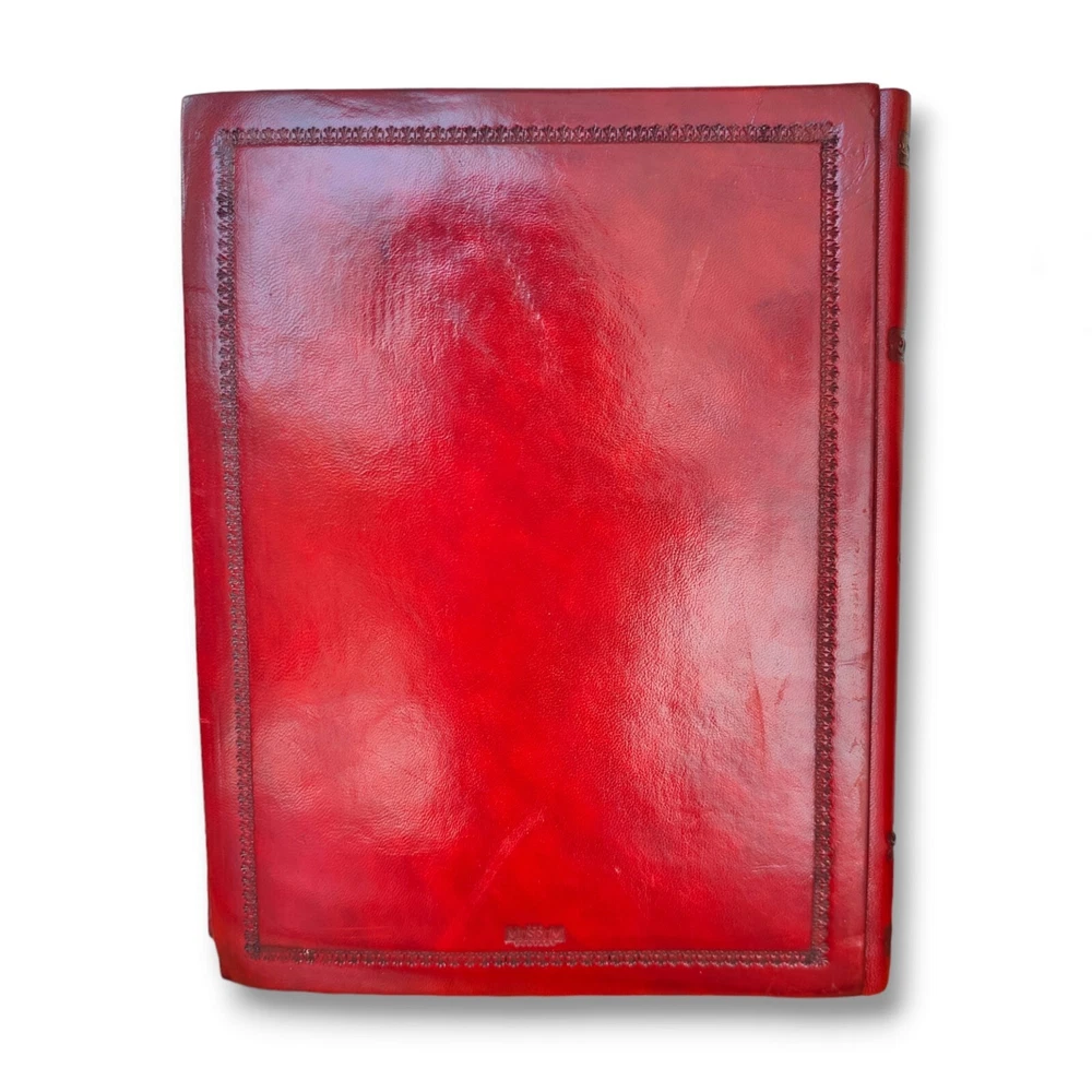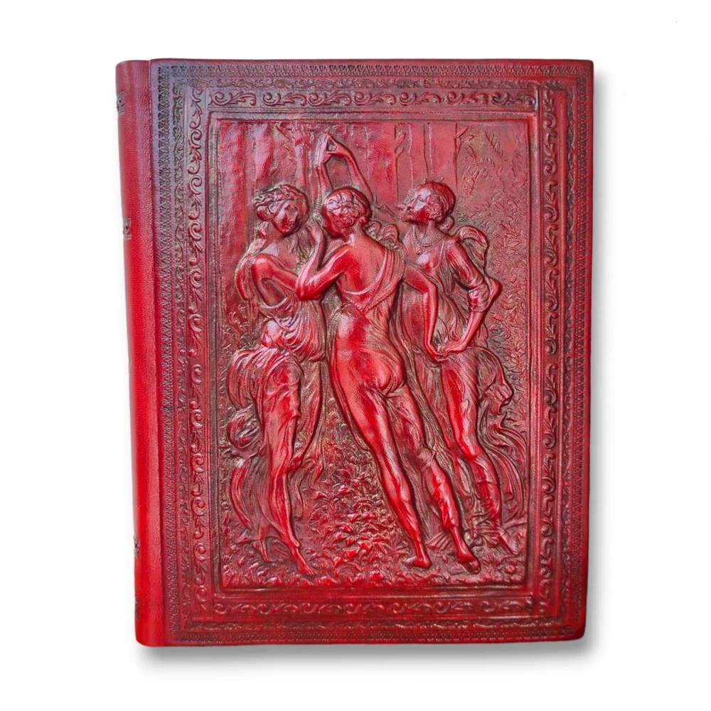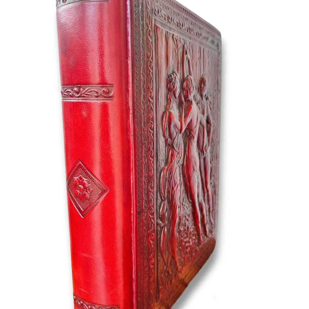 Inspired by Italian Renaissance designs, this exquisite album provides a most elegant home for storing treasured photos and mementos. Using centuries old binding techniques, skilled Italian craftsmen create each leather album by hand, using traditional tools to emboss and intricately detail each. Embossed on the rich, mottled leather cover is a design of three goddess-like figures draped in flowing togas. With attention to detail, the back and spine of the cover also bear embossed designs. The interior is lined with 50 heavy, archival, acid/lignin-free, ivory sheets bound with delicate rice paper interleaving for the ultimate in photographic protection. Made in Italy. In great condition! Never been used but back has light wear to it. And small bend in the corners. Otherwise, in excellent condition. Measures approximately 12.25" x 9.75"