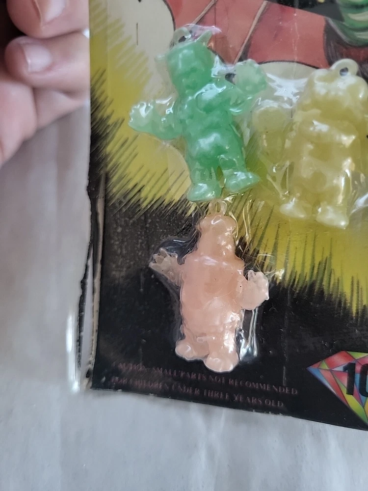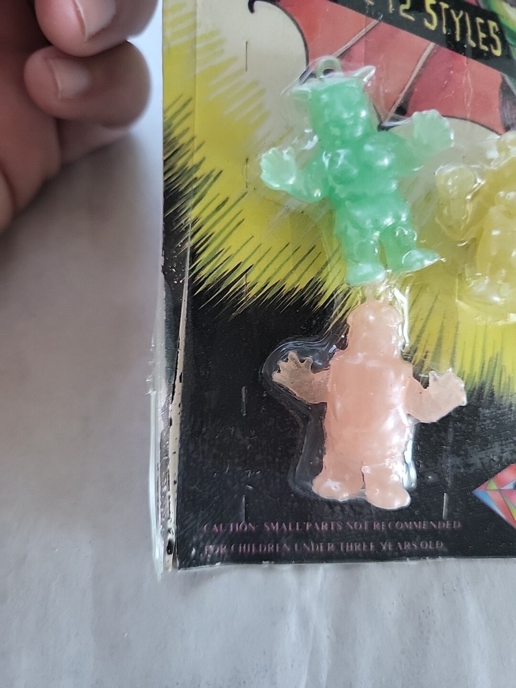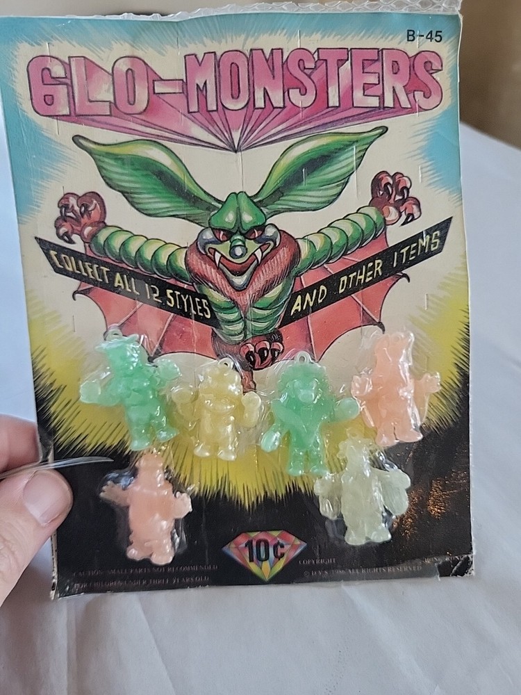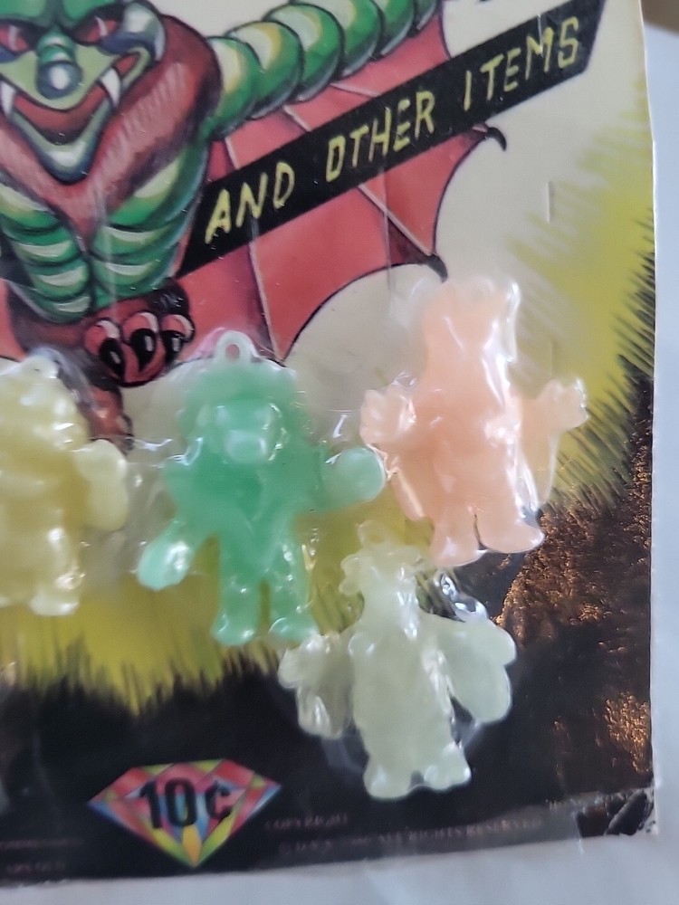 There is some damage on the side of the packaging. This is a rare and collectible item, a vintage vending machine toy featuring 6 Glow-in-the-Dark Glo-Monster figures. These particular Figures are the #1 in the series and a must-have for any Godzilla fan or collector. These toys are in great shape and ready to be added to your collection. It's the perfect addition to any display or toy collection, and a great conversation starter. Don't miss out on this opportunity to own a piece of Godzilla history!