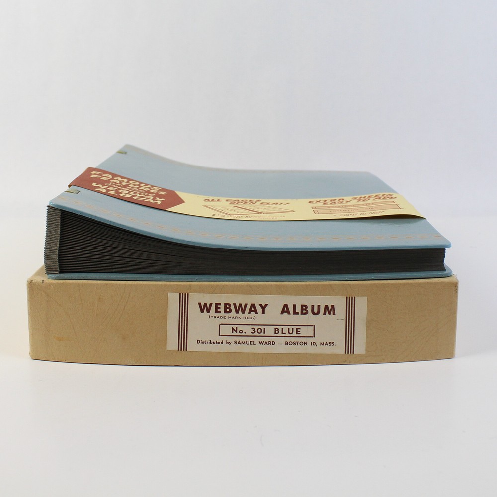 This vintage Webway photo scrap album features a beautiful blue leather cover, ideal for preserving your precious memories. In very good pre-owned condition, it includes blank pages, allowing you to customize it to your liking. Measuring 12 inches in height, 9 inches in width, and 2 inches in depth. Add a touch of nostalgia to your photo collection with this classic album!