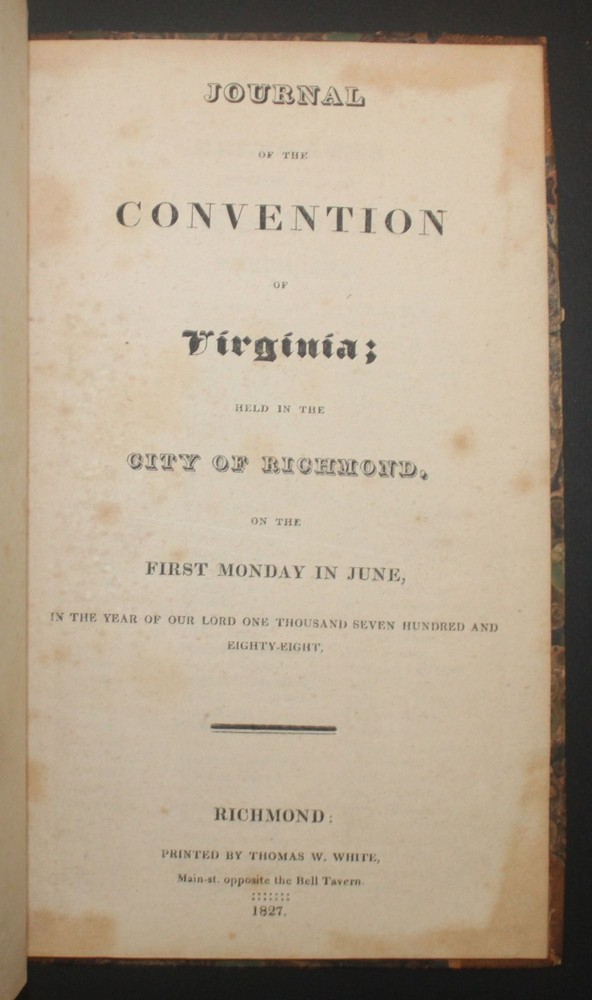 JOURNAL OF THE CONVENTION OF VIRGINIA; Held in the City of Richmond on the First Monday in June, in the Year of our Lord One Thousand, Seven Hundred and Eighty-Eight [1788] Author: Virginia. Constitutional Convention Title: JOURNAL OF THE CONVENTION OF VIRGINIA; Held in the City of Richmond on the First Monday in June, in the Year of our Lord One Thousand, Seven Hundred and Eighty-Eight [1788] Publication: Richmond: Thomas W. White, 1827 Description: Quarter Leather. Good binding. Small quarto. 39 pp. Early reprint after the original 1788 edition. Contemporary binding, backed in tan sheep with corners and marble paper over boards. Leather at the front joint is separating, but the board is holding well; spine somewhat worn; contents are clean and the slim textblock is sold. In addition to the list of delegates and daily proceedings, this journal contains the discussion, votes, and printed Constitution as ratified in 1788. According to Swem (no. 7586), 200 copies of the journal was printed by Augustine Davis at the close of the convention in 1788. That edition is extremely rare. Even this 1827 edition is fairly uncommon in the trade. Sabin 100030; Swem 7587. Seller ID: 6104 Subject: Americana, History--U.S., Rare Book Room Michael Pyron, Bookseller, ABAA/ILAB I have been a bookseller and bookbinder for nearly two decades. I offer a general stock with an emphasis in private press and illustrated books, as well as literature and Americana. I take pride in my high level of customer service; if you aren't satisfied with either the book or the service you've received, please let me know about it so I can make it right. Terms All order are shipped with 1 business day upon receipt of payment. The standard shipping method is USPS Media Mail but Priority Mail or UPS shipping is available. Please inquire before payment if you'd like the invoice adjusted to account for a different shipping method. I will accept returns for any reason within 30 days so long as the book or item is returned in the same condition in which it was sent. This listing was created by Bibliopolis.