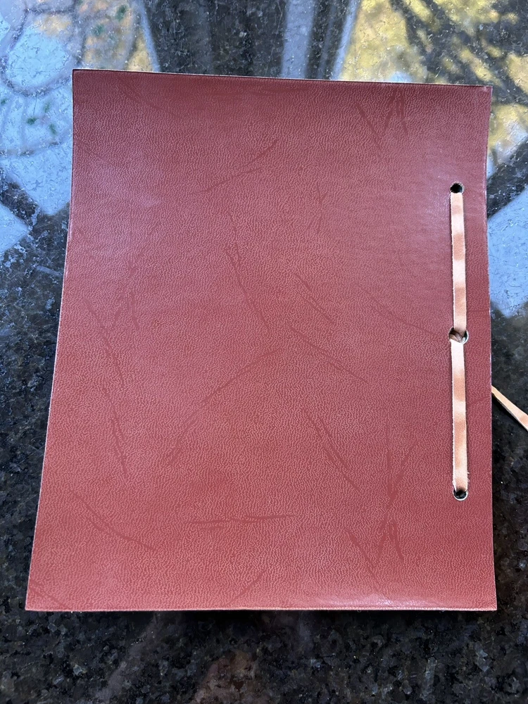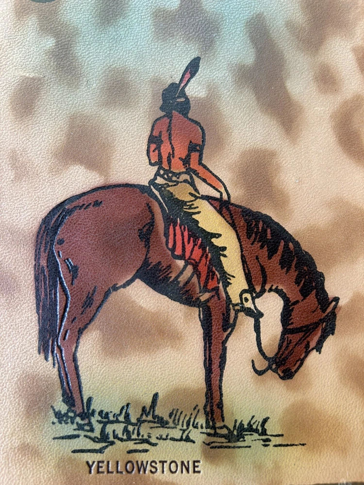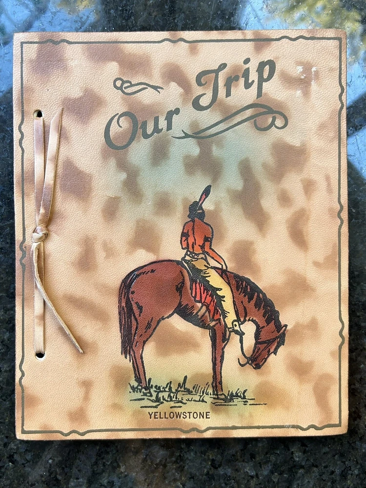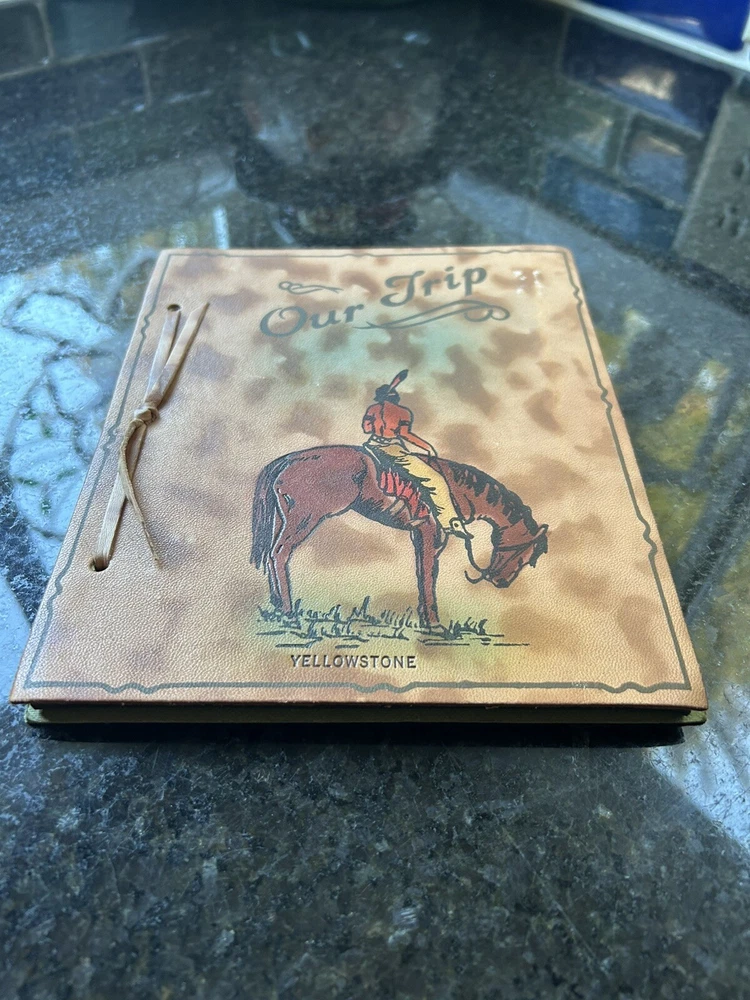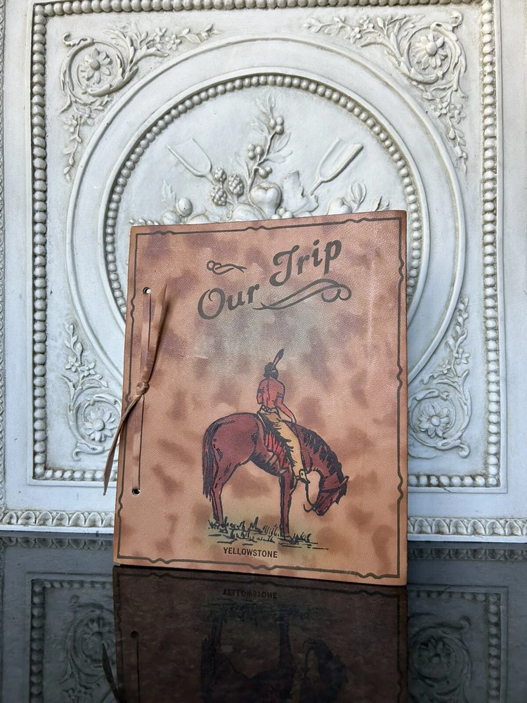 Yellowstone collectible, Native American on horse, Indian on horseback, Our Trip leather album, souvenir leather book, leather front cover, embossed colored image, cameras & photos, photo accessories, photo albums & storage, leather photo album, collectibles, photographic images, Yellowstone photo album. Crafted with care, this vintage leather photo album and trip log is a unique piece of history from the 1950s. Our Trip to Yellowstone captures the essence of a bygone era with its embossed design and colorful leather cover. It measures 8 1/2” by 7”, making it the perfect size for displaying and preserving your memorable moments. It is in pristine condition, unused condition. Its pages are slightly yellowed and near perfect. It’s beautiful. The album has never been used, suggesting a personal touch from a simply bound production technique. Its theme revolves around the majestic landscapes and Native American culture of Yellowstone. This collectible item is a true reflection of the past, ready to find its place in a discerning collector's treasure trove.