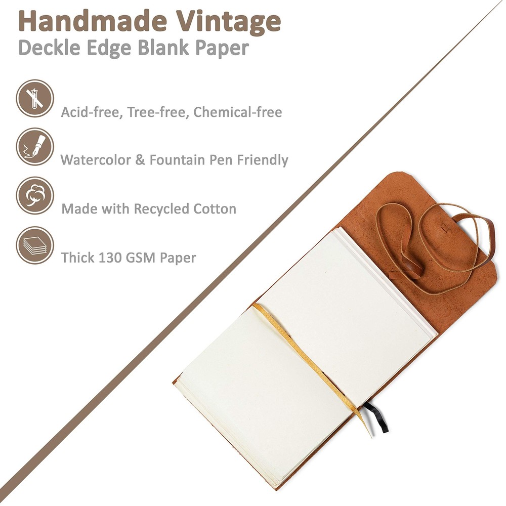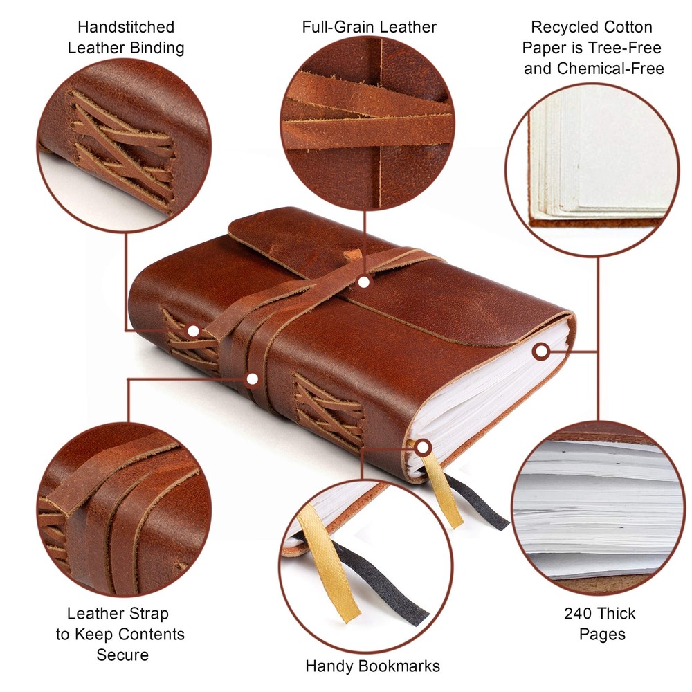 WANDERINGS Leather Bound Notebook - 7x5 - Blank Pages - Hand-Crafted Genuine Leather Writing Notebook - Makes a Great Gift for Writers Poets and Travelers. Description Features: Beautifully Handcrafted High quality,Thick, full grain 100% leather notebook that looks, smells and feels beautiful, 7x5'' / 18x13cm. Vegetable-tanned buffalo leather will age with character - a lifelong keepsake for your thoughts and expressions A Timeless Gift: Give a gift that can be cherished forever. Ideal as a leather diary, sketchbook, writing journal, poetry journal - it is only limited by your imagination. Makes a perfect gift for women or men Premium Recycled Cotton Paper is acid-free, chemical-free and tree-free. Enjoy 240 pages (120 sheets) ofThick 120 GSM Blank unlined paper. Fountain Pen friendly paper prevents bleed-through. (non-refillable) Attention To Detail Our unique leather journals are carefully crafted for quality. You'll love the look, feel and longevity Product Details: Brand: WANDERINGS Color: Unlined Pages: 240 Pages Cover Material: Leather Style: Handmade Paper Ruling Type: Unlined Number of Items: 1 Specific Uses For Product: Writing, Sketching, Drawing, Journaling Pattern: Solid Color Number of Sections: 1 Manufacturer: Wanderings Brand: WANDERINGS Item Weight: 1.12 pounds Product Dimensions: 7 x 5 x 1 inches Item model number: TMJ57-01 Color: Unlined Cover Material: Leather Material Type: leather Number of Items: 1 Size: 13x18 cm Ruling: Unlined Manufacturer Part Number: TMJ57-01 Date First Available: August 1, 2020 Handling We will ship all orders within 3 business day of payment. Delivery We Do Not Ship Outside of the Continental US. Return Policy All items qualify for returns within 30 days of receipt. Buyer is responsible for return shipping on any item that is not damaged. Feedback We take our reputation seriously, we buy and sell online, so we understand the value of trust. If you are unsatisfied with your order, please contact us and we will work with you to resolve it to your satisfaction.