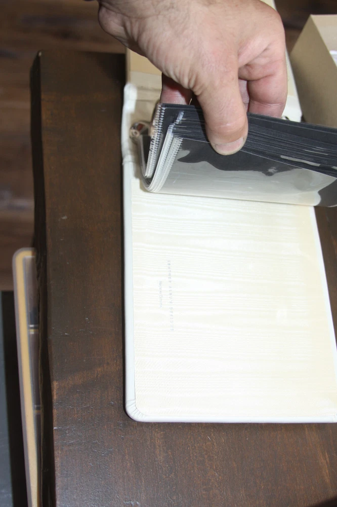 WHITE Leather Album Designs photo album holds 4x5 5x5 4x6 photos made in Canada comes with 10 pages for 20 photos 4x6 might be tight OAL Page size is 5.5x6.5"