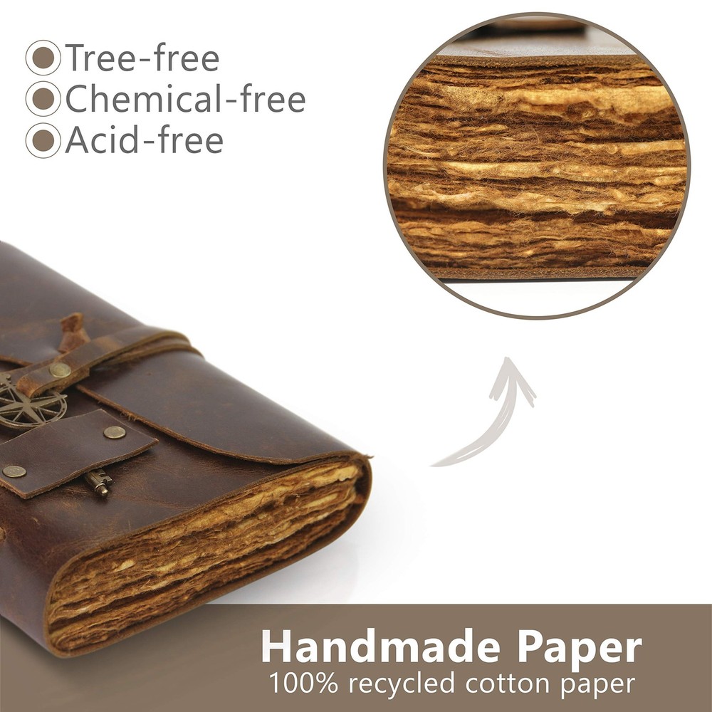[Beautifully Handcrafted] High quality, thick, full grain 100% leather notebook that looks, smells and feels beautiful. Vegetable tanned buffalo leather will age with character - A lifelong keepsake for your thoughts and expressions [Antique Deckle Edge] 200 pages of 125GSM vintage blank recycled cotton that is acid-free, chemical-free and tree-free. This gorgeous, thick antiqued paper prevents bleed-through and feels amazing. Environmentally sensitive and fountain pen friendly [Free your Imagination] Escape with your Wanderings vintage journal and create your own adventure. Write, dream, sketch, cast a spell - create your own story or your own leather journal of shadows. 7x 5"/ 18x13 cm and 100 sheets / 200 pages (non-refillable) is the perfect size vintage notebook and a great travel companion [Stylishly Ancient] Antique cotton paper combined with the beauty of distressed leather, hand stitched by Artisans, creates a keepsake you will cherish forever. Makes a great gift for the men, women, and wiccans in your life! Also available on in Lined (B09752WV11), Burnt Pages (B0979Y2S5V), and Gift Box (B07YSXV53C)