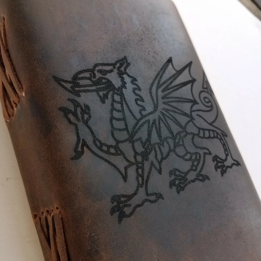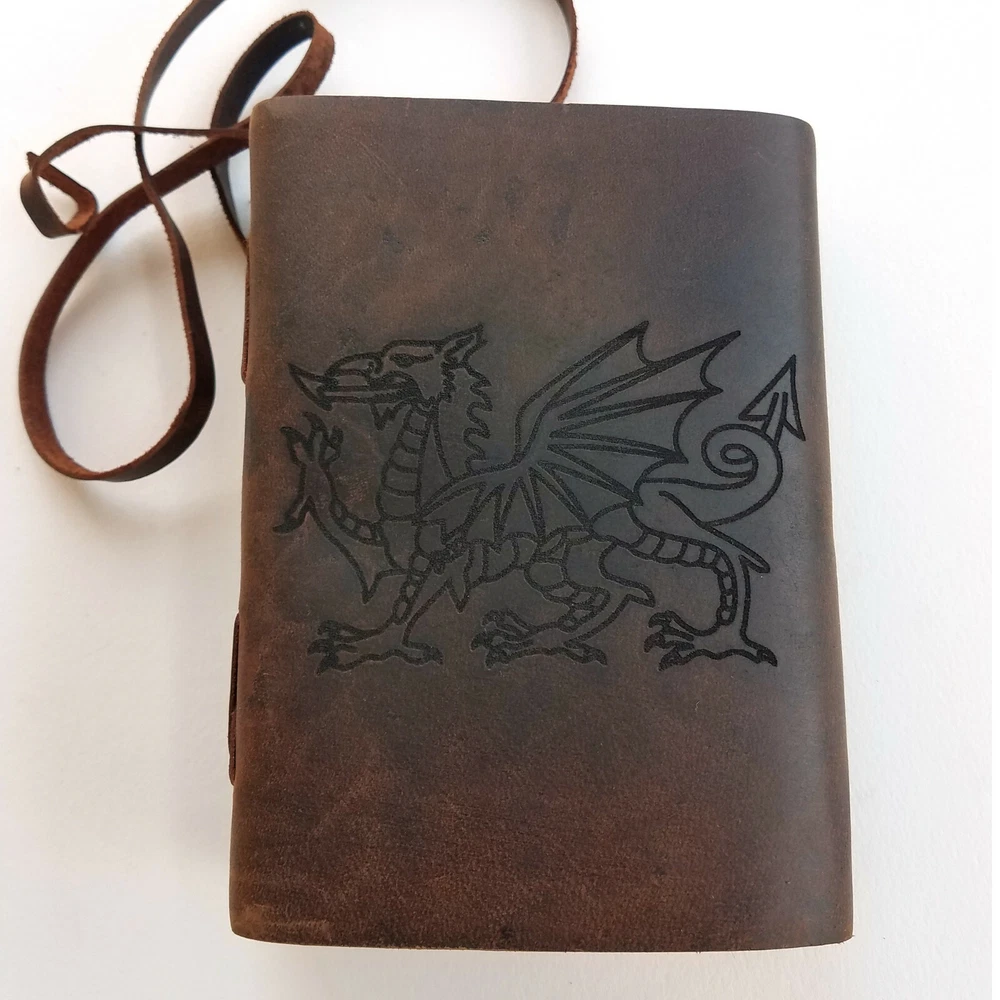 Sometimes all you need to set your creative brilliance free is the right journal. This handmade leather journal is laser engraved with the Welsh dragon design. This Ancient symbol is said to have first been used by Welsh kings after the Roman's occupational withdrawal around the early Fifth Century A.D. The Welsh Dragon first shows up in the historical written record as representing Wales in 829 A.D. and it's current form was adopted in 1959. It has claimed the title of longest national flag in existence. *Our journals are made with durable genuine buffalo leather *Created with beautifully textured handmade deckle edge paper. Free Engraved Personalization, to have your journal personalized please send us a message with your order and let us know the following. 1.) What you would like engraved with spelling, punctuation and capitalization as you would like them. 2.) Where you would like your journal engraved, above the design, below the design, or the front flap. Example: "John, above design" Dimensions: Overall: 5" x 7" x 1.24" leather thickness: 1 mm appox cord length: 29.5 Inches Page count: 120