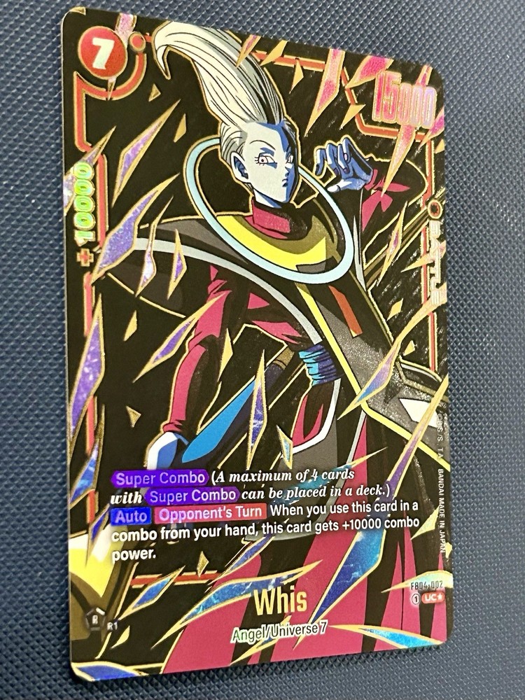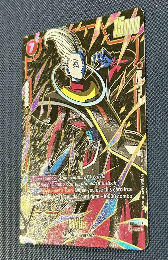 The Whis FB04-002 Alternate Art Dragon Ball Card Fusion World Ultra Limit is a highly sought-after collectible card from the Rivals Clash set. Produced by Bandai in 2024, this special edition card features the character Son Goku in a fusion form, with a unique Red and Yellow attribute color combination. The card showcases a Holo Foil finish and is part of the Dragon Ball Z: Super franchise. With exclusive features like Full Art, Limited Edition, and Promo, this card is a valuable addition to any collector's deck.