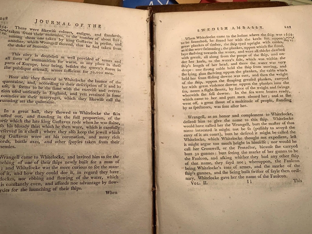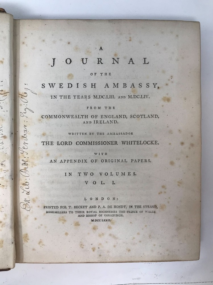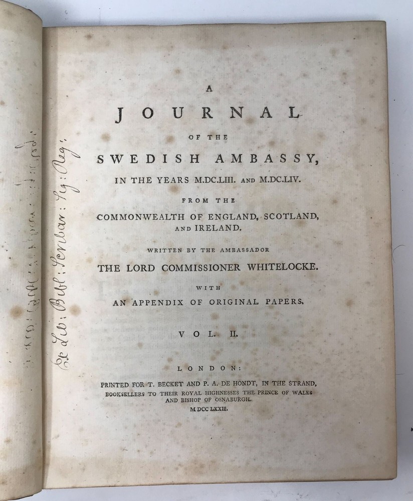 A JOURNAL OF THE SWEDISH AMBASSY IN THE YEARS MDCCLIII, AND MDCLIV. FROM THE COMMONWEALTH OF ENGLAND, SCOTLAND, AND IRELAND, WRITTEN BY THE AMBASSADOR THE LORD COMMISSIONER WHITELOCKE. WITH AN APPENDIX OF ORIGINAL PAPERS. (TWO VOLUMES, COMPLETE) Author: Whitelocke Bulstrode Title: A JOURNAL OF THE SWEDISH AMBASSY IN THE YEARS MDCCLIII, AND MDCLIV. FROM THE COMMONWEALTH OF ENGLAND, SCOTLAND, AND IRELAND, WRITTEN BY THE AMBASSADOR THE LORD COMMISSIONER WHITELOCKE. WITH AN APPENDIX OF ORIGINAL PAPERS. (TWO VOLUMES, COMPLETE) Publication: London: Printed for T. Beckett and P.A. De Hondt in the Strand, 1772 Edition: First Edition Description: Leather-bound. Two volumes, large quartos [11x9 inches] Full polished leather, red and black spine labels, five raised bands. Gilt seal of the Society of the Writers to the Signet on front and rear covers of each volume. Volume 1: front board detached but present. Spine worn at top and bottom, some chafing to raised bands, labels rubbed. Volume II: Outer front hinge cracked, corners show wear, spine has narrow crack along the full length. Binding sound. Boards to both volumes are fairly bright with scattered small stains and some areas of darkening. [24], 532+ 502 pages. Label and some ink musical notation to front pastedown to both volumes, Text clean, pages supple with some scattered foxing, mostly to prelims and title pages. Bindings tight. Includes the appendix to original papers. Good Only. Seller ID: 84050 Aardvark Rare Books Eugene, OR We work hard to make your Bookbuying Experience safe, easy and fun. Aardvark Books is a proud member of the ABAA (Antiquarian Booksellers Association of America) and IOBA, Independent Online Booksellers Association. Ezra is also an accredited and Qualified Appraiser of Books and Manuscripts, with a designation from the ASA (American Society of Appraisers), with considerable Archive experience as well. Shipping All books shipped to US destinations are sent via the US Postal Service. Faster shipping is available, please ask before paying. We will combine shipping on items purchased at the same time in order to help reduce costs. International shipping is also available. Please inquire for a shipping quote before ordering. This listing was created by Bibliopolis.