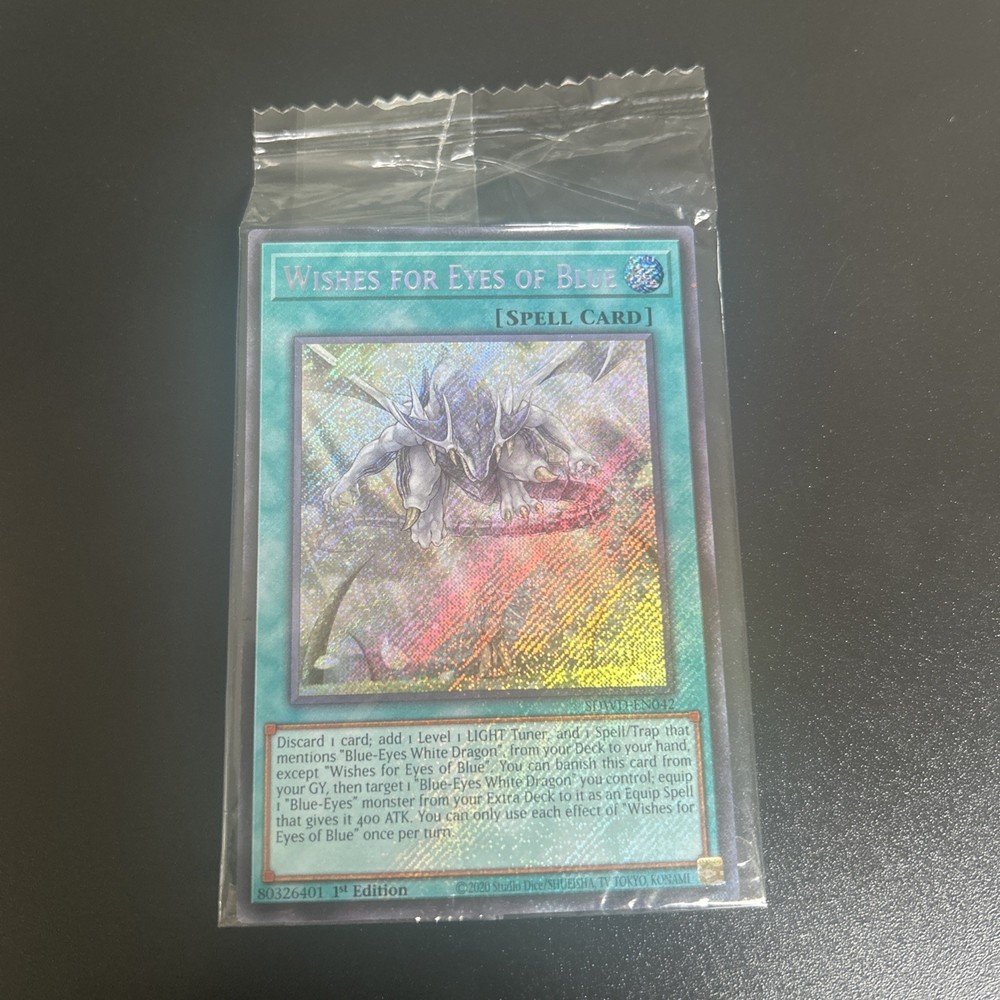 Elevate your Yu-Gi-Oh! TCG collection with the captivating "Wishes for Eyes of Blue" card from the Structure Deck: Blue-Eyes White Destiny set. This Quarter Century Secret Rare card, numbered SDWD-EN042, is a must-have for both serious collectors and seasoned duelists looking to enhance their gameplay with powerful Spell-Normal cards. Featuring the first edition release in English, this card comes straight from the hands of Konami, ensuring its authenticity and quality. The unique attribute of this card is its 'Spell' color, adding a strategic advantage to your deck when cast at the right moment. Add this gem to your collection and watch your opponents gaze in envy at the power of your 'Wishes for Eyes of Blue'.