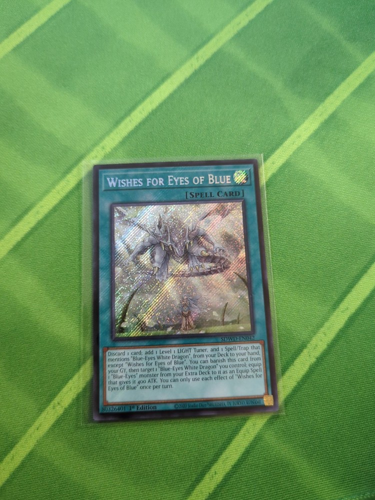 | Card Text | Discard 1 card; add 1 Level 1 LIGHT Tuner, and 1 Spell/Trap that mentions "Blue-Eyes White Dragon", from your Deck to your hand, except "Wishes for Eyes of Blue". You can banish this card from your GY, then target 1 "Blue-Eyes White Dragon" you control; equip 1 "Blue-Eyes" monster from your Extra Deck to it as an Equip Spell that gives it 400 ATK. You can only use each effect of "Wishes for Eyes of Blue" once per turn. |