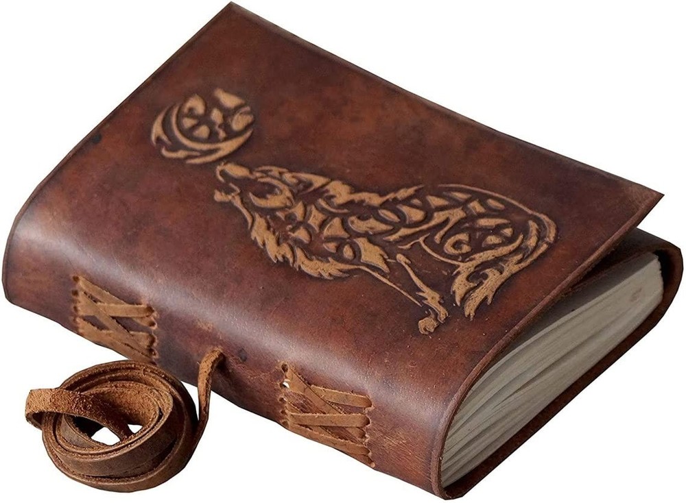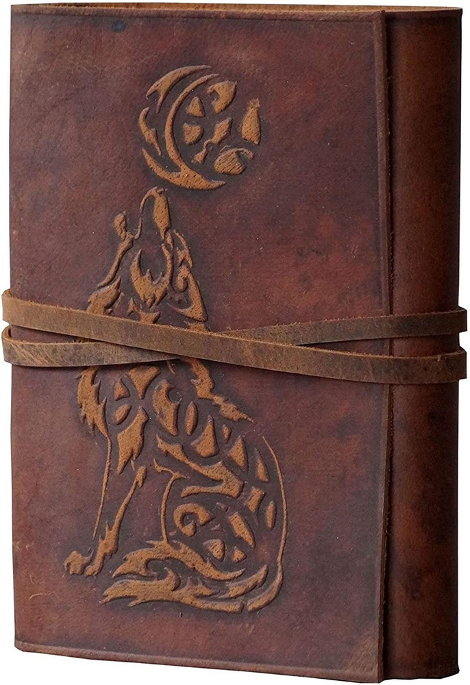 Wolf embossed handmade leather journal notebook is very beautifully embossed. Handmade journal features 120 handmade recycled cotton paper (240 pages both the sides). Beautiful diary has Coptic leather binding which secures the pages firmly. With embossed designs on front, our journal is a great tool for anyone wanting to record inspired thoughts, mystical moments, and potential rituals and recipes. Handmade in India, Sketchbook is great for keeping by the bedside to jot down dreams, or for use as a diary or journal. Notebook features leather bound closure to keep your secrets from prying eyes. Handcrafted journals contain acid free, handmade, archival Quality, linen - cotton parchment paper by a family owned company that has been in the handmade paper making business for almost 150 years. The book is approximately 7 inches tall, 5 inches wide, and 1.2 inches thick, and the pages are unlined. This brand new journal makes an ideal gift for that special someone or simply to keep for yourself. (Due to computer screen resolution color shades of product may slightly vary from images shown.) IDEAL SIZE - Handheld, medium size (7 x 5 x 1.2 inches). Easily carry this journal in your daily life and on your most exotic adventures GENUINE LEATHER CRAFTSMANSHIP - Crafted with genuine crazy horse leather texture, this leather journal offers a soft touch exterior with natural, distressed look that’s truly exclusive. UNIQUE GIFTS - Stunning gifts for men on Father’s Day, Graduation or the perfect gift for women on Mother’s Day, Valentine’s Day, Birthday’s or Anniversary. A True Art Treasure, this blank unlined notebook will become a Family Heirloom! LEATHER STRAP CLOSURE - Notebook features leather bound closure to keep your secrets from prying eyes. MANY USES - Can be used as a notepad, journal, writing notebook, sketch book. 1.25 inch thickness, easy for handwriting, drawing or sketching and compact for carrying in your bag. Ideal for alternative Artist Sketchbooks, Photo Album, Traveling Notes, Business Executive, Logbook, Poetry Work, Journalists, Food Planner, Instagram Scrapbook and Bible Journaling.