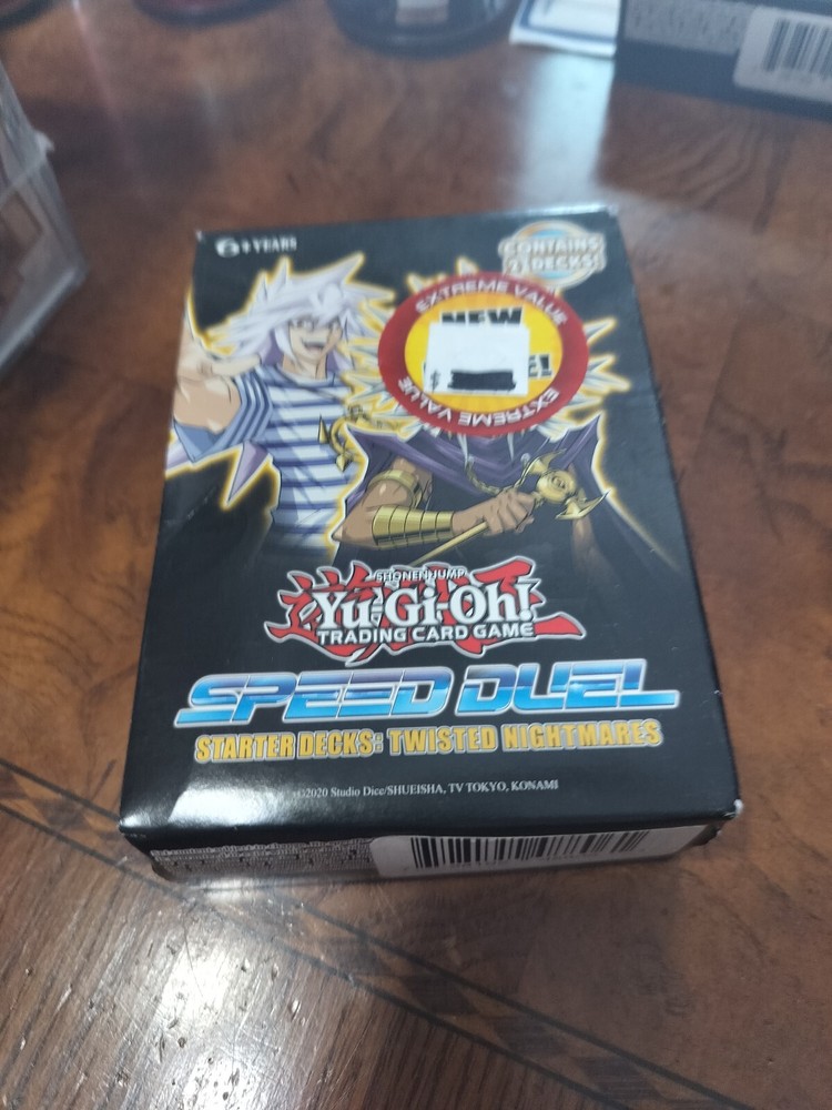 Dive into the strategic world of Yu-Gi-Oh! TCG with the Speed Duel: Twisted Nightmares starter deck. This factory-sealed, 1st edition set offers a premium playing experience for duelists aged 6 and up. The deck comes in English and adheres to the standard card size, ensuring compatibility with your existing collection.Crafted by Konami, the respected manufacturer in the trading card game industry, this set is produced in the United States, using high-quality card stock. Whether you're a seasoned player or just starting, the Speed Duel: Twisted Nightmares deck provides an engaging structure to enhance your gameplay and bring new strategies to the table. New in Box.