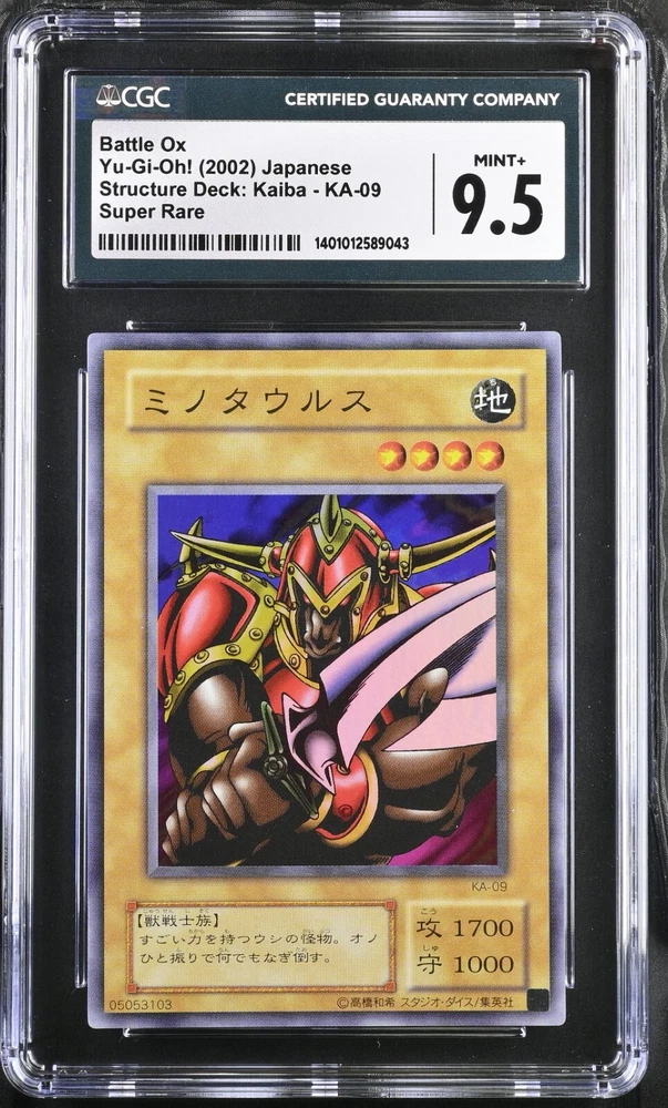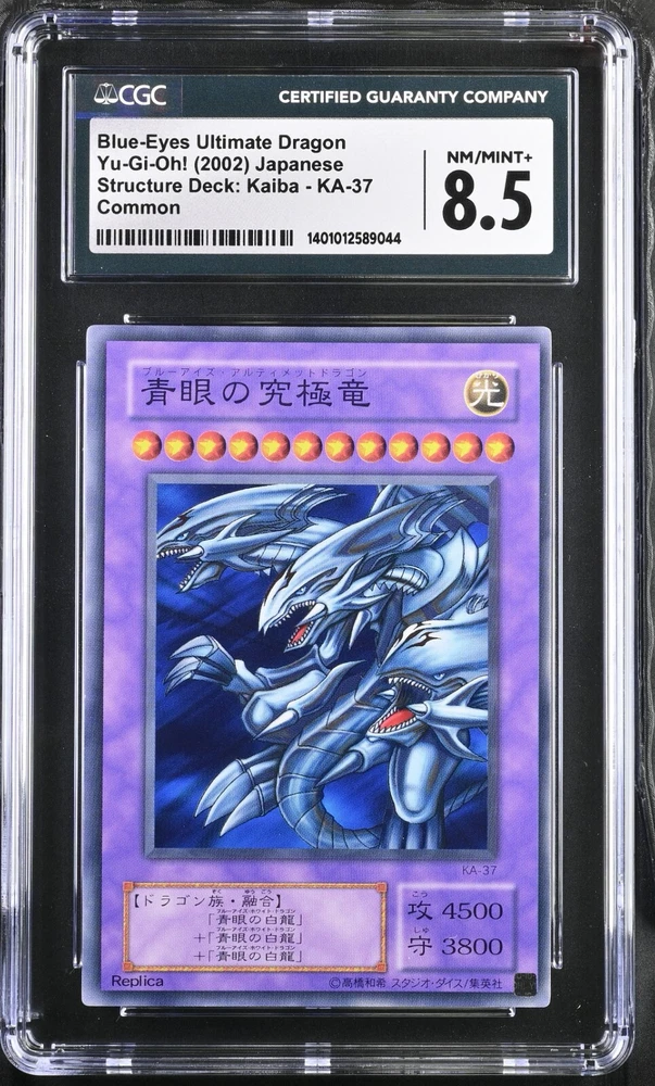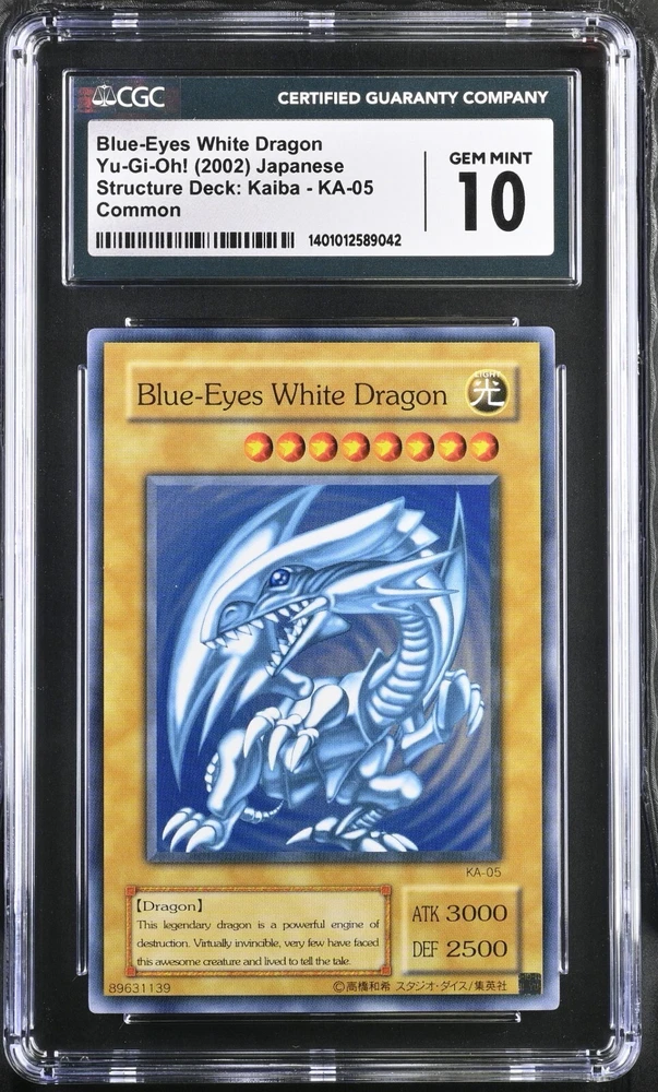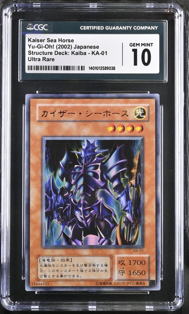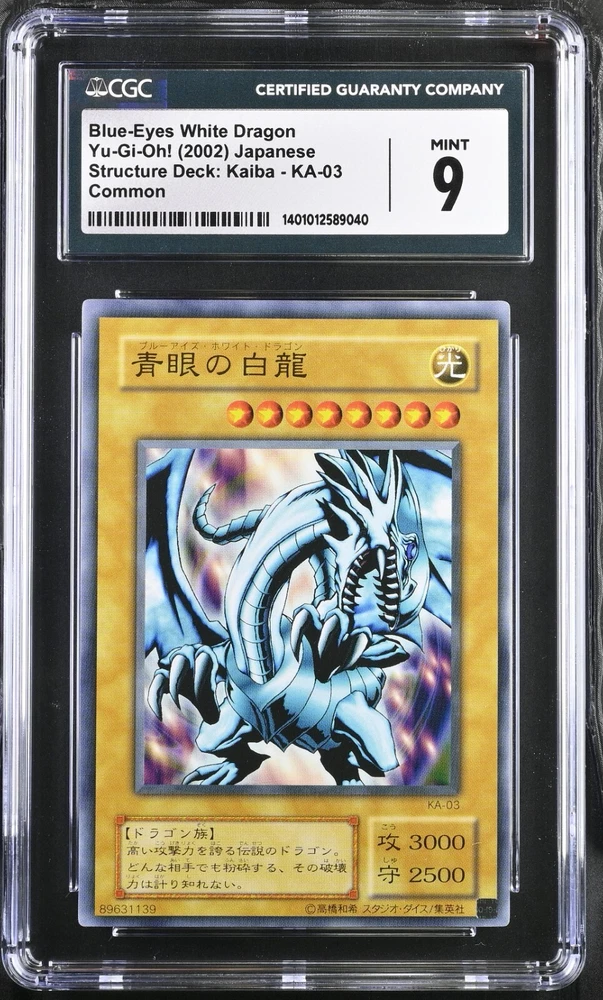 YUGIOH! 2002 Structure Deck Kaiba Complete with 7 Graded cards Unplayed deck, sleeved as soon as it was open, but never used. Every cards from the Structure deck is included and is in NM/M condition. KA-01 (CGC 10) - Kaiser Sea Horse KA-02 (CGC 9) - Vampire Lord KA-03 (CGC 9) - Blue-Eyes White Dragon KA-04 (CGC 9.5) - Blue-Eyes White Dragon KA-05 (CGC 10) - Blue-Eyes White Dragon KA-09 (CGC 9.5) - Battle Ox KA-37 (CGC 8.5) - Blue-Eyes Ultimate Dragon