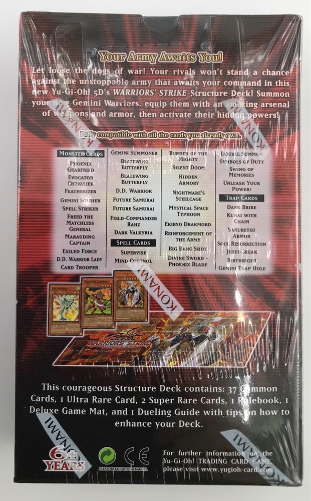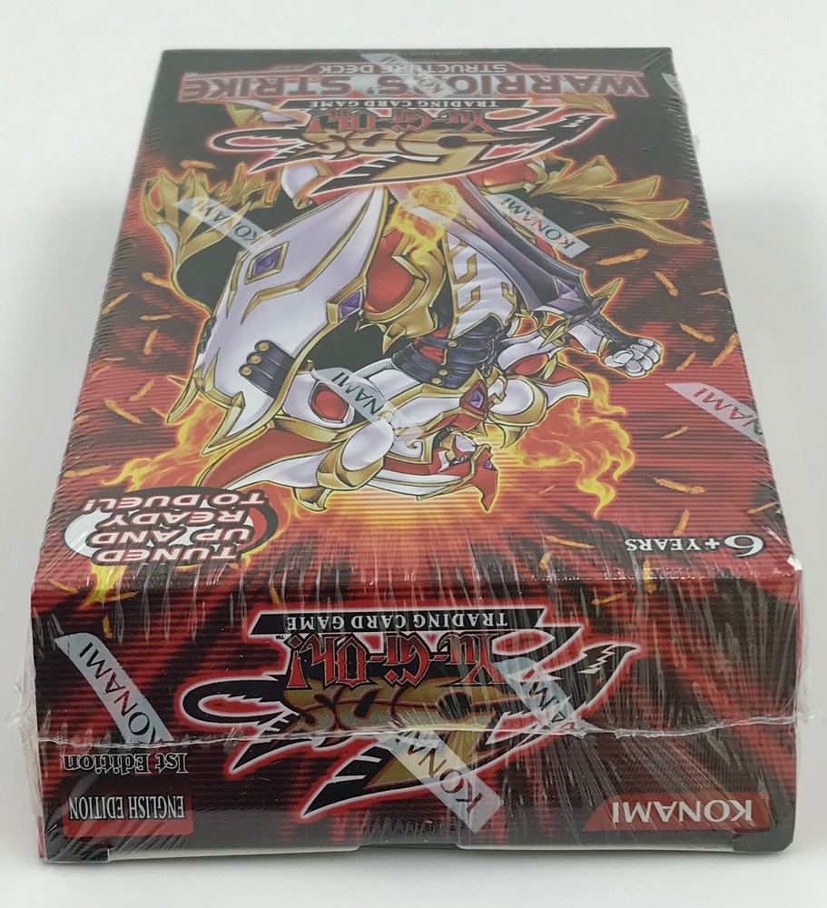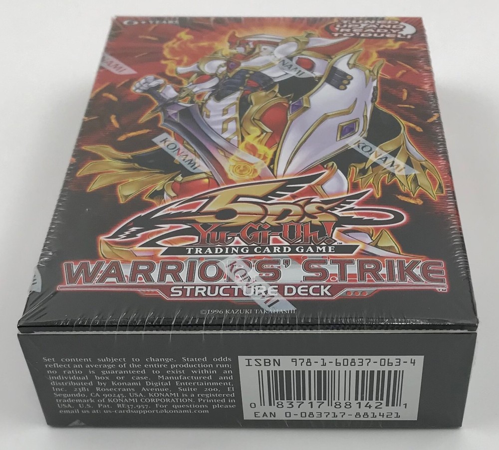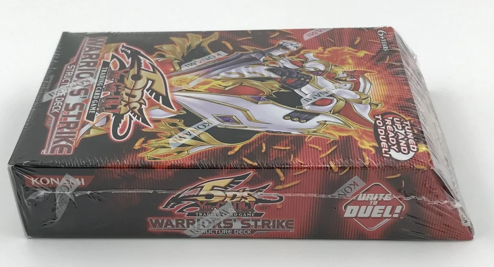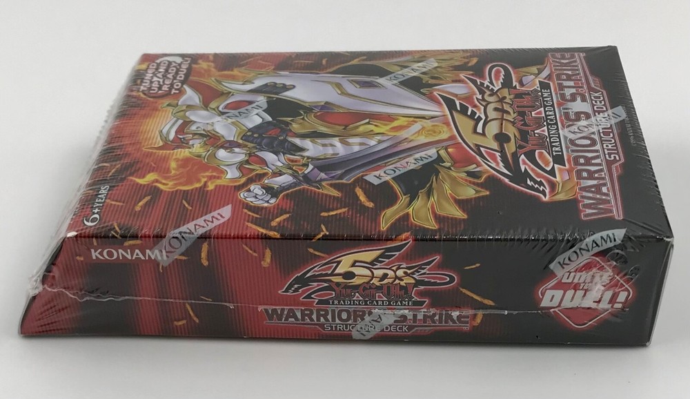 BRAND NEW IN ORIGINAL FACTORY SEALED PACKAGING YU-GI-OH! 5Ds WARRIORS’ STRIKE STRUCTURE DECK KONAMI ENGLISH - 1ST EDITION The Structure Deck Contains: 37 Common Cards, 1 Ultra Rare Card, 2 Super Rare Cards, 1 Rulebook, 1 Deluxe Game Mat, and 1 Dueling Guide.