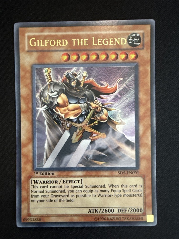 The product is a Yu-Gi-Oh! Trading Card Game card featuring the character Joey Wheeler from the Structure Deck Warriors Triumph set. The card is an Ultra Rare 1st Edition Gilford the Legend with the attribute Earth, a defense/toughness of 2000, and an attack/power of 2600. Manufactured by Konami in 1996, the English-language card is an Effect card with a Holo finish, making it a valuable addition to any collector's deck. With its Warrior creature type and unique attributes, this card is sure to be a prized possession for any Yu-Gi-Oh! fan.