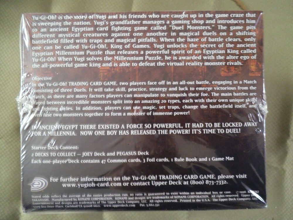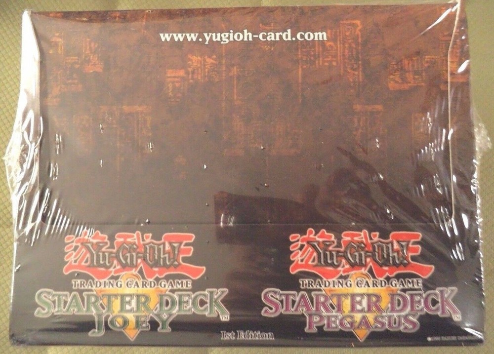 NO INTERNATIONAL SALE This Yu-Gi-Oh! item contains 10 sealed decks, each with 50 cards made of durable card stock. The Joey and Pegasus decks are a vintage 1st edition set manufactured by Upper Deck in 1996. The item is recommended for boys and girls aged 8+ and features characters from the Yu-Gi-Oh! fantasy genre. The cards are in new condition, still factory-sealed in the original box. The item is perfect for collectors of CCG sealed packs and collectible card games.