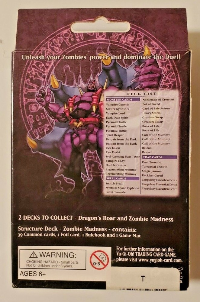 ULTRA RARE! Yu-Gi-Oh! Trading Card Game Structure Deck ZOMBIE MADNESS contains: 39 Common Cards 1 Foil Card 1 Beginner's Guide 1 Game Mat BRAND NEW FACTORY-SEALED **Never Opened** This item has been kept safe, out of the sunlight, and in a smoke-free and pet-free home. This is an extremely RARE item! It is nearly impossible to find a brand new, unopened one. Get this BRAND NEW theme deck still in its original factory-sealed packaging while you still can! There are only so many new ones left, and then they're gone forever!