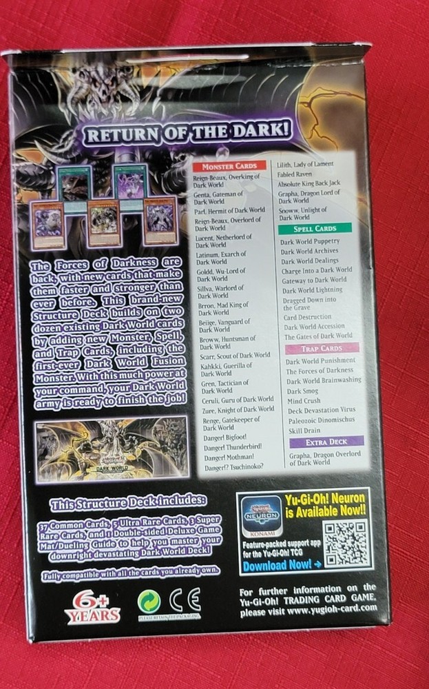 Absolutely thrilled with this purchase! The decks arrived perfectly sealed and in pristine condition, just as described. The Dark World cards are fantastic for both casual play and competitive builds—great value for three full structure decks. Seller was super responsive and helpful too. Highly recommend for Yu-Gi-Oh! fans looking to expand their collection!