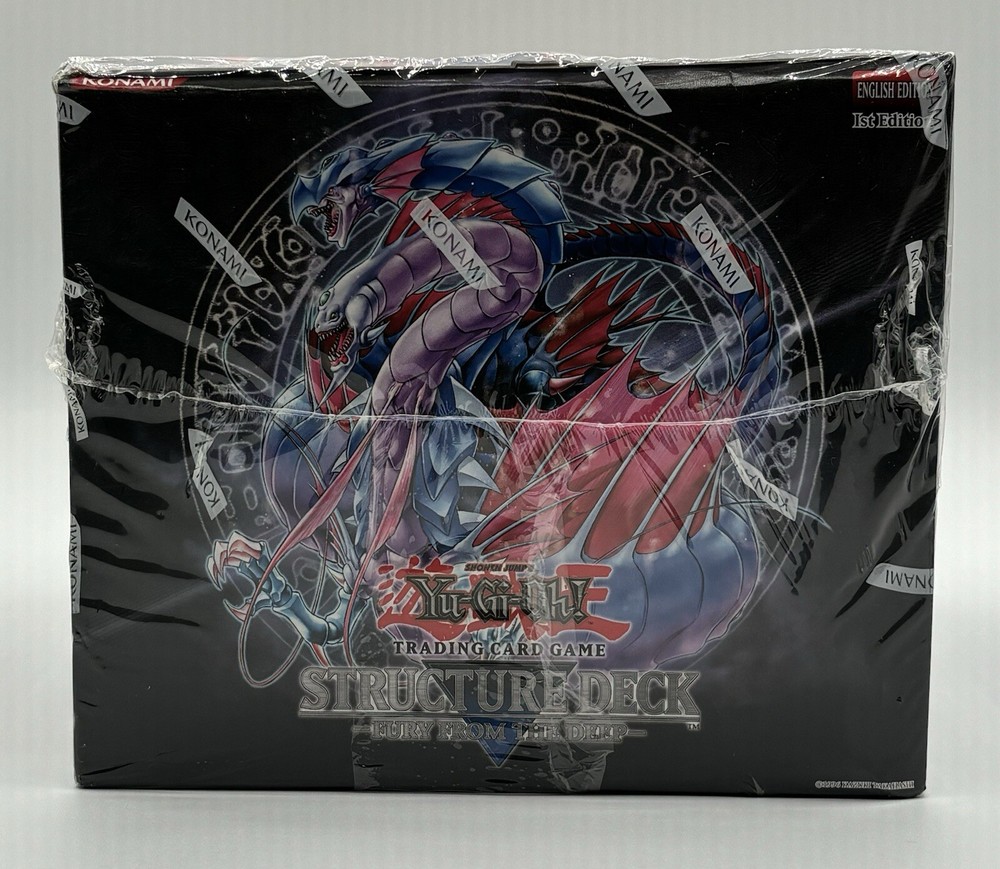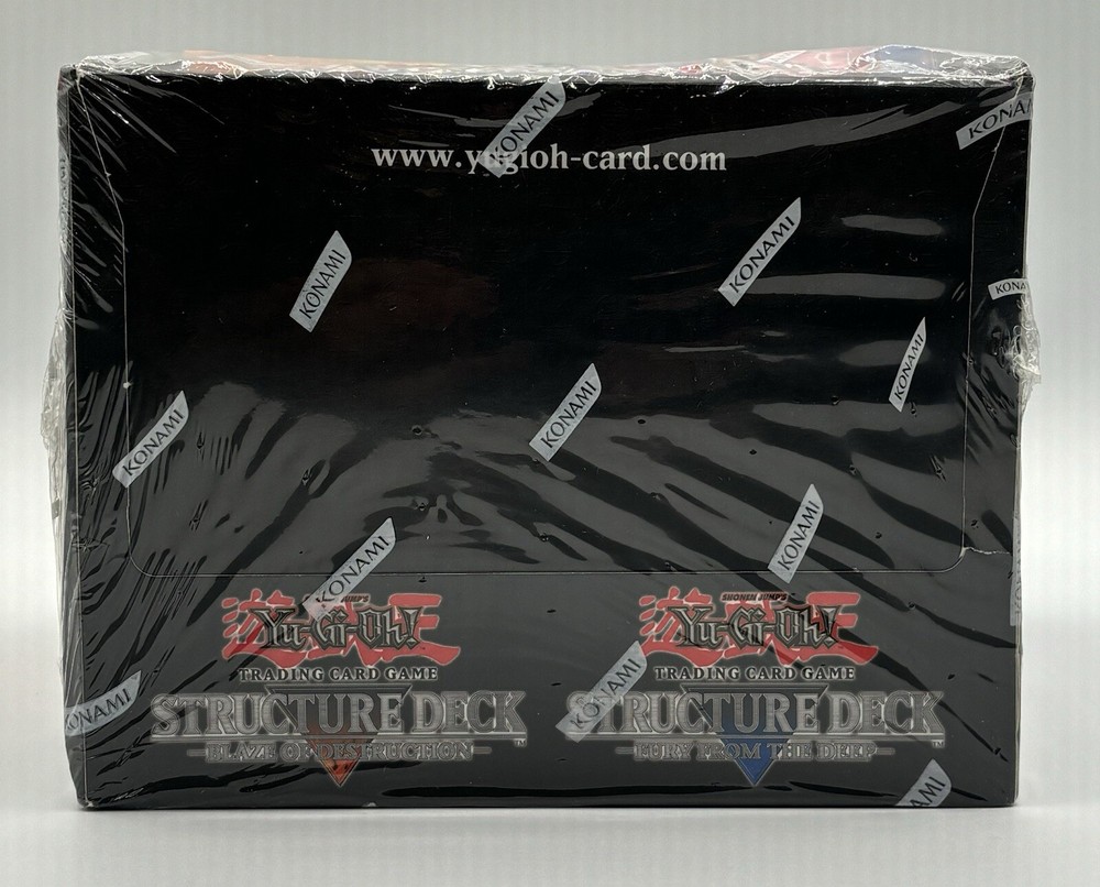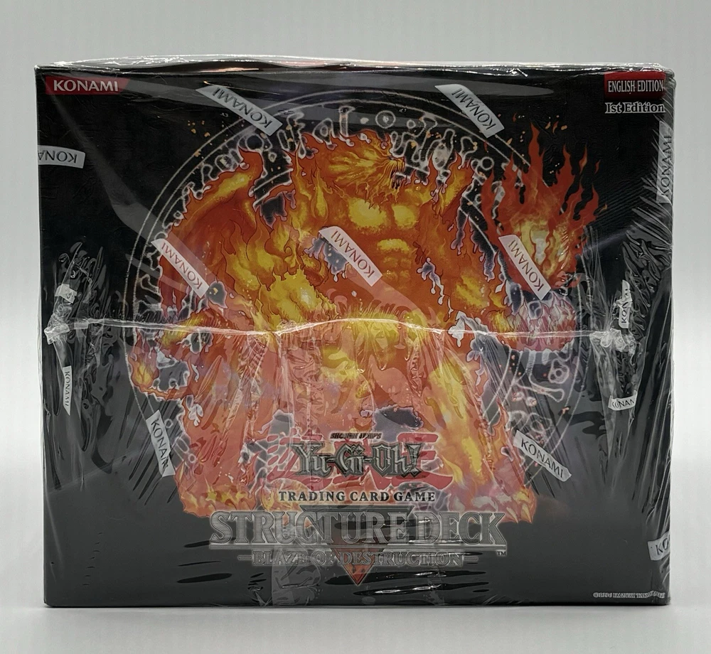 This is a sealed box of Yu-Gi-Oh! Blaze Destruction Fury Deep 1st Edition Structure Deck, made by Upper Deck Entertainment. The box includes booster packs and features English language cards. The set is part of the 1st Edition series and includes characters from the popular Yu-Gi-Oh! TCG game. The box is ideal for collectors and players alike, and is a must-have for any fan of the game.