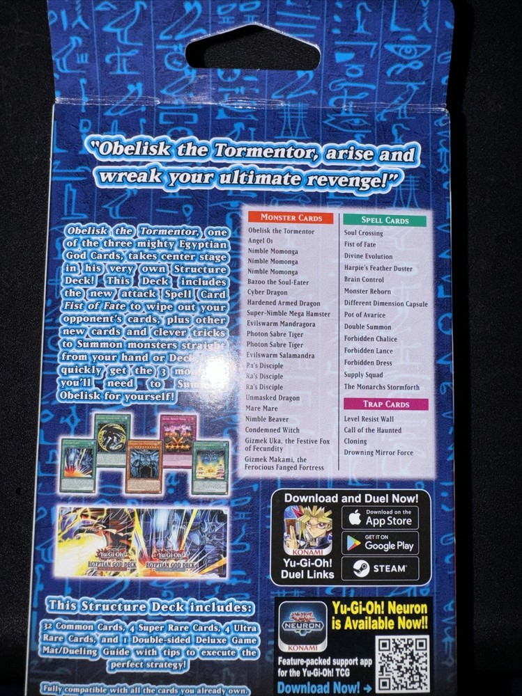 This Yu-Gi-Oh! TCG Egyptian God Structure Deck features the powerful OBELISK THE TORMENTOR card, still sealed in its original packaging. Created by Konami, this deck is perfect for collectors and players alike. With its Features including a Structure Deck, this item is a must-have for any Yu-Gi-Oh! enthusiast. The set is categorized under Toys & Hobbies as well as Collectible Card Games, specifically CCG Sealed Decks & Kits. Get your hands on this rare find today!