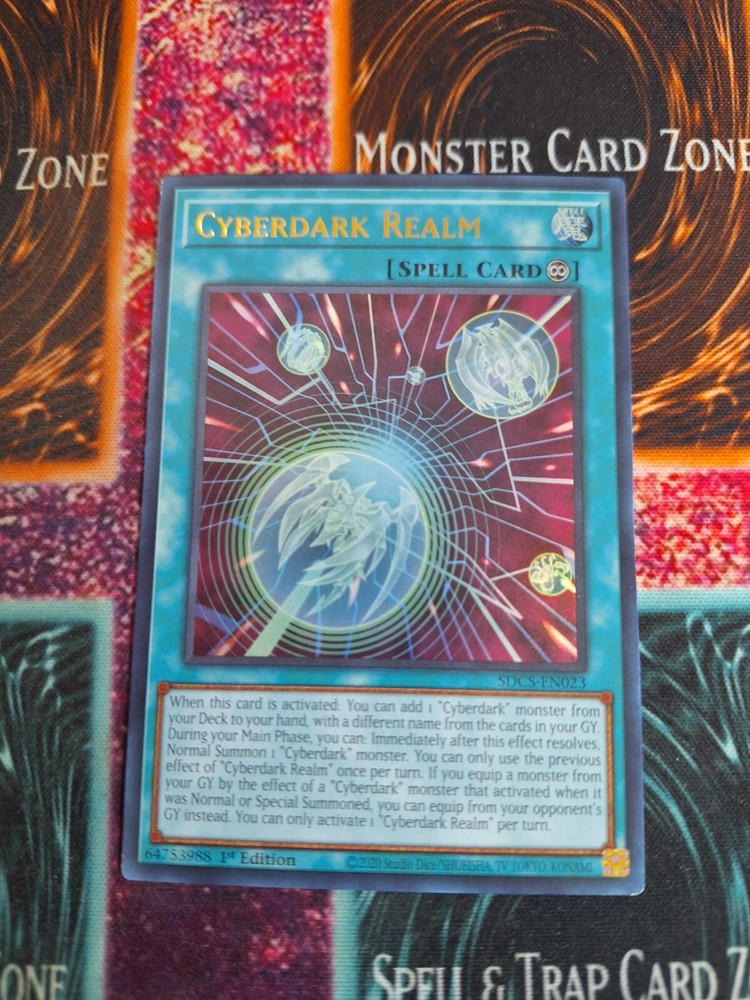 | Card Text | When this card is activated: You can add 1 "Cyberdark" monster from your Deck to your hand, with a different name from the cards in your GY. During your Main Phase, you can: Immediately after this effect resolves, Normal Summon 1 "Cyberdark" monster. You can only use the previous effect of "Cyberdark Realm" once per turn. If you equip a monster from your GY by the effect of a "Cyberdark" monster that activated when it was Normal or Special Summoned, you can equip from your opponent's GY instead. You can only activate 1 "Cyberdark Realm" per turn. |