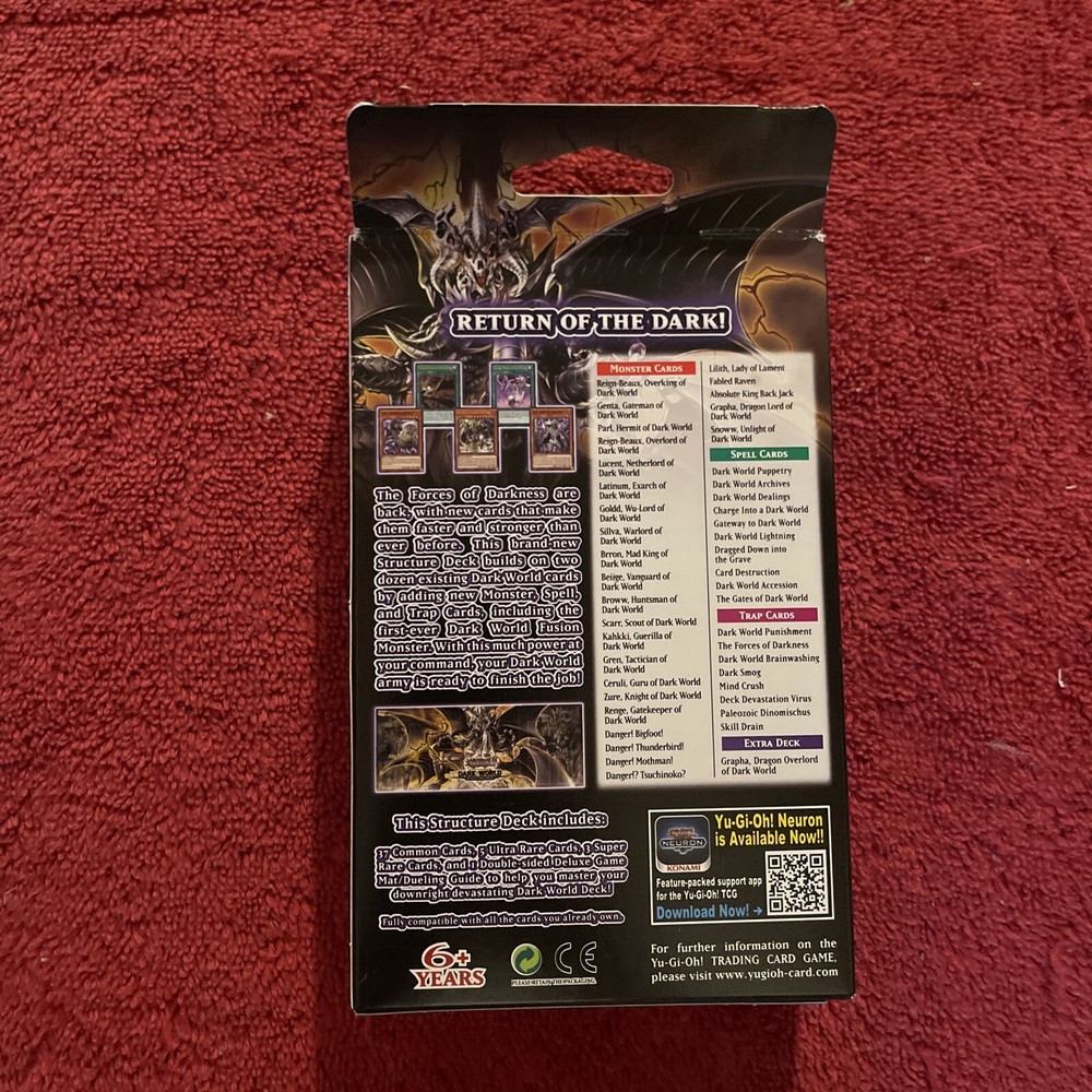 This Yu-Gi-Oh! Dark World Structure Deck 1st Edition is a must-have for any collector or player of the game. With its unique features and configuration, this pack is sure to provide hours of entertainment and strategic gameplay. The cards are from the Yu-Gi-Oh! game and feature characters and artifacts from the Dark World universe. The pack is part of the Yu-Gi-Oh! Structure Decks series and is specifically designed for those who enjoy Collectible Card Games. The cards are sealed and come in a pack configuration, making it an ideal gift or addition to any collection. Get your hands on this exclusive pack and explore the world of Yu-Gi-Oh! like never before.