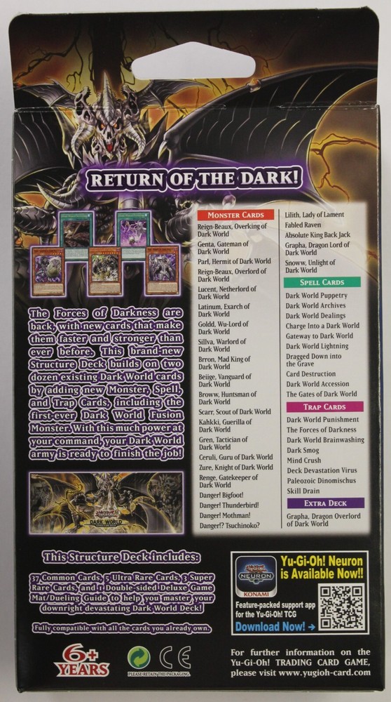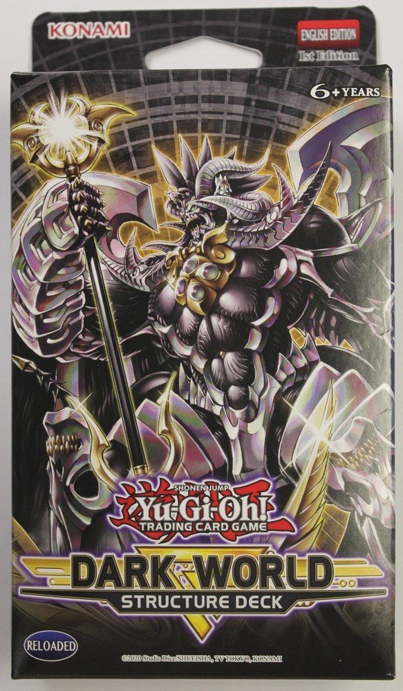 What is for purchase is a sealed Yugioh Dark World Structure Deck. The item is sealed in new condition. Included are: 37 Common Cards 5 Ultra Rare Cards 3 Super Rae Cards 1 Double-Sided Deluxe Game Ma...