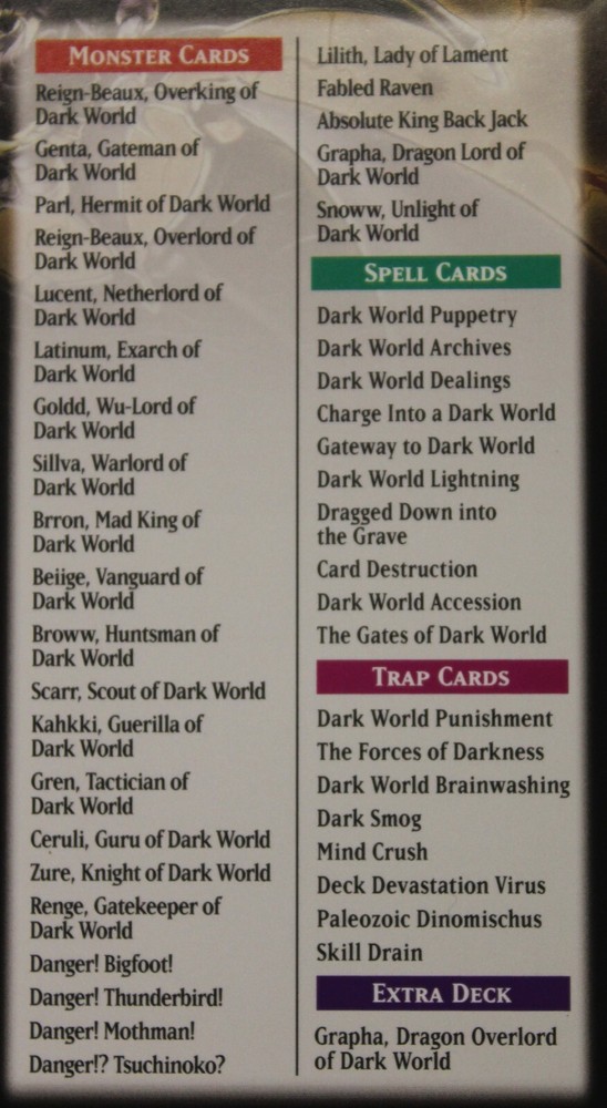 What is for purchase is a sealed Yugioh Dark World Structure Deck. The item is sealed in new condition. Included are: 37 Common Cards 5 Ultra Rare Cards 3 Super Rae Cards 1 Double-Sided Deluxe Game Mat/ Dueling Guide