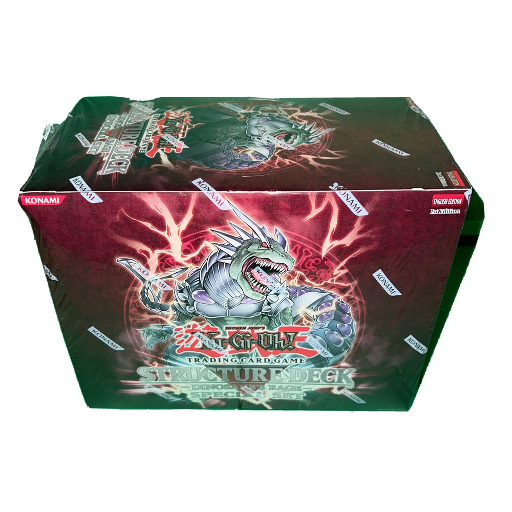 YuGiOh Dinosaurs Rage Special Set 1st Edition Display Structure Decks Sealed. Box contains 8 Structure Decks. Each Structure Deck: Dinosaur's Rage contains: • 1 Preconstructed Deck of 40 cards • 1 Ultra Rare • 39 Commons • 1 Rulebook • 1 Dueling Guide • 1 Playmat